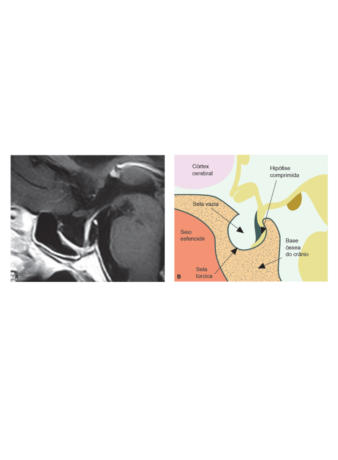 Apoplexia hipofisária A apoplexia hipofisária (AH) é um distúrbio grave e potencialmente fatal. Resulta de destruição abrupta do tecido hipofisário, devido a infarto agudo ou hemorragia da glândula. Em geral, está associada à presença de tumores hipofisários (dos quais, muitas vezes, pode ser a manifestação inicial) (Figura 4.3), sobretudo macroadenomas, ou decorre de seu tratamento (p. ex., pós-radioterapia ou após o uso de medicamentos, como agonistas dopaminérgicos ou análogos da somatostatina).1,42,54,55 Contudo, pode acontecer espontaneamente em uma glândula normal, após hemorragia obstétrica (síndrome de Sheehan), em síndromes de hipertensão intracraniana ou como complicação de anticoagulação sistêmica. Outros fatores precipitantes incluem hipertensão arterial, diabetes melito, gravidez, angiografia das carótidas, cirurgia de bypass das coronárias, testes de estímulo com CRH ou TRH, ventilação mecânica e TCE.54,55 Existem raros relatos de AH em pacientes com hipofisite linfocítica (HL), metástases hipofisárias, craniofaringioma ou tuberculoma selar.54,56 A apresentação clínica da AH é variável e consiste em sinais e sintomas neurológicos e endocrinológicos. A cefaleia é a queixa mais frequente, seguida de déficits visuais, paralisia de nervos cranianos, náuseas e vômitos.56 Menos comuns são os sintomas de rebaixamento do nível de consciência, e são mais raros ainda os sinais meníngeos, o que pode confundir com hemorragia subaracnóidea aneurismática.57 Hipopituitarismo ocorre em cerca de 80% dos casos: deficiência de ACTH, em até 80%; de TSH, em 50%; e de gonadotrofinas, em 75% dos casos.54 A AH pode ser acompanhada por diabetes insípido (em 3 a 23% dos casos) ou, bem mais raramente, da secreção inadequada do hormônio antidiurético.54,55 Figura 4.2 Corte sagital de ressonância magnética que mostra sela vazia (SV), situação em que a sela túrcica é preenchida por líquido cerebrospinal. A. A glândula aparece afilada e comprimida contra o assoalho ósseo. B. Ilustração correspondente da SV. file:///C|/Users/AnaMilk/Desktop/Text/chapter04.html#ch4fig3 file:///C|/Users/AnaMilk/Desktop/Vilar/Endocrinologia%20Cl%EDnica,%20Sexta%20edi%E7%E3o%20(119).html#bib1 file:///C|/Users/AnaMilk/Desktop/Vilar/Endocrinologia%20Cl%EDnica,%20Sexta%20edi%E7%E3o%20(119).html#bib42 file:///C|/Users/AnaMilk/Desktop/Vilar/Endocrinologia%20Cl%EDnica,%20Sexta%20edi%E7%E3o%20(119).html#bib54 file:///C|/Users/AnaMilk/Desktop/Vilar/Endocrinologia%20Cl%EDnica,%20Sexta%20edi%E7%E3o%20(119).html#bib55 file:///C|/Users/AnaMilk/Desktop/Vilar/Endocrinologia%20Cl%EDnica,%20Sexta%20edi%E7%E3o%20(119).html#bib54 file:///C|/Users/AnaMilk/Desktop/Vilar/Endocrinologia%20Cl%EDnica,%20Sexta%20edi%E7%E3o%20(119).html#bib55 file:///C|/Users/AnaMilk/Desktop/Vilar/Endocrinologia%20Cl%EDnica,%20Sexta%20edi%E7%E3o%20(119).html#bib54 file:///C|/Users/AnaMilk/Desktop/Vilar/Endocrinologia%20Cl%EDnica,%20Sexta%20edi%E7%E3o%20(119).html#bib56 file:///C|/Users/AnaMilk/Desktop/Vilar/Endocrinologia%20Cl%EDnica,%20Sexta%20edi%E7%E3o%20(119).html#bib56 file:///C|/Users/AnaMilk/Desktop/Vilar/Endocrinologia%20Cl%EDnica,%20Sexta%20edi%E7%E3o%20(119).html#bib57 file:///C|/Users/AnaMilk/Desktop/Vilar/Endocrinologia%20Cl%EDnica,%20Sexta%20edi%E7%E3o%20(119).html#bib54 file:///C|/Users/AnaMilk/Desktop/Vilar/Endocrinologia%20Cl%EDnica,%20Sexta%20edi%E7%E3o%20(119).html#bib54 file:///C|/Users/AnaMilk/Desktop/Vilar/Endocrinologia%20Cl%EDnica,%20Sexta%20edi%E7%E3o%20(119).html#bib55 Endocrinologia Clinica - Vilar 6 edicao