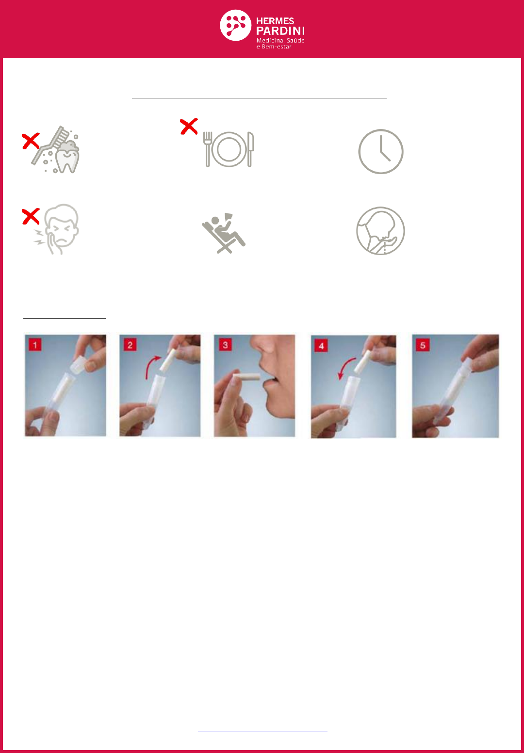 ORIENTAÇÕES PARA COLETA DO CORTISOL SALIVAR COMO COLETAR? *Se preferir, pode mastigar levemente o algodão, pois o processo pode ajudar a encharcá-lo com saliva. Durante esse período de coleta não é permitido ingestão de agua, alimento ou qualquer tipo de líquido. **Atenção: O algodão precisa estar muito encharcado para que se consiga volume adequado. Volume Recomendável: 0,6 mL. Volume Mínimo: 0,4 mL. O tubo pode ser encaminhado imediatamente ao laboratório sem refrigeração da amostra. No entanto, em casos onde o transporte não seja imediato, aconselha-se a refrigeração da amostra entre 2° e 8° C. A amostra refrigerada poderá ser recebida no laboratório com até 48h da coleta. Questionário - Informar medicamentos em uso (inclusive pomadas e cremes), dia e hora da última dose, e horário da coleta. - Se mulher, informar se está grávida ou em uso de contraceptivo oral. www.hermespardini.com.br IMP.COL.0073/01 Página 1 de 1 O horário de coleta será determinado pelo seu médico. Antes da coleta é aconselhável lavar a boca com água através de bochechos leves. Não beber ou comer 30 min. antes da coleta (água é permitido). A coleta deve ocorrer em local calmo. Deve-se evitar estresse próximo ao momento da coleta. Evitar escovar os dentes pelo menos 2hs antes da coleta. Não é recomendável coleta em caso de lesões orais com sangramento ativo. Remova a tampa superior do tubo Retire o algodão do tubo. Coloque debaixo da língua por 3 min. Coletar o máximo de saliva possível. Mastigue se desejar. Retorne o algodão para o interior do recipiente. Feche o tubo com a tampa logo a seguir. http://www.hermespardini.com.br/