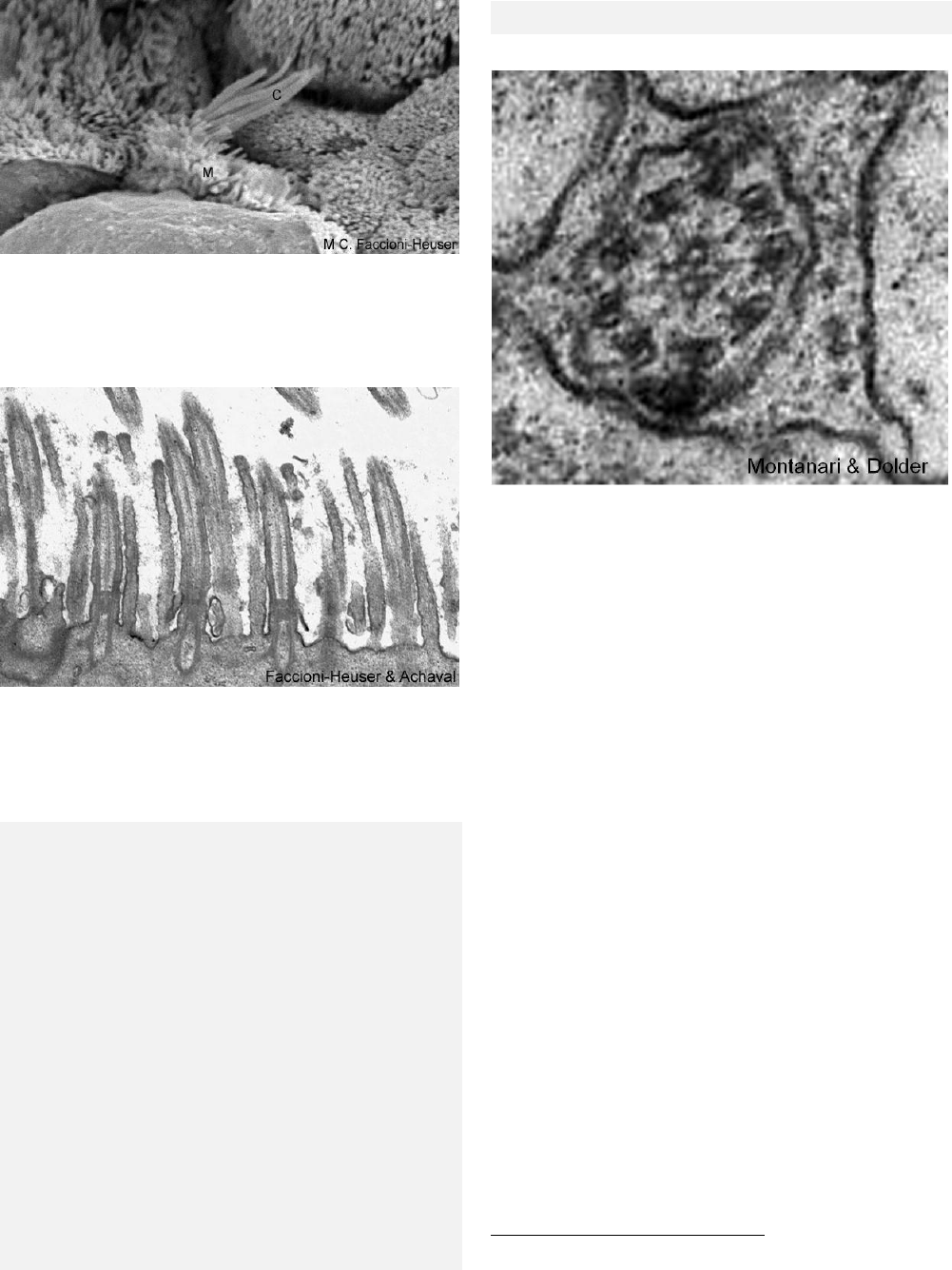 HISTOLOGIA 33 Figura 2.9 - Eletromicrografia de um tufo de cílios (C) e microvilos (M), permitindo comparar o seu tamanho. 9.500x. Cortesia de Maria Cristina Faccioni-Heuser, UFRGS. Figura 2.10 - Eletromicrografia de transmissão de cílios, mostrando a estrutura interna de microtúbulos. 23.111x. Cortesia de Maria Cristina Faccioni-Heuser e Matilde Achaval Elena, UFRGS. O axonema (Figura 2.11) consiste em nove pares periféricos e em um par central de microtúbulos. Os microtúbulos de cada dupla periférica são adjacentes e um deles compartilha uma porção da parede com o outro. O microtúbulo completo, com 13 protofilamentos, é o microtúbulo A, e o microtúbulo com 10 protofilamentos é o B. Filamentos radiais projetam-se da subunidade A em direção à bainha central que circunda o par central. Projetando-se aos pares, ao longo dos microtúbulos A e em direção aos microtúbulos B das duplas vizinhas, há as proteínas motoras dineínas. Com a ligação de ATP, as dineínas interagem com os microtúbulos B e, com a hidrólise do ATP, elas se deslocam ao longo desses microtúbulos em direção à base do cílio. Como os microtúbulos estão fixos em suas posições pelas proteínas associadas, entre elas, a nexina, que liga as duplas vizinhas, os microtúbulos A não podem deslizar com esse movimento, e as duplas dobram-se, curvando o cílio. Quando os braços da dineína se soltam da subunidade B, o cílio retorna à posição retilínea, promovendo o movimento de partículas na superfície. 42,43 Figura 2.11 - Corte transversal do axonema. 187.500x. Há células que possuem um único cílio: o cílio primário ou monocílio. Ele tem 250nm de diâmetro e 2 a 3µm de comprimento e exibe um arranjo de microtúbulos 9+0. É imóvel, curvando-se passivamente sob um fluxo de líquido. Serve como antena sensorial, captando estímulos mecânicos, químicos, osmóticos ou luminosos. É encontrado nas células pilosas do aparelho vestibular na orelha interna, nas células dos túbulos renais e nas células da rede testicular. 44 A formação dos cílios envolve a montagem de novo ou a duplicação dos centríolos e a sua migração próximo à superfície apical da célula, onde originam os corpúsculos basais (arranjo de microtúbulos semelhante ao do centríolo: 9+0), os quais derivam os axonemas pela polimerização de tubulinas. Os cílios são montados durante a fase G1 e desmontados antes da fase M. 45 5.6 Flagelo Possui estrutura semelhante à do cílio, mas é mais longo (cerca de 55 m) e único na célula. Ocorre no 42 DE ROBERTIS, E. M. F.; HIB, J. De Robertis Bases da Biologia celular e molecular. 3.ed. Rio de Janeiro: Guanabara Koogan, 2001. pp. 82-83. 43 GARTNER & HIATT. Op. cit., pp. 94-95. 44 ROSS & PAWLINA. Op. cit., pp. 118, 121, 124-125. 45 Ibid. pp. 70, 72, 74, 76-77. TATIANA MONTANARI 34 espermatozoide, sendo responsável pela sua motilidade (Figura 2.12). 46 Figura 2.12 - Fotomicrografia de espermatozoide humano. Giemsa. Objetiva de 100x (1.716x). A síndrome dos cílios imóveis (ou síndrome de Kartagener, em homenagem ao médico suíço Manes Kartagener) é uma doença autossômica recessiva, onde as dineínas não são sintetizadas normalmente, o que impede o batimento dos cílios e dos flagelos. As pessoas afetadas são suscetíveis a infeções pulmonares, devido à estagnação do muco. Os homens com essa síndrome são estéreis, já que os espermatozoides são imóveis. 47,48 6 CLASSIFICAÇÃO Os epitélios são classificados, segundo a sua função, em epitélio de revestimento e epitélio glandular. O epitélio sensorial e o epitélio germinativo podem ser considerados epitélios de revestimento ou classificados como epitélio especial. 49,50 Nem sempre se pode fazer uma distinção clara entre epitélio de revestimento e epitélio glandular. Por exemplo, o epitélio de revestimento do estômago é constituído somente por células secretoras de muco. 51 6.1 Epitélio de revestimento A justaposição das células epiteliais permite a formação de camadas celulares contínuas que revestem superfícies, como a superfície externa do 46 GENESER. Op. cit., p. 140. 47 Ibid. p. 139. 48 LOWE & ANDERSON. Op. cit., p. 46. 49 DYM, M. O sistema reprodutor masculino. In: WEISS, L.; GREEP, R. O. Histologia. 4.ed. Rio de Janeiro: Guanabara Koogan, 1981. p. 828. 50 HAY. Op. cit., p. 93. 51 JUNQUEIRA & CARNEIRO. Op. cit., pp. 73, 288. corpo, a superfície dos órgãos, das cavidades, dos vasos ou dos ductos. 52 O epitélio de revestimento é classificado segundo a forma das células e o número de camadas celulares. 53 A morfologia da célula está relacionada à sua função e é determinada por fatores extrínsecos e intrínsecos, como, por exemplo, pressões externas, organização do citoesqueleto, quantidade de citoplasma e de organelas e acúmulo de produtos de reserva ou secreção. 54 Quando a largura e o comprimento da célula são maiores que a altura, a célula é dita pavimentosa. Quando a altura é igual à largura e ao comprimento, ela é denominada cúbica. Quando a altura é maior que a largura e o comprimento, a célula é colunar, cilíndrica ou prismática (Figuras 2.1 e 2.3). 55 As células pavimentosas facilitam a passagem de substâncias como ocorre com as células dos vasos sanguíneos (endotélio). As células cúbicas e as células colunares têm a altura aumentada pela presença de um maior número de organelas para exercer atividade de secreção, de absorção ou de transporte de íons. 56 Como frequentemente não se veem os limites das células (a membrana plasmática é muito fina e não é visível ao microscópio de luz), pode-se ter uma ideia da forma da célula pelo núcleo, porque seu maior eixo é geralmente paralelo ao eixo longitudinal da célula. 57,58 Isso não é válido para células que retêm seus produtos de secreção, porque o núcleo fica comprimido por essas substâncias. 59 É o caso da célula caliciforme, que sintetiza