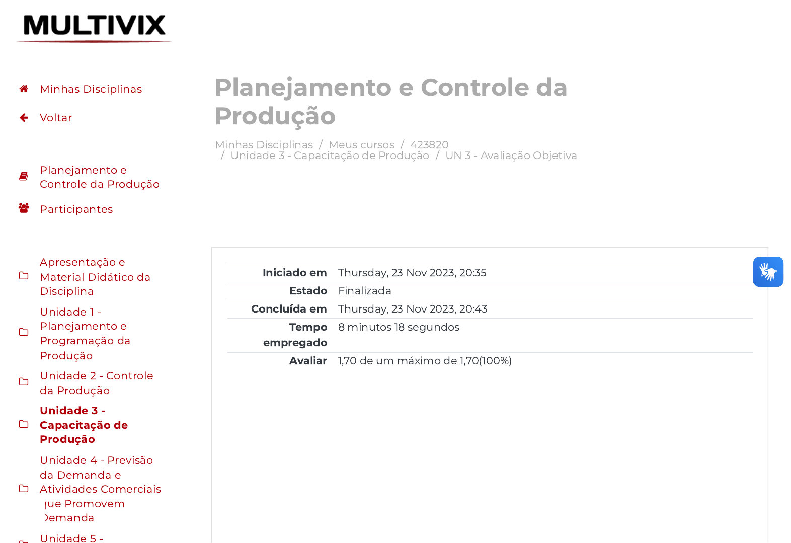 Minhas Disciplinas / Meus cursos / 423820 / Unidade 3 - Capacitação de Produção / UN 3 - Avaliação Objetiva Planejamento e Controle da Produção Iniciado em Thursday, 23 Nov 2023, 20:35 Estado Finalizada Concluída em Thursday, 23 Nov 2023, 20:43 Tempo empregado 8 minutos 18 segundos Avaliar 1,70 de um máximo de 1,70(100%) Minhas Disciplinas Voltar Planejamento e Controle da Produção Participantes Apresentação e Material Didático da Disciplina Unidade 1 - Planejamento e Programação da Produção Unidade 2 - Controle da Produção Unidade 3 - Capacitação de Produção Unidade 4 - Previsão da Demanda e Atividades Comerciais que Promovem Demanda Unidade 5 - https://avap.multivix.edu.br/my/ https://avap.multivix.edu.br/course/view.php?id=24054 https://avap.multivix.edu.br/course/view.php?id=24054§ion=4 https://avap.multivix.edu.br/mod/quiz/view.php?id=1538370 https://avap.multivix.edu.br/my/ https://avap.multivix.edu.br/course/view.php?id=24054 https://avap.multivix.edu.br/user/index.php?id=24054 https://avap.multivix.edu.br/course/view.php?id=24054§ion=1 https://avap.multivix.edu.br/course/view.php?id=24054§ion=2 https://avap.multivix.edu.br/course/view.php?id=24054§ion=3 https://avap.multivix.edu.br/course/view.php?id=24054§ion=4 https://avap.multivix.edu.br/course/view.php?id=24054§ion=5 https://avap.multivix.edu.br/course/view.php?id=24054§ion=6 https://avap.multivix.edu.br/ https://avap.multivix.edu.br/ https://avap.multivix.edu.br/ https://avap.multivix.edu.br/ https://avap.multivix.edu.br/ https://avap.multivix.edu.br/ https://avap.multivix.edu.br/ https://avap.multivix.edu.br/ https://avap.multivix.edu.br/ https://avap.multivix.edu.br/ https://avap.multivix.edu.br/ https://avap.multivix.edu.br/ Questão 1 Correto Atingiu 0,34 de 0,34 Leia o texto a seguir: “A �exibilidade da capacidade signi�ca ter a habilidade de aumentar ou diminuir rapidamente os níveis de produção, ou mudar a capacidade de produção rapidamente de um produto ou serviço para outro. Tal �exibilidade é alcançada mediante fábricas, processos e trabalhadores �exíveis, assim como através de estratégias que usam a capacidade de outras organizações.” (CHASE; JACOBS; AQUILANO, 2006, p. 89). CHASE, R. B.; JACOBS, F. R.; AQUILANO, N. J. Administração da Produção para a vantagem competitiva. 10. ed. São Paulo: Bookman, 2006. O trecho exposto destaca a importância na �exibilidade da capacidade tanto em operações de serviço quanto na indústria de manufatura. Em um contexto industrial, por exemplo, é importante que os recursos de transformação sejam capazes de produzir lotes de tamanhos variados, sem que haja perda excessiva de capacidade com tempos de troca de produtos (tempos de setup). Assim, considerando os conteúdos estudados, analise as a�rmativas a seguir. I. O tempo total de setup diminui quando há maior frequência de troca de produtos. II. O tempo de setup corresponde ao tempo necessário para o ajuste das máquinas e dos equipamentos quando há troca de produto. Minhas Disciplinas Voltar Planejamento e Controle da Produção Participantes Apresentação e Material Didático da Disciplina Unidade 1 - Planejamento e Programação da Produção Unidade 2 - Controle da Produção Unidade 3 - Capacitação de Produção Unidade 4 - Previsão da Demanda e Atividades Comerciais que Promovem Demanda Unidade 5 - https://avap.multivix.edu.br/my/ https://avap.multivix.edu.br/course/view.php?id=24054 https://avap.multivix.edu.br/user/index.php?id=24054 https://avap.multivix.edu.br/course/view.php?id=24054§ion=1 https://avap.multivix.edu.br/course/view.php?id=24054§ion=2 https://avap.multivix.edu.br/course/view.php?id=24054§ion=3 https://avap.multivix.edu.br/course/view.php?id=24054§ion=4 https://avap.multivix.edu.br/course/view.php?id=24054§ion=5 https://avap.multivix.edu.br/course/view.php?id=24054§ion=6 https://avap.multivix.edu.br/ https://avap.multivix.edu.br/ https://avap.multivix.edu.br/ https://avap.multivix.edu.br/ https://avap.multivix.edu.br/ https://avap.multivix.edu.br/ https://avap.multivix.edu.br/ https://avap.multivix.edu.br/ https://avap.multivix.edu.br/ https://avap.multivix.edu.br/ https://avap.multivix.edu.br/ https://avap.multivix.edu.br/ III. O lote mínimo de produção é o tamanho mínimo do lote para o qual o acréscimo de tempo de setups não provoca aumento do tempo de produção acima da capacidade disponível. IV. Troca de molde é um exemplo de atividade realizada durante o setup de um produto. Está correto apenas o que se a�rma em: a. III e IV. b. II, III e IV. c. II e III. d. I, II e III. e. I e III. Minhas Disciplinas Voltar Planejamento e Controle da Produção Participantes Apresentação e Material Didático da Disciplina Unidade 1 - Planejamento e Programação da Produção Unidade 2 - Controle da Produção Unidade 3 - Capacitação de Produção Unidade 4 - Previsão da Demanda e Atividades Comerciais que Promovem Demanda Unidade 5 - https://avap.multivix.edu.br/my/ https://avap.multivix.edu.br/course/view.php?id=24054 https://avap.multivix.edu.br/user/index.php?id=24054 https://avap.multivix.edu.br/course/view.php?id=24054§ion=1 https://avap.multivix.edu.br/course/view.php?id=24054§ion=2 https://avap.multivix.edu.br/course/view.php?id=24054§ion=3 https://avap.multivix.edu.br/course/view.php?id=24054§ion=4 https://avap.multivix.edu.br/course/view.php?id=24054§ion=5 https://avap.multivix.edu.br/course/view.php?id=24054§ion=6 https://avap.multivix.edu.br/ https://avap.multivix.edu.br/ https://avap.multivix.edu.br/ https://avap.multivix.edu.br/ https://avap.multivix.edu.br/ https://avap.multivix.edu.br/ https://avap.multivix.edu.br/ https://avap.multivix.edu.br/ https://avap.multivix.edu.br/ https://avap.multivix.edu.br/ https://avap.multivix.edu.br/ https://avap.multivix.edu.br/ Questão 2 Correto Atingiu 0,34 de 0,34 Leia o trecho a seguir: “Uma das de�nições no dicionário de capacidade é ‘a habili