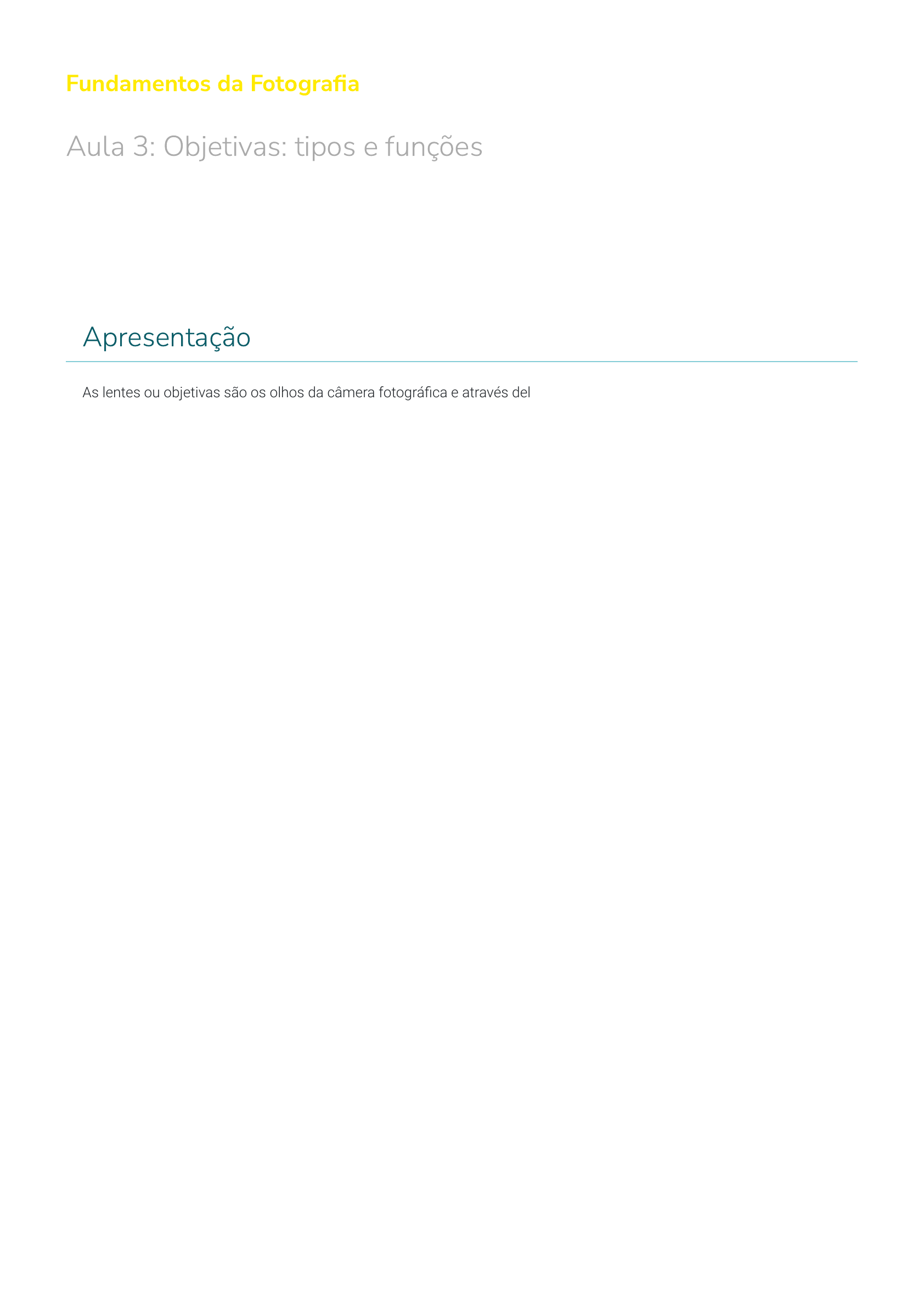 Fundamentos da Fotogra�a Aula 3: Objetivas: tipos e funções Apresentação As lentes ou objetivas são os olhos da câmera fotográ�ca e através delas fazemos os enquadramentos para realização das fotos. As primeiras câmeras fotográ�cas possuíam apenas uma lente, o que ajudou muito no processo de visualização da imagem, já que a câmara escura não possuía lente, apenas um orifício por onde entrava a luz. Isso, muitas vezes, prejudicava a visualização e nitidez da imagem. A descoberta que um vidro auxiliaria na visualização, nitidez e claridade da imagem, facilitou muito o processo. Com o passar do tempo e o aperfeiçoamento das câmeras, as lentes também sofreram uma mudança e, hoje em dia, existem objetivas (de diversas marcas) que, muitas vezes, custam mais caro do que a própria máquina, por causa da qualidade do vidro utilizado, ajudando no processo de nitidez da imagem. Outras características interferem na qualidade de uma objetiva e, consequentemente, em seu valor de mercado, como abertura de diafragma, estabilizador de imagem e material externo utilizado na fabricação. Nesta aula, abordaremos os tipos de objetivas, as distâncias focais e sua interferência no enquadramento e resultado da imagem. Objetivos Reconhecer os tipos, modelos e distâncias focais das lentes fotográ�cas; Identi�car qual a melhor e mais apropriada objetiva para o tipo de fotogra�a desejada. Função da objetiva As primeiras lentes utilizadas nas câmeras serviam para melhorar a qualidade da imagem, sem a perda de luz, que ocorria com a utilização de orifícios menores na câmara escura. Percebeu-se que uma pequena lente nesse orifício permitia a passagem da luz, sem perder a qualidade e claridade para visualização da imagem formada. Algum tempo depois, foi introduzido o diafragma no interior das objetivas, permitindo uma regulagem melhor da quantidade de luz e o aumento de nitidez, para realização das fotos. A objetiva é o olho da câmera fotográ�ca, é através dela que a luz entra. O conjunto ótico converge os raios em um ponto para chegarem ao plano do �lme ou sensor e formar a imagem que é vista através do visor, pelo fotógrafo. Saiba mais Leia o texto Máquina fotográ�ca. No início, existiam apenas as lentes �xas, isto é, apenas uma objetiva na estrutura, por exemplo, objetiva 24mm, 50mm, 135mm, 300mm, entre outras. Depois, surgiram as lentes do tipo zoom, que assumem mais de uma distância focal na mesma estrutura, por exemplo, objetiva 18–135mm, 24–70mm, 75–300mm, entre outras. Os milímetros de cada objetiva representam sua distância focal. Quanto maior esse número em milímetros (500mm, por exemplo) maior o grau de aproximação (zoom) do assunto, e mais estreito o ângulo de enquadramento para foto. Isso quer dizer que uma objetiva de 50mm possui esta distância focal. O ângulo de 50mm é o mais próximo do enquadramento do olho humano, por isso, a objetiva de 50mm é comumente chamada de objetiva normal (para câmeras no formato 35mm analógico e full frame nas digitais). javascript:void(0); Objetivas com distâncias focais menores (18mm ou 24mm, por exemplo), precisam de menos espaço para realização de enquadramentos e abrangem áreas maiores. Objetivas com distâncias focais maiores (80mm ou 200mm ou 500mm, por exemplo), precisam de maior distância do assunto e realizam enquadramentos muito mais fechados. • Cada tipo de objetiva ou distância focal possui sua característica. • Cada distância focal tem um limite mínimo para se conseguir obter foco, que aumenta à medida que o milímetro da objetiva também aumenta. • Uma objetiva grande angular de 24mm, por exemplo, permite aproximação do assunto para realização do foco com cerca de 25cm. • Uma teleobjetiva de 200mm, por exemplo, possui a distância mínima para o foco de cerca de 1,50 m do assunto. Normalmente, essa indicação aparece no corpo da lente, com um símbolo de uma �orzinha ou mesmo com a palavra macro ou micro escritas e a indicação da metragem mínima para o foco. Caso queira realizar uma foto utilizando o foco automático e não consiga �xar o ponto de foco no local desejado, é porque a distância mínima não está sendo respeitada. A câmera não permite o clique para fazer a foto. É como um alerta para o fotógrafo veri�car se não está fora da distância mínima. Mas, é preciso ter cuidado, pois se o ponto de foco estiver errado, a foto será feita e seu assunto estará desfocado. No foco manual, a objetiva permite o clique, mesmo que a distância esteja errada (a foto sairá com foco fora do ponto desejado, mas será feita). Saiba mais Leia o texto As lentes e suas características – “a distância focal”. Estrutura da objetiva Como falamos quanto à estrutura de uma objetiva, ela pode ser �xa ou zoom. Quanto aos milímetros, elas variam desde 8mm até 800mm ou mais. Vamos conhecer alguns tipos de objetivas e suas características: Tipos de objetivas e suas características Clique no botão acima. Tipos de objetivas e suas características Super grande angular Sabe aquela foto que �ca totalmente arredondada? São fotogra�as realizadas com a chamada olho de peixe, objetiva com distância focal de 8mm, por exemplo. Captam imagens em ângulo de 180° e �cam totalmente redondas e bem distorcidas em vez de retangular. javascript:void(0); Entram nessa categoria, também, as objetivas até 15mm, que já não apresentam imagens redondas, mas têm suas bordas distorcidas, por causa do ângulo de visão ser bem aberto. São utilizadas para fotogra�a de grandes áreas, com pouco espaço para enquadramento. Não são apropriadas para fazer retratos, por conta da distorção que apresentam. Entretanto, podem ser utilizadas para esse �m, formando imagens criativas. Grande angular Variam de 16mm a 35mm, ainda causam uma leve distorção nas bordas, porém nem tanto quanto as de 8 ou 10mm. São, também, indicadas para fotog