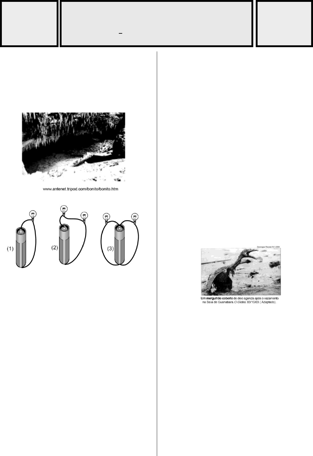 UFF – VESTIBULAR 2004 TELEGRAM: @CANALTROVAO FÍSICA – 1a FASE – RAFAEL TROVÃO 9. O Brasil abriga algumas das maiores e mais belas cavernas conhecidas em todo o mundo. Mais de duas mil dessas formações geológicas já foram cadastradas pela Sociedade Brasileira de Espeleologia. Esses ambientes subterrâneos, geralmente, são caracterizados pela umidade e ausência de luz. Para iluminar uma dessas cavernas e estudá-la, um espeleologista dispõe de uma pilha, duas lâmpadas idênticas e fios condutores elétricos de resistência desprezível. Ele considera as seguintes possibilidades de conexão: Comparando as luminosidades 1L , 2L e 3L , produzidas, respectivamente, pelas configurações (1), (2) e (3), ele verificará que: a) 3 1 2L L L b) 3 2 1L L L= c) 3 1 2L L L d) 3 2 1L L L e) 3 2 1L L L= 10. Ao iluminar a caverna, o espeleologista descobre um lago cristalino e observa que a água de uma infiltração através das rochas goteja periodicamente sobre o lago, provocando pulsos ondulatórios que se propagam em sua superfície. Ele é capaz de estimar a distância (d) entre dois pulsos consecutivos, assim como a velocidade (v) de propagação dos mesmos. Com o aumento da infiltração, o gotejamento aumenta e a quantidade de gotas que cai sobre a superfície do lago, por minuto, torna-se maior. Comparando essa nova situação com a anterior, o espeleologista observa que: a) v permanece constante e d aumenta; b) v aumenta e d diminui; c) v aumenta e d permanece constante; d) v permanece constante e d diminui; e) v e d diminuem. 20. Para construir barracos em uma região onde predominam matacões (pedras gigantes), os invasores do Jardim Paraná, loteamento clandestino na serra da Cantareira, pagam a pedreiros para explodirem as pedras com dinamite. Algumas dessas pedras ficam instáveis. Suponha que uma pedra de 10 toneladas, inicialmente em repouso, deslize, sem rolar, de uma altura de 72 metros e que, nesse processo, aproximadamente 90% da variação de sua energia potencial gravitacional seja dissipada por atrito. www.conservation.org Considerando a aceleração da gravidade igual a 210 m/s , a quantidade de movimento final da pedra em kg m / s é, aproximadamente, igual a: a) 21,4 10 b) 51,2 10 c) 57,2 10 d) 63,6 10 e) 66,5 10 42. Em janeiro de 2000, cerca de 61,2 10 litros de óleo foram derramados, acidentalmente, na baía de Guanabara, formando imensas manchas flutuantes na superfície da água. As densidades do óleo que foi derramado e da água do mar são, respectivamente, 3 3 o 0,85 10 kg/m = e 3 3 a 1,0 10 kg/m = . O volume, em litro, de óleo dessas manchas que ficou submerso é, aproximadamente, igual a: a) 0 b) 60,60 10 c) 60,80 10 d) 61,0 10 e) 61,2 10 43. Duelo de Gigantes: O rio Amazonas é o maior rio do mundo em volume d’água com uma vazão em sua foz de, aproximadamente, 175 milhões de litros por segundo. A usina hidroelétrica de Itaipu também é a maior do mundo, em operação. A potência instalada da usina é de 912,6 10 W . Suponha que toda essa potência fosse utilizada para aquecer a água que flui pela foz do rio Amazonas, sem que houvesse perdas de energia. Nesse caso, a variação de temperatura dessa água, em grau Celsius, seria da ordem de: Dados: calor específico da água o1,0 cal/g C densidade da água 3 a 1,0 g/cm = 1 cal 4,2 Joules= a) 210− b) 110− c) 010 d) 110 e) 210 51. Novas tecnologias possibilitam que o transporte de pessoas se torne cada vez mais rápido e eficiente. Engenheiros franceses desenvolveram uma esteira rolante, de alta velocidade, para pedestres. O equipamento é dividido em três estágios como mostra a figura. O gráfico a seguir representa, aproximadamente, a velocidade, em função do tempo, com que um passageiro é transportado ao longo de todo o percurso. Assinale a opção que melhor representa o gráfico da componente horizontal da força exercida sobre o passageiro em função do tempo, durante esse percurso: a) b) c) d) e) 60. Algumas escolas estão exigindo avaliação oftalmológica como item de matrícula, objetivando evitar problemas com o aprendizado, tendo em vista que, em muitos casos, o mau aproveitamento escolar do aluno decorre de dificuldades visuais. A miopia é um defeito visual que pode ser causado por uma deformação do globo ocular ou por uma excessiva vergência do cristalino, e pode ser corrigida utilizando-se uma lente divergente. www.laserocular.com.br Assinale o esquema que melhor representa a formação da imagem (i), de um objeto distante, em um olho míope. a) b) c) d) e) 62. Diversos jogos e esportes envolvem a colocação de objetos em movimento, os quais podem ser impulsionados por contato direto do atleta ou utilizando-se um equipamento adequado. O conceito físico de impulso tem grande importância na análise dos movimentos e choques envolvidos nesses jogos e esportes. Para exemplificá-lo, três bolas de mesma massa são abandonadas de uma mesma altura e colidem com a superfície horizontal de uma mesa de madeira. A bola 1 é feita de borracha; a 2 de madeira e a 3 de massa de modelar. Comparando os impulsos 1 , 2 e 3 que cada uma das bolas exerce, respectivamente, sobre a mesa, é correto afirmar que: a) 1 2 3 = = b) 1 2 3 c) 1 2 3 d) 1 2 e 2 3 e) 1 2 e 2 3 64. Um corpo de massa m é pendurado em uma balança de mola, de alta precisão, de modo que seu peso aparente possa ser medido em duas posições de latitudes distintas – 1L e 2L – conforme ilustrado na figura. Levando-se em conta os efeitos de rotação da Terra em torno do seu próprio eixo, o corpo terá, em princípio, acelerações diferentes: 1a em 1L e 2a em 2L . Considerando que a Terra seja esférica, e que 1P e 2P sejam as duas medidas registradas, respectivamente, na balança, é correto prever que: a) 1 2P P= porque o peso aparente não depende da aceleração b) 1 2P P porque 1 2a a c) 1 2P P porque 1 2a a d) 1 2P P porque 1 2a a e) 1 2P P porque 1 2a a 65. Recentemente, o PAM (Programa Alimentar Mun