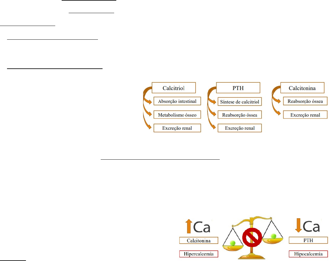Alterações Bioquímicas do Sistema Esquelético Densidade Mineral Óssea: • Os ossos são formados por uma parte orgânica (menos expressiva proteínas e células ósseas) e uma parte– inorgânica (minerais, principalmente cálcio e fósforo). • A vitamina D é um dos hormônios responsáveis pelo processo chamado de mineralização óssea (ou absorção óssea), o qual consiste na retirada de minerais cálcio e fósforo do sangue e depositá-los no osso. A ativação desse processo se dá por um mecanismo de biossinalização cujo sinal é a vitamina D. • Desse modo, tanto a baixa exposição ao sol quanto a má alimentação causam um baixo nível de vitamina D e, consequentemente, uma baixa densidade mineral óssea. • É possível reverter tal situação por meio de mudanças de hábitos. Homeostasia do Ca e do P: • Para se ter uma densidade mineral óssea ideal é necessário que se tenha uma homeostasia do Ca (cálcio) e do P (fósforo), ou seja, normocalcemia e normofosfatemia (níveis ideais de Ca e P). • Regulação a nível de absorção intestinal , aumentando ou diminuindo a absorção intestinal dos minerais. • Regulação por meio da excreção renal (inversamente proporcional à absorção intestinal). • Metabolismo ósseo. – Reações de síntese (anabólicas): síntese da matriz óssea pelos osteoblastos (mineralização - a osteocalcina deposita o cálcio e o fósforo na matriz óssea intacta). no caso de ter muito Ca e P no sangue (são → depositados na matriz óssea) – Reações de quebra (catabolismo): quebra da matriz óssea pelos osteoclastos (desmineralização) no caso → de ter pouco Ca e P no sangue • Para que ocorra os mecanismos de regulação é necessário a presença de moléculas sinais, que nesse contexto são hormônios proteicos: – Vitamina D. Paratormônio (PTH).– Calcitonina.. – • Em casos de níveis não ideais de tais hormônios a regulação fica comprometida. As doenças residentes nessa falta de regulação são chamadas de “Doenças do metabolismo mineral e óssea”: Raquitismo e osteomalácia (doenças atreladas à deficiência de vitamina D.– Hiperparatireoidismo (muito TPH).– Osteoporose (desequilíbrio das atividades osteoblástica e osteoclástica que leva a perda da massa óssea e, – consequentemente, da densidade mineral óssea) Cálcio: • Mineral mais abundante no organismo vivo. • Cerca de 99% presente no esqueleto. • E 1% presente em dentes, tecidos moles e fluido extracelular. • F unções: Protagonista de processos fisiológicos. – Ex: contração muscular. Segundo mensageiro.– Cofator enzimático.– Mantenedor da resistência óssea.– Vitamina D: • Vitamina D = vitamina D = calcitriol. • Formas de obtenção: exposição solar; alimentação. • Exposição solar. – Presença do precursor 7-desidrocolesterol na superfície da pele que sofre a incidência de UV transformando-o em colecalciferol (vitamina D3). O colecalciferol é um pró-hormônio (molécula que tem uma atividade metabólica que para ser exercida precisa– ser ativada). A ativação desse pró-hormônio é dependente de metabolismo endógeno (ocorre no fígado e nos rins), – conjunto de reações capazes de mudar estruturalmente e funcionalmente o colecalciferol, obtendo-se a forma ativa da vitamina D (calcitriol). A partir da ativação consegue-se exercer as funções da vitamina D no organismo. – Resumindo, fatores determinantes: níveis ideais de colesterol; exposição solar adequada; metabolismo – endógene adequado. • Alimentação: Alimentação natural: alimentos que são naturalmente ricos em vitamina D3 (que se converte em vitamina D).. Os– peixes são majoritamente ricos em vitamina D3. – Alimentos enriquecidos com vitamina D: a indústria enriquece os alimentos com uma vitamina sintetizada (vitamina D2, também chamada de ergocalciferol) a partir de colesterol de bactérias (ergocolesterol). Suplementação: a parir de suplementos vitamínicos. – • Metabolismo endógeno: Acontece com o objetivo de ativação da vitamina D (calcitriol), o qual é alcançado por meio de duas etapas – reacionais (uma acontece no fígado e a outra no rim). 1– a etapa hepática: depois de se obter o pró-hormônio ele é carreado até o fígado onde sofre uma reação (catalisada pela enzima Hidroxilase) de hidroxilação (adicionar hidroxila) e ele é convertido em um intermediário chamado de hidroxicolecalciferol Pró-hormônio Hidroxicolecalceferol → 2– a etapa renal: o produto da primeira etapa (hidroxicolecalceferol) é carreado para o rim, onde ocorre mais uma hidroxilação (enzima Alfa-1-hidroxilase), resultando em Di-hidroxicolecalciferol (calcitriol). Hidroxicolecalceferol Di-hidroxicolecalciferol (calcitriol)→ – A desregulação da atividade das enzimas envolvidas nas reações é um fator determinante nos níveis de vitamina D no organismo. • A principal função da vitamina D é promover a absorção de minerais • Em casos de baixos níveis de Ca e P a Alfa-1-hidroxilase promove maior produção de calcitriol (Alfa-1-hidroxilase ativa). • No mesmo sentido, quando há altos níveis de Ca e P ocorre inativação da Alfa-1-hidroxilase. • O calcitriol aumenta a absorção intestinal justamente porque aumenta a síntese de transportadores intestinais. • O calcitriol é um hormônio que vai atuar a nível de metabolismo ósseo, viabilização da diferenciação de osteoblastos que vão realizar a síntese de matriz óssea. Já no caso de matriz óssea intacta, o calcitriol atua na ativação da osteocalcina que promove o processo de mineralização. • O calcitriol diminui a excreção renal pelo aumento da absorção intestinal. Hipocalcemia: • Em caso de hipocalcemia há a ação do paratormônio (produzido pelas glândulas paratireoides). • O fator determinante da ativação da glândula é o baixo nível dos minerais. • Hipocalcemia paratormônio (PTH).