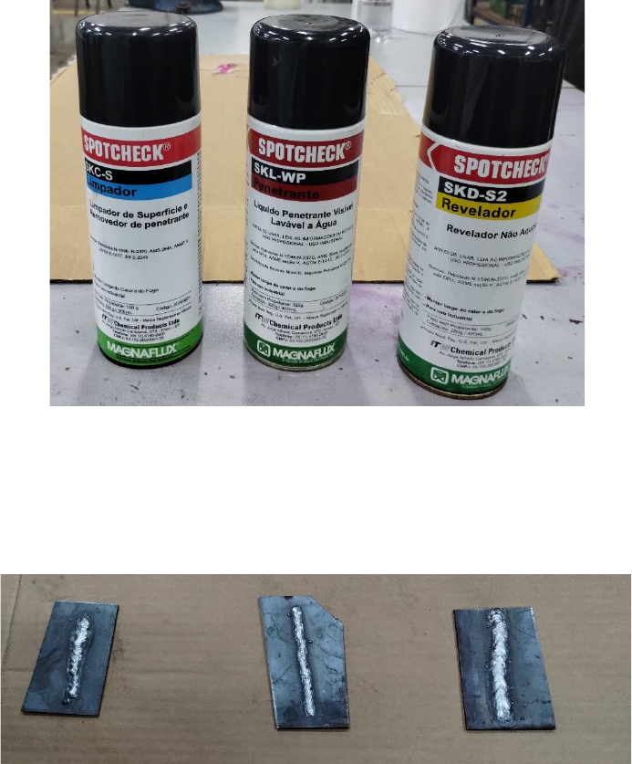 Relatório de Soldagem Para o início dos testes de líquidos penetrantes foi selecionado três corpos de prova, solicitei a três integrantes da equipe que fizessem um cordão de solda (superfície) cada com eletrodo revestido, foi utilizado os itens abaixo para o teste da marca MAGNAFLUX: a peça tem que estar em temperatura ambiente para o início dos testes, imagem dos corpos de prova que iremos utilizar para realizar o teste: Primeiro passo iremos usar o limpador para eliminar todas as impurezas das peças, conforme as instruções do produto (agitando o produto, e utilizar ele na vertical e com 25cm de distância da peça), após a utilização do produto esperar de 5 a 15 minutos até a secagem do produto, foto a seguir mostra as peças com a aplicação do limpador: Para o segundo passo iremos utilizar o líquido penetrante que tem uma coloração de vermelha para rosa, conforme as instruções do produto (aplicar o produto e esperar de 5 a 15 minutos após a aplicação do produto) a seguir a foto do produto com o penetrante aplicado: Para remover o excesso utilizaremos um borrifador de água e espera 10 minutos para começar o terceiro passo: Terceiro passo utilizaremos o revelador para ele contrastar com o penetrante que está em cavidades da solda assim revelando os lugares com falha: Para a peça número 1(da esquerda da foto), foi notado na figura 2 várias cavidades na solda e esse corpo de prova seria reprovado antes do início dos testes Na peça 2(do meio), foi notado que o corpo de prova está com o cordão muito fino fragilizando a união das peças e uma possível ruptura da solda através de esforço, mas com os testes finalizados podemos observar uns pontos na lateral tem algumas cavidades com exposição ao ar e facilitando assim a oxidação do material: Na peça 3, é a solda mais promissora e a única que seria submetida aos testes de líquido penetrante, após a conclusão é possível ver algumas falhas no cordão na parte inferior temos uma grande cavidade, e ao longo do cordão temos alguns estreitamentos: Conclusão Com base nos cordões de solda analisados todos eles estão reprovados no teste de qualidade, uns com uma alta deposição de material outro com um avanço muito rápido e uma baixa deposição de material, outro com falhas de estreitamento e por sopro elétrico na finalização do cordão.