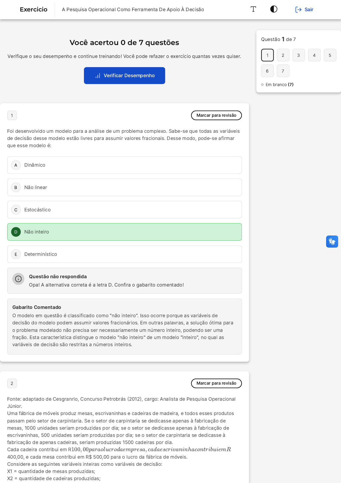 Você acertou 0 de 7 questões Verifique o seu desempenho e continue treinando! Você pode refazer o exercício quantas vezes quiser. Verificar Desempenho A B C D E 1 Marcar para revisão Foi desenvolvido um modelo para a análise de um problema complexo. Sabe-se que todas as variáveis de decisão desse modelo estão livres para assumir valores fracionais. Desse modo, pode-se afirmar que esse modelo é: Dinâmico Não linear Estocástico Não inteiro Determinístico Questão não respondida Opa! A alternativa correta é a letra D. Confira o gabarito comentado! Gabarito Comentado O modelo em questão é classificado como "não inteiro". Isso ocorre porque as variáveis de decisão do modelo podem assumir valores fracionários. Em outras palavras, a solução ótima para o problema modelado não precisa ser necessariamente um número inteiro, podendo ser uma fração. Esta característica distingue o modelo "não inteiro" de um modelo "inteiro", no qual as variáveis de decisão são restritas a números inteiros. 2 Marcar para revisão Fonte: adaptado de Cesgranrio, Concurso Petrobrás �2012�, cargo: Analista de Pesquisa Operacional Júnior. Uma fábrica de móveis produz mesas, escrivaninhas e cadeiras de madeira, e todos esses produtos passam pelo setor de carpintaria. Se o setor de carpintaria se dedicasse apenas à fabricação de mesas, 1000 unidades seriam produzidas por dia; se o setor se dedicasse apenas à fabricação de escrivaninhas, 500 unidades seriam produzidas por dia; se o setor de carpintaria se dedicasse à fabricação de apenas cadeiras, seriam produzidas 1500 cadeiras por dia. Cada cadeira contribui em R 400,00, e cada mesa contribui em R$ 500,00 para o lucro da fábrica de móveis. Considere as seguintes variáveis inteiras como variáveis de decisão: X1 � quantidade de mesas produzidas; X2 � quantidade de cadeiras produzidas; 100, 00paraolucrodaempresa, cadaescrivaninhacontribuiemR Questão 1 de 7 Em branco �7� 1 2 3 4 5 6 7 Exercicio A Pesquisa Operacional Como Ferramenta De Apoio À Decisão Sair A B C D E A B C D E X3 � quantidade de escrivaninhas produzidas. A fábrica de móveis deseja programar a sua produção de modo a obter o maior lucro possível. A função objetivo desse problema é: Max Z�500X � 100X � 400X1 2 3 Max Z�500X � 400X � 100X1 2 3 Max Z�1000X � 1500X � 500X1 2 3 Max Z�1000X � 500X � 1500X1 2 3 Max Z�X � X � X1 2 3 Questão não respondida Opa! A alternativa correta é a letra A. Confira o gabarito comentado! Gabarito Comentado A função objetivo deste problema é determinar a combinação de produção que maximiza o lucro da fábrica. Cada produto contribui de maneira diferente para o lucro total da empresa. A mesa contribui com R 100,00 e a escrivaninha com R$ 400,00. Portanto, a função objetivo, que busca maximizar o lucro, deve ser a soma dos lucros de cada produto, multiplicado pela quantidade produzida. Assim, a função objetivo correta é: Max Z�500X � 100X � 400X . 500, 00, acadeiracomR 1 2 3 3 Marcar para revisão O gerenciamento de recursos nem sempre é uma tarefa trivial. Nesse sentido, avalie as assertivas a seguir: I. Tornar o processo decisório mais criterioso e com menos incertezas. II. Ganhar conhecimento e entendimento sobre o problema investigado. III. Maior dispêndio de recursos, tanto financeiros quanto de tempo, para a análise do problema. Assinale a alternativa que corresponde a uma vantagem obtida por meio da utilização de modelos. I, apenas. II, apenas. III, apenas. I e II, apenas. II e III, apenas. Questão não respondida Opa! A alternativa correta é a letra D. Confira o gabarito comentado! A B C D E Gabarito Comentado Os modelos geralmente são utilizados com o objetivo de tornar o processo decisório mais criterioso e com menos incertezas. Além disso, os modelos também permitem explicitar objetivos, ganhar conhecimento e entendimento sobre o problema investigado e analisar cenários que seriam impossíveis de serem analisados na realidade. A afirmação III é falsa, pois a utilização de modelos pode economizar recursos (financeiros e de tempo) ao permitir a análise de cenários e simulações sem necessidade de testar tudo na realidade. 4 Marcar para revisão A Pesquisa Operacional �PO� se destaca por fornecer uma ferramenta quantitativa para apoio ao processo de tomada de decisão para problemas complexos. Assinale a alternativa, a seguir, que não corresponde a uma das diferentes técnicas de Pesquisa Operacional. Teoria das Filas Teoria dos Jogos Teoria da Contingência Teoria de sistemas baseados em agentes Inteligência Computacional Questão não respondida Opa! A alternativa correta é a letra C. Confira o gabarito comentado! Gabarito Comentado A alternativa correta é a Teoria da Contingência. Esta é uma teoria da administração que se concentra na relação entre diferentes aspectos do ambiente organizacional e suas implicações para o desempenho organizacional. No entanto, ela não é considerada uma técnica de Pesquisa Operacional. As demais alternativas, Teoria das Filas, Teoria dos Jogos e Teoria de sistemas baseados em agentes, são exemplos de técnicas de pesquisa operacional. A Inteligência Computacional, por sua vez, é uma área da inteligência artificial que inclui técnicas de pesquisa operacional, como aprendizado de máquina, redes neurais, algoritmos genéticos e algoritmos de busca. 5 Marcar para revisão Uma fazenda produz dois tipos de alimentos, A e B, que são vendidos a R 3,00 por unidade, respectivamente. Para produzir 1 unidade de A, são necessárias 2 horas de trabalho e 1 unidade de matéria-prima, enquanto para produzir 1 unidade de B, são necessárias 1 hora de trabalho e 2 unidades de matéria-prima. A fazenda tem disponíveis 200 horas de trabalho e 150 unidades de matéria-prima. Qual a valor da receita máxima possível, considerando a quantidade de cada produto que a fazenda deve produzir? 2, 