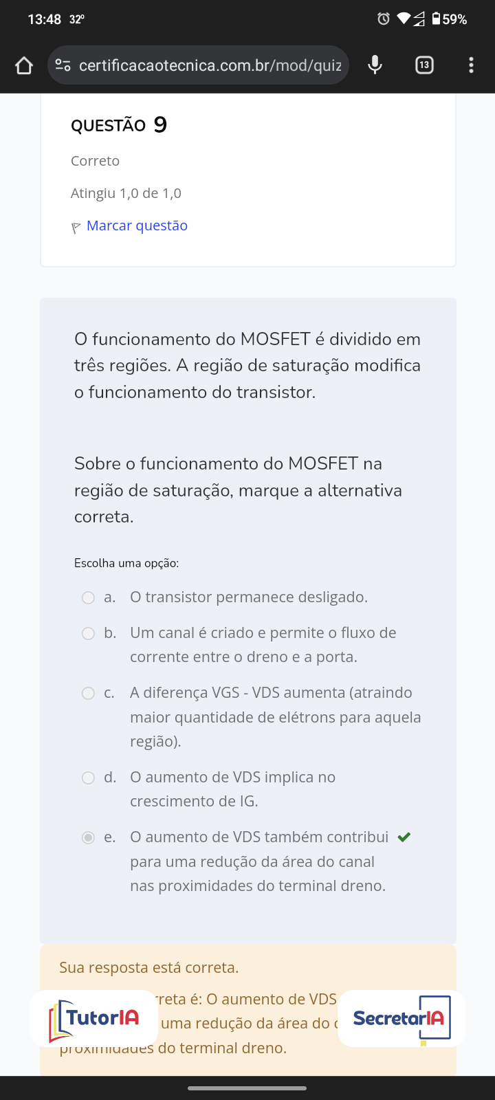 a. transistor permanece desligado. b. Um canal é criado e permite o fluxo de corrente entre o dreno e a porta. c. A diferença VGS - VDS aumenta (atraindo maior quantidade de elétrons para aquela região). d. aumento de VDS implica no crescimento de IG. e. aumento de VDS também contribui para uma redução da área do canal nas proximidades do terminal dreno.