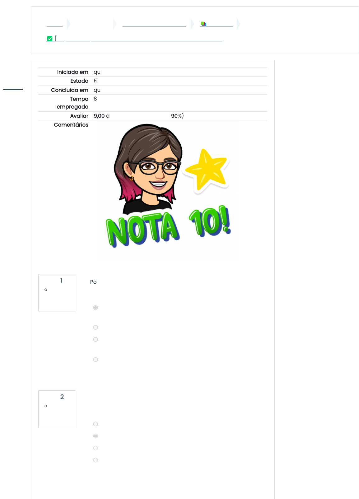 Painel Meus cursos 32010001568-T01-2024-1 📚 Módulo 2 ✅ [A2] – Avaliação do Módulo 2 – Estrutura e conteúdo dos textos Questão 1 Correto Atingiu 1,00 de 1,00 Questão 2 Correto Atingiu 1,00 de 1,00 Iniciado em quarta, 24 abr 2024, 14:44 Estado Finalizada Concluída em quarta, 24 abr 2024, 14:53 Tempo empregado 8 minutos 8 segundos Avaliar 9,00 de um máximo de 10,00(90%) Comentários Por que se pode afirmar que a coesão não é uma condição necessária nem suficiente para a coerência? a. Porque a coerência se constrói a partir do texto em uma situação comunicativa.  b. Porque a coesão está vinculada a fatores cognitivos. c. Porque a coesão depende do conhecimento de mundo do leitor, mas a coerência não. d. Porque a coerência se dá por meio de marcas linguísticas no texto. Dois elementos contextuais que auxiliam o cálculo de sentido para a coerência são: a. De ordem sintática e semântica. b. De ordem sociocognitiva e interacional. c. De ordem histórica e fonológica. d. De ordem lógica e gramatical.            https://ava.ufms.br/my/ https://ava.ufms.br/course/view.php?id=53694 https://ava.ufms.br/course/view.php?id=53694#section-3 https://ava.ufms.br/mod/quiz/view.php?id=742558 javascript:void(0); https://ava.ufms.br/user/index.php?id=53694 https://ava.ufms.br/theme/moove/certificates.php?id=53694 https://ava.ufms.br/admin/tool/lp/coursecompetencies.php?courseid=53694 https://ava.ufms.br/grade/report/index.php?id=53694 https://ava.ufms.br/my/ https://ava.ufms.br/?redirect=0 https://ava.ufms.br/calendar/view.php?view=month&course=53694 javascript:void(0); https://ava.ufms.br/user/files.php Questão 3 Incorreto Atingiu 0,00 de 1,00 Questão 4 Correto Atingiu 1,00 de 1,00 Questão 5 Correto Atingiu 1,00 de 1,00 Questão 6 Correto Atingiu 1,00 de 1,00 Questão 7 Correto Atingiu 1,00 de 1,00 A respeito do mecanismo de coesão textual, intitulado referência, como se chama a remissão a algo pertencente à situação comunicativa? Resposta: deixis  Sobre a relação entre coesão e coerência, leia as afirmativas a seguir, sempre levando em consideração as propostas apresentadas no capítulo de Koch: I) Para Marcuschi, a coesão não é uma condição necessária nem suficiente para termos a criação de um texto. II) Na atualidade, existe quase um consenso entre os estudiosos de que a coerência e a coesão são conceitos distintos. III) Textos que não têm elementos coesivos, consequentemente não serão textos coerentes. Estão corretas: a. I e III b. II e III c. I e II d. I, II e III Quando dizemos que a coerência não está no texto significa afirmar que não é possível localizá-la pontualmente, mas que o processo de interação entre o autor e o texto geram pistas para nós, leitores, e, assim, construímos a coerência de um determinado texto. Escolha uma opção: Verdadeiro  Falso São fatores que geram a incoerência sintática, exceto: a. Uso equivocado de pronomes. b. Seleção lexical. c. Estruturas ambíguas sintaticamente. d. Uso inadequado de conectores. Qual princípio está intimamente relacionado à coerência semântica? a. Princípio da não contradição. b. Princípio de relação. c. Princípio da progressão. d. Princípio da substituição.            javascript:void(0); https://ava.ufms.br/user/index.php?id=53694 https://ava.ufms.br/theme/moove/certificates.php?id=53694 https://ava.ufms.br/admin/tool/lp/coursecompetencies.php?courseid=53694 https://ava.ufms.br/grade/report/index.php?id=53694 https://ava.ufms.br/my/ https://ava.ufms.br/?redirect=0 https://ava.ufms.br/calendar/view.php?view=month&course=53694 javascript:void(0); https://ava.ufms.br/user/files.php Questão 8 Correto Atingiu 1,00 de 1,00 Questão 9 Correto Atingiu 1,00 de 1,00 Questão 10 Correto Atingiu 1,00 de 1,00 Após a discussão teórica feita por Koch (2010), no capítulo “Coesão textual: conceito e mecanismos”, a autora chega à conclusão de que existem dois grandes grupos de mecanismos coesivos. São eles: a coesão remissiva e a sequenciação. Escolha uma opção: Verdadeiro  Falso Na sentença “É uma atividade igual a de ontem”, a referência é endofórica ou exofórica? Resposta: endofórica  Na frase “Ele comprou um apartamento no ano passado. Neste ano, ⌀ precisou vender por causa da separação.”, ocorre o processo de: a. Hipônimo b. Elipse c. Forma parcialmente repetida d. Sinônimo Atividade anterior ◄ 📍 [Checkout de Presença] Módulo 2 – Estrutura e conteúdo dos textos Seguir para... Próxima atividade ▶ [Videoaula] Apresentação do Módulo 3 ►  Manter contato Suporte Técnico ao Usuário  https://suporteagetic.ufms.br  (67) 3345-7613  suporte.agead@ufms.br            https://ava.ufms.br/mod/assign/view.php?id=742556&forceview=1 https://ava.ufms.br/mod/url/view.php?id=742559&forceview=1 https://suporteagetic.ufms.br/ tel:(67) 3345-7613 mailto:suporte.agead@ufms.br https://api.whatsapp.com/send?phone=556733457613 javascript:void(0); https://ava.ufms.br/user/index.php?id=53694 https://ava.ufms.br/theme/moove/certificates.php?id=53694 https://ava.ufms.br/admin/tool/lp/coursecompetencies.php?courseid=53694 https://ava.ufms.br/grade/report/index.php?id=53694 https://ava.ufms.br/my/ https://ava.ufms.br/?redirect=0 https://ava.ufms.br/calendar/view.php?view=month&course=53694 javascript:void(0); https://ava.ufms.br/user/files.php