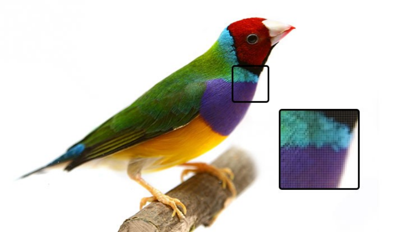 Fundamentos sobre pixels Agora, vamos aprender como imagens são representadas em computadores, ou seja, estudaremos as imagens digitais. Observe o exemplo a seguir, de um lindo pássaro, em que vemos as cores amarelo, roxo, azul, verde, preto e um fundo branco: Exemplo de imagem digital Você certamente observou como essa imagem é natural e arredondada. Temos a nítida impressão de que estamos olhando para um pássaro de verdade. Na parte interna do computador, entretanto, essa imagem, e qualquer outra, resume-se a uma grande quantidade de números pequenos. Lembre-se: computadores são capazes de lidar somente com números. Então, como é que isso funciona? O primeiro passo para compreendermos as imagens digitais, ou seja, como o computador representa uma imagem por meio de um conjunto de números pequenos, é darmos um bom “zoom” na imagem para observarmos mais detalhes. Veja: Zoom no início do colar azul do pássaro Você pode observar que há uma área azul no meio, uma parte maior em preto à esquerda e uma parte branca à direita. Você também pode constatar que a imagem é formada por pequenos quadrados, cada um de uma cor diferente. Eles são o que chamamos de pixels. Cada pixel é um quadrado. Quando olhamos para uma imagem digital como um todo, sequer percebemos que ela é formada por esses pequenos quadrados. Isso ocorre porque os pixels são tão pequenos que geram uma ilusão de ótica, assemelhando-se a uma imagem natural e arredondada. Realmente, só conseguimos notar que imagens são formadas por pixels quando usamos o recurso de zoom. Antes de prosseguirmos, faremos a seguinte e breve provocação: Você conhece algum outro exemplo, fora do mundo dos computadores, em que pontos (pixels) também sejam usados para representar imagens? expand_more Por exemplo, se a imagem anterior do pássaro for representada por apenas 1.600 pixels, ficará conforme mostra a seguir: O mesmo pássaro com número total de pixels reduzido para 1.600 Não há um número-esquema para o número de pixels contidos em uma imagem. Quanto mais pixels houver em uma imagem, mais próxima ela será da realidade. As características fundamentais de qualquer imagem digital são: · Elas são formadas por pixels, que são quadrados; · Um pixel só pode assumir uma cor por vez. Você não pode, em um mesmo instante, representar mais de uma cor em um pixel. Se você quiser analisar a quantidade de pixels em uma imagem, basta checar quantos formam sua largura (colunas) e quantos formam sua altura (linhas). Então, o número total de pixels é apenas uma questão de multiplicação. extension Exemplo Se houver uma imagem com 800 pixels de largura por 600 de altura, o total de pixels será: 800 x 600 = 480.000. A imagem do pássaro é formada por 3.892 pixels de largura (colunas) e 3.328 pixels de altura (linhas): 3.892 x 3.328. Aquele lindo pássaro foi representado pelo uso de 12.952.576 pixels, ou seja, quase 13 milhões. Agora fica fácil entender por que a imagem nos parece tão natural. Você, provavelmente, já deve ter ouvido o termo megapixel. Ele é usado para se referir a 1.000.000 (um milhão) de pixels. Então, o exemplo do passáro possui praticamente 13 megapixels. Telefones celulares, atualmente, são capazes de capturar imagens com resoluções de 5, 10, 12, 16, 20 e até 100 megapixels. Com o passar dos anos, as câmeras digitais se tornaram capazes de capturar cada vez mais megapixels. Notamos que uma imagem digital é representada pelo computador como uma grade de pixels. Cada pixel é um quadrado que só é capaz de assumir uma cor por vez. Além disso, é necessário que haja um esquema de endereçamento para identificar cada pixel na composição da imagem. Nos computadores, foi padronizado o uso de um conjunto de números para representar a coluna em que o pixel se encontra, onde 0 (zero) corresponde à primeira coluna, 1 (um) corresponde à segunda, e assim por diante. Temos o conjunto de valores do eixo y, onde 0 (zero) representa a primeira linha (topo), 1 (um) representa a segunda, 2 (dois) representa a terceira etc. Historicamente, é assim que os pixels de uma imagem são enumerados pelo computador: Gráfico: Imagem digital representada em um computador No gráfico, podemos ver três pixels indicados por setas. O pixel (5,0), em azul, o pixel (1,1), em branco, e o pixel (2,4), em amarelo. É bem comum dizer que esses valores são as coordenadas de um pixel, algo como o endereço da posição do pixel em referência ao canto superior esquerdo. Mesmo que uma imagem tenha 100.000.000 pixels, qualquer pixel em particular tem um número x,y que o identifica unicamente em relação a todos os demais da imagem. image6.jpeg image7.png image1.jpeg image2.jpeg image3.gif image4.jpeg image5.jpeg