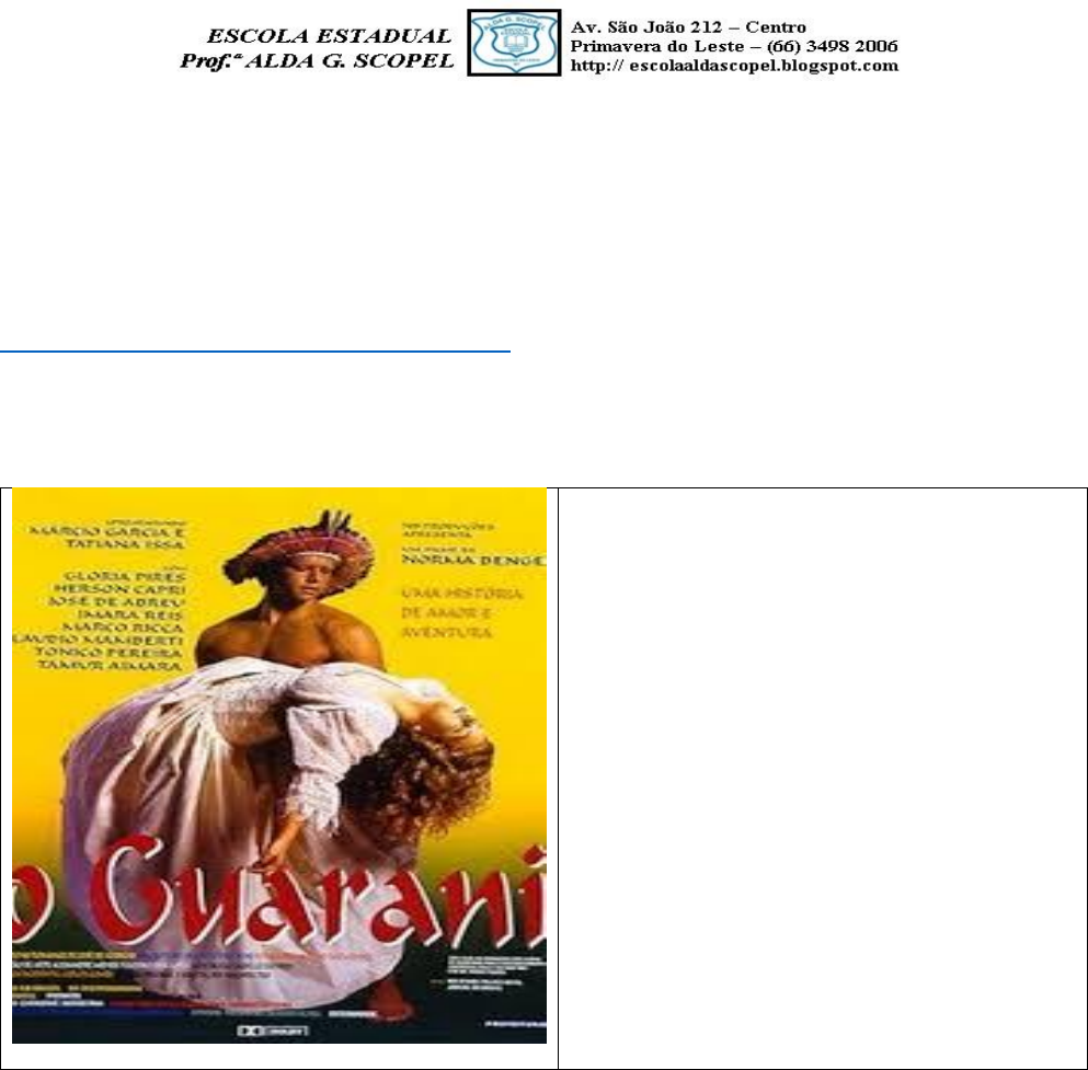 ESCOLA ESTADUAL PROFª. ALDA G. SCOPEL DISCIPLINA: LÍNGUA PORTUGUÊSA CONTEÚDO: TRABALHO SOBRE O FILME “O GUARANI” PROFESSORA SONIA MARIA BRESCOVICI ALUNO(A): ________________________________________________ SÉRIE: ________ Clique no link abaixo e assista ao filme “O Guarani” https://www.youtube.com/watch?v=H_t79RdEt8Y Análise do filme O Guarani Ficha técnica completa Título: O Guarani (Original) Ano produção 1995 Dirigido por: Norma Bengell Elenco: Cláudio Mamberti: Mestre Nunes Glória Pires: Isabel Herson Capri: Dom Antônio de Mariz Imara Reis: Laureana José de Abreu: Loredano Márcio Garcia: Peri Marco Ricca: Álvaro Tatiana Issa: Ceci Tonico Pereira: Aires Estreia: 1995 (Brasil) Outras datas Duração: 91 minutos Gênero : Drama História Nacional Romance Países de Origem:Brasil Sinopse O Guarani, uma superprodução do cinema brasileiro dirigida por Norma Bengell e baseada no clássico romance de José de Alencar. No Brasil do século 17, uma família de colonizadores portugueses, cujo patriarca é Dom Antônio, vive numa fortaleza construída próxima às terras dos índios Aimorés. A família e os índios, especialmente Peri, da tribo dos Goytacazes, vivem em paz até serem perturbados por Loredano, um ex-padre que lidera uma conspiração e provoca a morte de uma Aimoré. A tribo revoltada massacra toda a família portuguesa, porém há uma sobrevivente, Ceci, filha de Dom Antônio, que consegue escapar graças à ajuda de Peri. Explode entre eles uma paixão incondicional que irá unir as duas culturas. Após assistir ao filme responda as questões a seguir: https://www.youtube.com/watch?v=H_t79RdEt8Y Questão 01 - Em O Guarani, o autor procura valorizar as origens do povo brasileiro e transformar certos personagens em herois, com traços do caráter do “bom selvagem”: pureza, valentia e brio. Essa tendência é típica do gênero: A) conto. B) crônica. C) romance urbano. D) romance indianista Questão 02- Quanto ao tipo de narrador, pode-se afirmar que é: A) narrador-personagem protagonista. B) narrador-observador onisciente. C) narrador-personagem testemunha. D) eu-lírico. Questão 03 - Em que época se passa a história narrada? A) da colonização do Brasil. B) da Proclamação da República do Brasil. C) da Independência do Brasil. D) do descobrimento do Brasil. Questão 04- A obra trata, principalmente A) dos conflitos entre os colonizadores portugueses e os indígenas durante a colonização. B) da formação do povo brasileiro a partir da união de Ceci e Peri. C) da história de amor entre um índio e a filha de um fidalgo português. D) da harmonia entre homem e a natureza. Questão 05 – O fato que dá início ao ENREDO é A) Três homens, Peri, Álvaro e Loredano, desejarem a mesma mulher. B) O ódio que Dona Lauriana. nutria por Peri e por Isabel. C) A morte acidental de uma índia aimoré causada pelo filho de Dom Antônio. D) Loredano e seus capangas terem traído a confiança de Dom Antônio. Questão 06 - “Vamos agora seguir as linhas de vida de três homens bem diferentes que apresentavam um só pensamento, porém sentimentos bem distintos: um era um desejo brutal, o outro um afeto inocente, o último uma adoração.” (págs.:16-17) ___________ desejava; _________ amava; ________ adorava Nesse trecho de O guarani, o narrador caracteriza os diferentes tipos de amor que três personagens masculinas sentem por Ceci. Mantida a sequência, as lacunas serão preenchidas corretamente com os nomes de: A) Álvaro / Peri / D. Diogo B) Loredano / Álvaro / Peri C) Loredano / Peri / D. Diogo D) Álvaro / D. Diogo / Peri Questão 07 - D. Antônio de Mariz, o fidalgo português de O Guarani, só permite Peri salvar sua filha Cecília sob duas condições. A) Tornar-se cristão e levar Ceci até o filho D. Diogo, no Rio de Janeiro. B) Jurar fidelidade à Coroa portuguesa e levar a filha à sua irmã. C) Esquecer a sua cultura e dedicar-se totalmente a Ceci. D) Tornar-se cristão e levar Ceci à sua irmã, no Rio de Janeiro. Questão 08 - Pensando que Peri havia sido morto por uma onça, Dona Lauriana disse: ____ Não se perde grande coisa. Qual o sentimento expresso nesse momento por ela? A) desprezo. B) abandono. C) raiva. D) indignação. Questão 09 – Que fato favoreceu a aproximação de Peri com a família de Dom Antônio? A) Ele ter salvo a jovem Cecília do ataque dos Aimorés, na beira do rio. B) Ele matado a onça que atacou o Solar no rochedo. C) Ele ter salvo a jovem Cecília de ser esmagada por uma pedra D) Ele ser filho de uma índia que foi salva por Dom Antônio. Questão 10 – Em que CENÁRIO se passa a história de ‘O Guarani”? A) Na floresta do Vale do rio Paquequer, entre a Paraíba e o Rio de Janeiro. B) Na reserva dos índios Aimorés. C) Na floresta do Vale do rio Paraíba, entre São Paulo e Rio de Janeiro. D) Na atual floresta da Tijuca, no Rio de Janeiro. Questão 11 – Assinale a alternativa que informa como Loredano conseguiu o roteiro das minas de prata de Robério Dias. A) Ganhou do Frei Ângelo Di Luca. B) Comprando-o de Fernão Dias, durante sua última confissão no leito de morte. C) Matando Robério Dias e sua esposa. D) Roubando-o de Fernão Dias, durante sua confissão no leito de morte. Questão 12 – Assinale a única alternativa INCORRETA. A) Dom Antônio provocou a explosão no depósito de armas, matando os Aimorés e todos que lá estavam. B) Isabel e Álvaro morreram juntos, sufocados pela fumaça de um incêndio que ela mesma provocou. C) Dom Diego foi enviado pelo pai ao Rio de Janeiro para buscar reforços. D) Peri levou Ceci a salvo à casa de sua tia, no Rio de Janeiro. Questão 13 - Em que consiste o capítulo 13 “Revelação” (pag. 20)? A) Ceci declara sua paixão por Peri. B) Isabel declara-se apaixonada por Álvaro. C) Loreno revela sua estratégia para destruir a casa forte. D) Peri revela que envenenou a “água que os brancos bebem, e o seu corpo que devia servir ao banquet