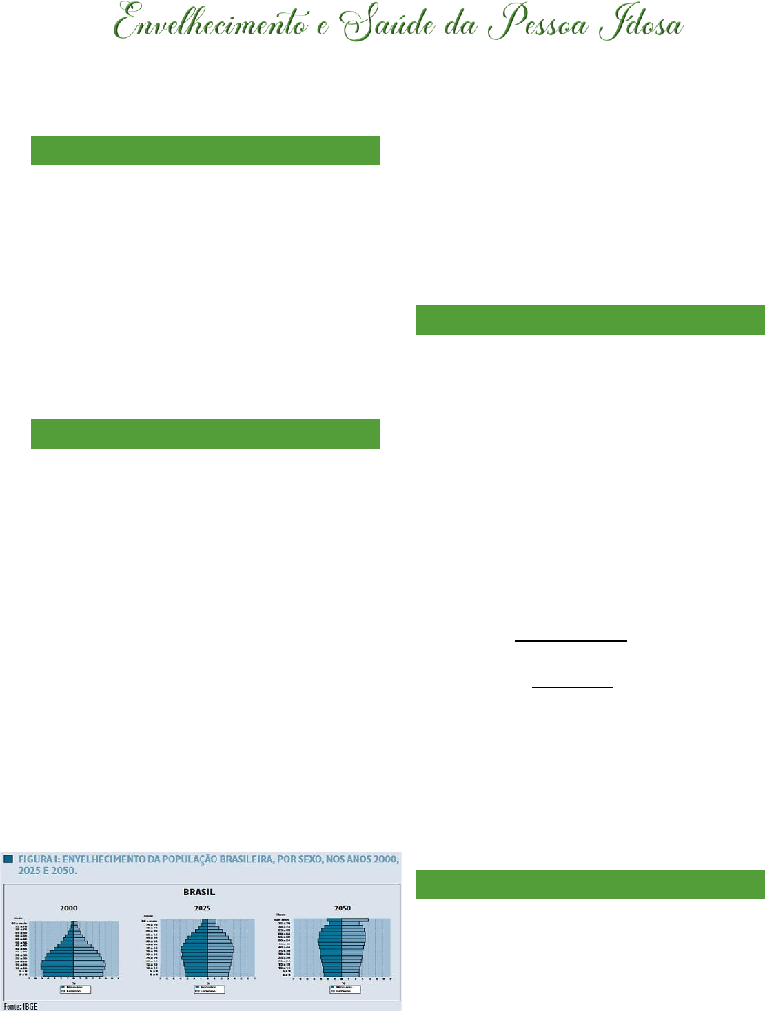 INTERAÇÃO COMUNITÁRIA Graziela Gonzaga Santana APRESENTAÇÃO • A longevidade é, sem dúvida, um triunfo. • Há, no entanto, importantes diferenças entre os países desenvolvidos e os países em desenvolvimento. Enquanto, nos primeiros, o envelhecimento ocorreu associado às melhorias nas condições gerais de vida, nos outros, esse processo acontece de forma rápida, sem tempo para uma reorganização social e da área de saúde adequada para atender às novas demandas emergentes. TRANSIÇÃO DEMOGRÁFICA • Para o ano de 2050, a expectativa no Brasil, bem como em todo o mundo, é de que existirão mais idosos que crianças abaixo de 15 anos, fenômeno esse nunca antes observado. • O envelhecimento, antes considerado um fenômeno, hoje, faz parte da realidade da maioria das sociedades. O mundo está envelhecendo. Tanto isso é verdade que estima-se para o ano de 2050 que existam cerca de dois bilhões de pessoas com sessenta anos e mais no mundo, a maioria delas vivendo em países em desenvolvimento. • No Brasil, estima-se que existam, atualmente, cerca de 17,6 milhões de idosos. O retrato e o crescimento da população idosa brasileira em 50 anos podem ser observados na figura: • O envelhecimento populacional é uma resposta à mudança de alguns indicadores de saúde, especialmente a queda da fecundidade e da mortalidade e o aumento da esperança de vida. Não é homogêneo para todos os seres humanos, sofrendo influência dos processos de discriminação e exclusão associados ao gênero, à etnia, ao racismo, às condições sociais e econômicas, à região geográfica de origem e à localização de moradia. CONCEITO DE ENVELHECIMENTO • A Organização Pan-Americana de Saúde (OPAS) define envelhecimento como: “um processo sequencial, individual, acumulativo, irreversível, universal, não patológico, de deterioração de um organismo maduro, próprio a todos os membros de uma espécie, de maneira que o tempo o torne menos capaz de fazer frente ao estresse do meio-ambiente e, portanto, aumente sua possibilidade de morte”. • O envelhecimento pode ser compreendido como um processo natural, de diminuição progressiva da reserva funcional dos indivíduos – senescência - o que, em condições normais, não costuma provocar qualquer problema. • No entanto, em condições de sobrecarga como, por exemplo, doenças, acidentes e estresse emocional, pode ocasionar uma condição patológica que requeira assistência - senilidade. ERROS • Dois grandes erros devem ser continuamente evitados: • O primeiro é considerar que todas as alterações que ocorrem com a pessoa idosa sejam decorrentes de seu envelhecimento natural, o que pode impedir a detecção precoce e o tratamento de certas doenças. 2 • O segundo é tratar o envelhecimento natural como doença a partir da realização de exames e tratamentos desnecessários, originários de sinais e sintomas que podem ser facilmente explicados pela senescência. DESAFIOS • O maior desafio na atenção à pessoa idosa é conseguir contribuir para que, apesar das progressivas limitações que possam ocorrer, elas possam redescobrir possibilidades de viver sua própria vida com a máxima qualidade possível. • Essa possibilidade aumenta na medida em que a sociedade considera o contexto familiar e social e consegue reconhecer as potencialidades e o valor das pessoas idosas. • Portanto, parte das dificuldades das pessoas idosas está mais relacionada a uma cultura que as desvaloriza e limita. DOENÇAS CRÔNICAS NÃO-TRANSMISSÍVEIS (DCNT) • As doenças crônicas não-transmissíveis (DCNT) podem afetar a funcionalidade das pessoas idosas. • Estudos mostram que a dependência para o desempenho das atividades de vida diária (AVD) tende a aumentar cerca de 5% na faixa etária de 60 anos para cerca de 50% entre os com 90 ou mais anos. • Dentro do grupo das pessoas idosas, os denominados "mais idosos, muito idosos ou idosos em velhice avançada" (idade igual ou maior que 80 anos), também vêm aumentando proporcionalmente e de forma muito mais acelerada, constituindo o segmento populacional que mais cresce nos últimos tempos. PRINCIPAIS POLÍTICAS DO SUS DESTINADAS À SAÚDE DA PESSOA IDOSA • No final da década de 90, a Organização Mundial de Saúde (OMS) passou a utilizar o conceito de “envelhecimento ativo” buscando incluir, além dos cuidados com a saúde, outros fatores que afetam o envelhecimento. Envolve políticas públicas que promovam modos de viver mais saudáveis e seguros em todas as etapas da vida, favorecendo a prática de atividades físicas no cotidiano e no lazer, a prevenção às situações de violência familiar e urbana, o acesso à alimentos saudáveis e à redução do consumo de tabaco, entre outros. • O Ministério da Saúde, em setembro de 2005, definiu a Agenda de Compromisso pela Saúde que agrega três eixos: Pacto em Defesa do Sistema Único de Saúde (SUS). Pacto em Defesa da Vida (compromissos que deverão tornar-se prioridades dos três entes federativos, definindo as responsabilidades de cada um). Pacto de Gestão. • Em relação à promoção da saúde da população idosa as implementações de ações locais deverão ser norteadas pelas estratégias de implementação, contempladas na Política Nacional de Promoção da Saúde – Portaria 687/GM, de 30 de março de 2006, tendo como prioridades as seguintes ações específicas: Divulgação e implementação da Política Nacional de Promoção da Saúde (PNPS). Alimentação saudável. Prática corporal/atividade física. Prevenção e controle do tabagismo. Redução da morbi-mortalidade em decorrência do uso abusivo de álcool e outras drogas. Redução da morbi-mortalidade por acidentes de trânsito. Prevenção da violência e estímulo à cultura de paz. Promoção do desenvolvimento sustentável. • A Política Nacional de Saúde da Pessoa Idosa (PNSPI) define que a atenção à saúde dessa 3 pop