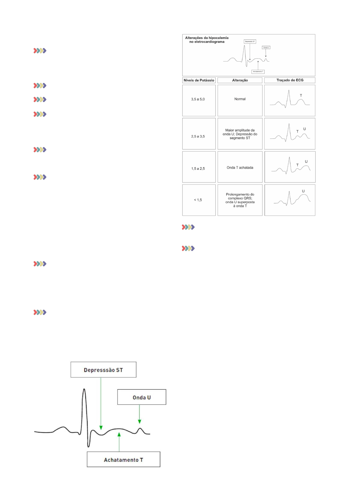 Distúrbios do potássio Qualquer distúrbio, normalmente vem acompanhado do distúrbio de outros eletrólitos, por isso importante dosar todos os eletrólitos Distúrbios do Potássio 3,5 - 5,0mEq/l É predominantemente intracelular A ingesta de K+ = eliminação ➜ Logo todo K+ ingerido é eliminado sendo 90% pelo rim e 10% pelo TGI O K+ é reabsorvido ou secretado no túbulo coletor dependendo das condições Túbulo distal define se irá ser eliminado ➜ Depende-se também do transporte de Na+, assim o glomérulo precisa ter filtrado Na+ para eliminar o K+ ↳ Precisa ter volume o suficiente para isso ↳ É preciso que haja correto funcionamento da aldosterona Alterações do K+, é preciso SEMPRE pensar em coração e músculo Hipocalemia K+ < 3,5 mEq/L É preciso saber se traz alterações no ECG ➜ Alteração de onda T (achatada e invertida) ➜ Formação de onda U A primeira manifestação normalmente é PCR Abordagem Diagnóstica ➜ K+ < 2,5mEq/L → GRAVE → Tratamento imediato ➜ K+ < 3,5mEq/L → Via oral ➜ Se alteração de ECG tratar independente de sintomas ou não ➜ Normalmente tem-se paralisia muscular ➜ Importante: Velocidade de instalação, ou seja, há quanto tempo ocorreu, mas normalmente não dá para saber disso, pois muitas vezes o paciente não sabe relatar ➜ Monitorização: Cardioscopia ➜ Fluxograma: ↳ Anamnese ↳ EF: Diarreia, diurético ↳ Drogas: Trato a causa/hipocalemia, não necessito prosseguir investigação ➜ Investigação laboratorial/diagnóstica ↳ Se HAS: Hiperaldo/HRV ↳ Sem HAS ↪ Perda renal ↪ Perda TGI ↪ Shift trancelular: insulina - β2-agonista - paralisia oeruiódica hipocalêmica ➤ Pode ser transferido do meio intravascular para o meio intracelular, logo o K+ está normal, mas está deslocado. Gerando hipocalemia pelo uso dessas drogas ➜ DAB Causas: ➜ TGI: ↳ Diarreia ↳ Vômitos (alcalose hipoclorêmica e hiperaldosteronismo secundário) ➜ Renais: ↳ Medicamentosa ↳ Hiperaldosteronismo ↳ Síndromes de Liddle, Bartter e Gitelman ↳ ATR tipo I e II ↳ Hipomagnesemia ➜ Medicamentosa: ↳ Diuréticos tiazídicos e de alça ↳ ATB → Gentamicina, penicilina, oxacilina, anfotericina ↳ Cisplatina, foscarnet, ifosfamida Tratamento 300 ml SF0,9 + 3 ampolas de KCl Durante 3h ➜ Imediato: Paralisiahipocalêmica/sintoma neuromucular ➜ Arritmias cardíacas/ECG ➜ Importante dosar Mg2+, pois se ele estiver baixo não é possível corrigir o K+ Hipercalemia Apresentação farmacêutica Concentração Cloreto de potássio 6%, solução oral 8 mEq/10ml Cloreto de potássio 10%, solução oral ou ampola (IV) 13 mEq/10ml Cloreto de potássio 10,1%, solução oral ou ampola (IV) 25 mEq/10ml Fosfato de potássio 20 mEq/10ml Cloreto de potássio 600mg (Slow K) 8 mEq/10ml Citrato de potássio (Lifocit) 10 mEq/10ml K+ > 5 mEq/L Paciente com hipercalemia é preciso ser monitorado ➜ Se não houver alteração no ECG e K+ < 6,5, não é preciso tratar de imediato ➜ K+ > 6,5 - tratar independente do ECG ↳ Risco de PCR ➜ ECG alterado - Tratar independentemente se K+ > 6,5 ↳ As alterações eletrocardiográficas são importantes porque podem afetar a função cardíaca normal e aumentar o risco de arritmias graves, como a fibrilação ventricular. A identificação precoce dessas alterações no ECG pode ajudar os médicos a diagnosticar a hipercalemia e intervir prontamente para corrigir os níveis de potássio e prevenir complicações cardiovasculares. Tratamento ➜ Hipercalemia grave ≥ 6,5mEq/l OU alteração de ECG ↳ Medida inicial: Gluconato de cálcio → 1 a 3 ampolas de 10 a 30 ml EV 30 - 60min em 100 ml de SF → Pico de ação de 30 a 60min, devendo ficar monitorando ↳ Glico-insulina - Shift → Venoso Glicose hipertônica 50% (100ml - 50g) + 10 UI insulina correndo de 20 a 30 min. ↪ Paciente com glicemia > 250 não precisa colocar glicose ↳ β2-agonista (Fenoterol) - Shift → Inalatório → 1 a 4 puffs de 6/6h ↳ Bicarbonato de sódio - Shift → Venoso → 0,5 - 1 mEq/Kg em bolus ↳ Diurético de alça: excreção de potássio - Eliminação → Venoso → Furosemida 0,5 a 1 mg/Kg EV ↳ Se não resolver (hipercalemia refratária) → Hemodiálise Observação: Gluconato de Cálcio para estabilizar fibras do coração → Es tab i l i zação membrana cardiomiocito Se estiver urinando ⇀ SF (chega Na e urina K) ⇀ Furosemida se PA regulada Se não estiver urinando ⇀ Nebulização com Berotec de 6/6h ⇀ Glicoinsulinoterapia (insulina tira o K+ migrando do intravascular para o intracelular, mas abaixa glicose, por isso deve-se dar glicose junto) ⇀ Sorcal - Resina trocadora ⇀ Bicarbonato 8/8h