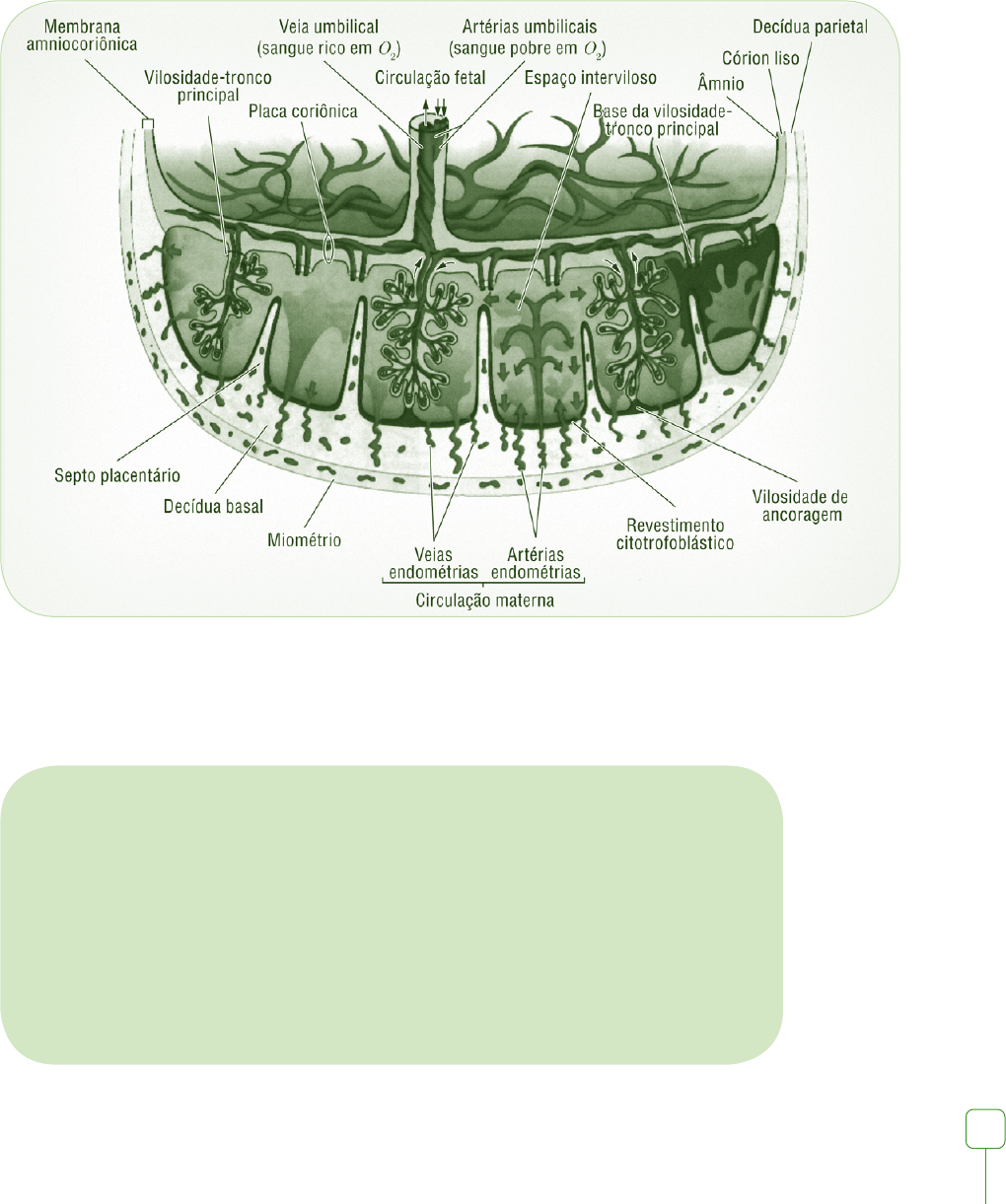 Aula 8 Reprodução Humana 193 Placenta A placenta é um órgão materno-fetal formado pelo córion viloso (porção fetal) e pela decídua basal (porção materna). O córion e a decídua estão separados por uma fi na camada de citotrofoblasto e por espaços intervilosos provenientes das lacunas do sinciciotrofoblasto. O córion viloso é dividido em pequenas porções chamadas cotilédones, formados pela presença de septos oriundos da decídua basal. Cada cotilédone possui uma ou duas vilosidades coriônicas bem desenvolvidas e ramifi cadas seguidas pelo espaço interviloso (Figura 14). Figura 14 – Desenho de um corte transversal da placenta, mostrando a relação do córion viloso com a decídua basal e as circulações placentárias materna e fetal Fonte: Moore e Persaud (2008). Como funciona a circulação placentária O sangue fetal chega à placenta através das duas artérias umbilicais que se ramifi cam por todo córion e formam os vasos sanguíneos das vilosidades. Essas artérias se dividem cada vez mais, formando redes de capilares nas ramifi cações terminais das vilosidades através das quais ocorrerão as trocas de nutrientes entre a mãe e o feto. Os capilares sanguíneos se reúnem em vasos Aula 8 Reprodução Humana194 venosos que se unem para formar a veia umbilical, vaso que transporta o sangue agora rico em nutrientes, oxigênio e outras substâncias de volta para o feto. Já o sangue arterial materno chega à placenta através das artérias espiraladas do endométrio presentes em toda decídua basal. Essas artérias liberam seu conteúdo nos espaços intervilosos, permitindo que as vilosidades fi quem banhadas pelo sangue materno (fi gura 14). Para entrar em contato com o sangue fetal, o sangue materno precisa se difundir pela membrana placentária que divide a circulação materna da fetal. Até a vigésima semana, a membrana placentária é formada por sinciciotrofoblasto, citotrofoblasto, tecido conjuntivo da vilosidade (mesoderma extraembrionário) e pelo endotélio dos capilares sanguíneos. A partir da vigésima semana, a membrana placentária torna-se mais fi na devido ao desaparecimento do citotrofoblasto e, em algumas regiões, do sinciciotrofoblasto também. Isso facilita a troca de nutrientes entre a mãe e o feto, porém, permite também a passagem de substâncias nocivas a esse feto. As principais funções da placenta estão basicamente envolvidas com o metabolismo de substâncias, o transporte e a secreção hormonal. Como função metabólica, pode-se citar a síntese de glicogênio e ácidos graxos importantes para a nutrição inicial do feto. As principais substâncias transportadas através da membrana placentária são: os gases oxigênio, dióxido de carbono e monóxido de carbono; as substâncias nutritivas como água, glicose, aminoácidos e vitaminas; os hormônios, principalmente os esteroides, como a testosterona, passam livremente pela membrana placentária; os eletrólitos; os anticorpos maternos, que são importantes para conferir imunidade ao feto, pois o seu sistema imunológico ainda não está maduro; os produtos de excreção como ureia e ácido úrico; as drogas; alguns agentes infecciosos, como o vírus da rubéola, o Toxoplasma gondii, causador da toxoplasmose, e o Treponema pallidum, causador da sífi lis. A termo, a placenta apresenta uma forma discoide com diâmetro entre 15 e 20 centímetros, espessura entre 2 e 3 centímetros e um peso que varia de 500 até 600 gramas.