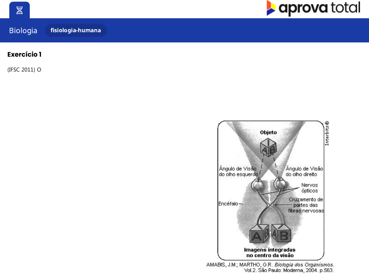Biologia �siologia-humana Exercício 1 (IFSC 2011) O microscópio composto é normalmente chamado de microscópio óptico... a luneta astronômica é um microscópio óptico...os telescópios são aprimoramentos das lunetas astronômicas...a máquina fotográfica e a filmadora são instrumentos ópticos. O órgão humano que atua como se fosse um instrumento óptico é (são)... Exercício 2 (IFSP 2017) Assinale a alternativa que define corretamente as propriedades organolépticas da matéria. Exercício 3 (G1 - CFTMG 2019) Usar a tecnologia para melhorar a vida de pessoas com deficiência tem sido um dos objetivos de trabalhos apresentados pelo CEFET-MG em eventos científicos locais. Estudantes do Curso Técnico em Equipamentos Biomédicos desenvolveram o projeto “Vision DC – Diferenciador de cédulas de dinheiro para deficientes visuais”, orientados pelo professor Renato Zanetti. O aparelho informa a cor das cédulas através de um alto falante ou fone de ouvido, identificando, assim, o valor das notas. 27ª Mostra Específica de Trabalhos e Aplicações do CEFET-MG. Disponível em: <http://cefetmg.br/noticias/arquivos/2017/10/noticia048.html> Acesso em: 22 Set 2018. O aparelho que diferencia as cédulas, desenvolvido pelos estudantes do CEFET-MG, substitui a função Exercício 4 (UFSM 2011) Os vertebrados se disseminaram por diversos ecossistemas, alcançando amplo sucesso. Nos vertebrados endotérmicos, como a espécie humana, esse sucesso pode ser observado pelo desenvolvimento de seu sentido de visão. Com base nessa informação, analise as afirmativas: I. A visão binocular dos humanos, através da sobreposição de imagens proporcionada por cada olho, permite estimar a distância em que se encontra um objeto. II. Cones são fotorreceptores extremamente sensíveis à luz; já bastonetes permitem a visão em cores. III. Problemas de visão podem ocorrer, como a miopia, que consiste na focalização incorreta de objetos mais próximos do observador, sendo a imagem formada depois da retina. IV. Ao atingir a retina, a imagem é veiculada, através do nervo óptico, até o encéfalo. Estão corretas Exercício 5 a) as mãos. b) o pavilhão auditivo externo. c) as fossas nasais. d) a boca. e) os olhos. a) São definidas como organolépticas as propriedades nas quais o organismo não sofre um fenômeno químico; ele pode ser dividido sem se alterar. b) São propriedades dadas por dois organismos que não ocupam o mesmo lugar ao mesmo tempo. c) São um tipo de fenômeno químico que um dado organismo específico sofre. d) Ocorrem quando os organismos tendem a se manter como estão (em repouso ou em movimento). e) São propriedades que impressionam pelo menos um dos cinco sentidos (tato, visão, olfato, audição e paladar). a) da íris. b) da cóclea. c) dos cones. d) dos canais semicirculares. a) apenas I e II. b) apenas I e IV. c) apenas II e III. d) apenas III e IV. e) I, II, III e IV. (UECE 2017) Condições externas e internas do corpo são os órgãos do sentido, sobre os quais são feitas as seguintes afirmações: I. As células sensoriais detectoras do paladar se agrupam nas papilas gustativas, localizadas sobre a língua e o palato mole, que são classificadas em 4 tipos básicos: circunvaladas, fungiformes, foliadas e filiformes. II. A retina contém dois tipos de células fotorreceptoras: os bastonetes e os cones. Os bastonetes permitem a visão em cores enquanto os cones são os únicos estimulados em ambiente pouco iluminado. III. A detecção do toque ocorre através de mecanorreceptores. As regiões mais sensíveis do corpo apresentam corpúsculos de Meissner e discos de Merkel e as regiões mais profundas da pele, os corpúsculos de Paccini. É correto o que se afirma em Exercício 6 (ENEM 2015) Entre os anos de 1028 e 1038, Alhazen (lbn al- Haytham: 965-1040 d.C.) escreveu sua principal obra, o Livro da Óptica, que, com base em experimentos, explicava o funcionamento da visão e outros aspectos da ótica, por exemplo, o funcionamento da câmara escura. O livro foi traduzido e incorporado aos conhecimentos científicos ocidentais pelos europeus. Na figura, retirada dessa obra, é representada a imagem invertida de edificações em tecido utilizado como anteparo. Se fizermos uma analogia entre a ilustração e o olho humano, o tecido corresponde ao(à): Exercício 7 (CFTMG 2015) Observe a estrutura indicada pela seta na imagem a seguir. O tipo de contração muscular que ocorre nessa estrutura é semelhante àquela que acontece na(no) Exercício 8 (CPS 2014) O órgão dos sentidos responsável pela audição é a nossa orelha, também chamada comumente de ouvido. Os problemas de ouvido são muito comuns com viajantes que enfrentam variações de altitude, pois as alterações de pressão, durante essas viagens, fazem com que os indivíduos fiquem com a a) I, II e III. b) I e II apenas. c) I e III apenas. d)II, III e IV e)II e IV a) íris b) retina c) pupila d) córnea e) cristalino a) língua. b) bíceps c) esôfago. d) panturrilha. sensação de ter os ouvidos tapados, o que provoca dificuldade auditiva e dor. Assim, por exemplo, quando alguém desce a serra em direção ao litoral, e a pressão atmosférica aumenta, ficando maior do que a pressão interna da sua orelha média, o tímpano é empurrado para dentro dificultando a audição. Essa situação, no entanto, é temporária porque na orelha média há um canal flexível chamado de tuba auditiva que se comunica com a faringe (garganta), por isso ao bocejar ou engolir saliva, ocorre a abertura das tubas nas orelhas, o que equilibra as pressões dos dois lados (anterior e posterior) de cada membrana timpânica e faz com que a dor e a sensação de surdez cessem. Baseando-se no texto, é correto afirmar que Exercício 9 (ENEM 2017) A retina é um tecido sensível à luz, localizado na parte posterior do olho, onde ocorre o processo de formação de imagem. Nesse tecido, encontram-se vários tipos celulares