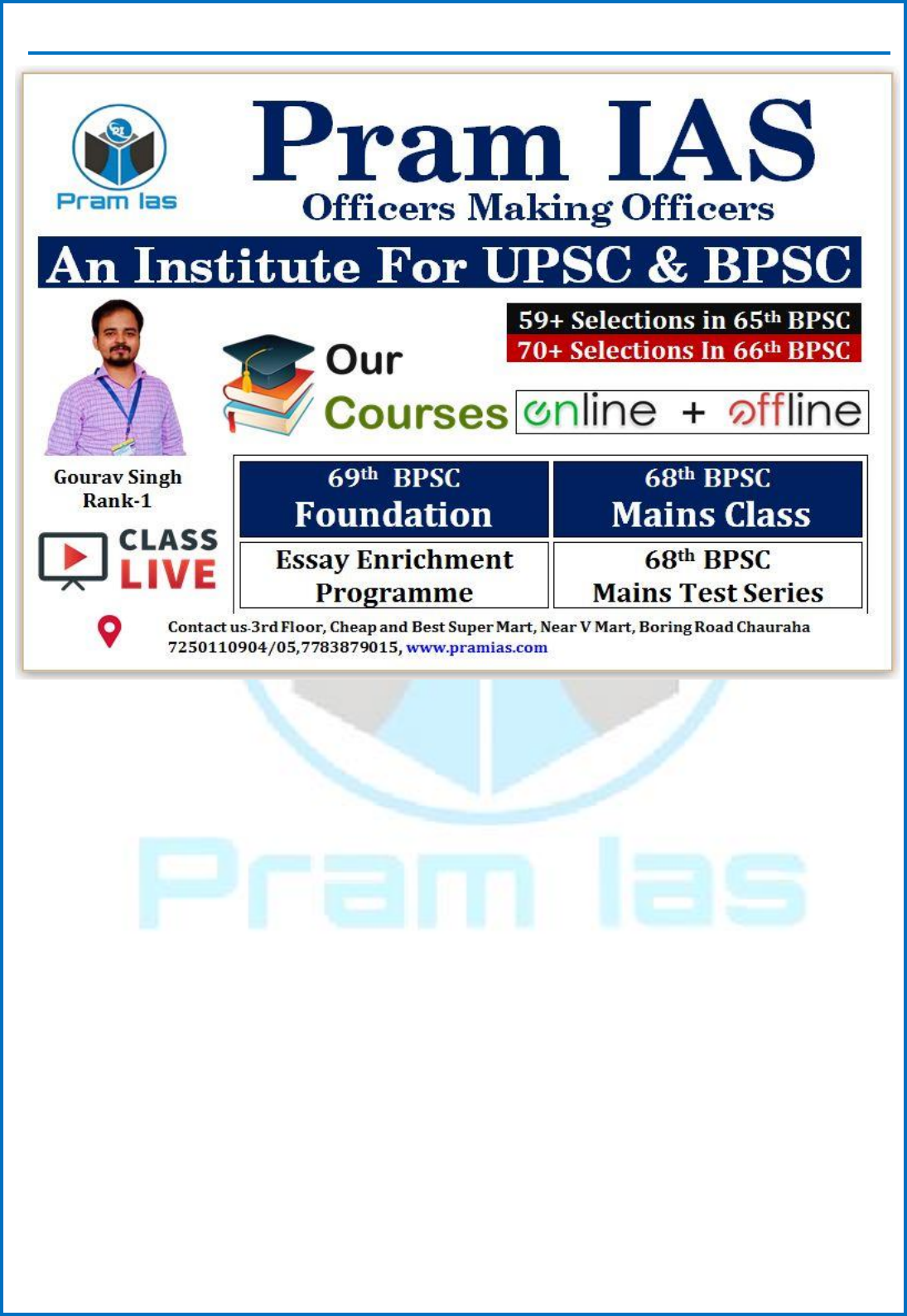 Pram IAS Bihar Special MCQ 1. Find the wrong match:/ गलत ल : A. Valmiki wildlife sanctuary - West Champaran B. Kaimur wildlife sanctuary - Rohtas C. Vikramshila wildlife sanctuary - Begusarai D. Bhimbandh wildlife sanctuary - Munger E. None of the above / More than one of the above 2. The Indian National Congress Session of 1922 was held at which place in Bihar? 1922 त प त ग ? A. Gaya B. Patna C. Haripura D. Ramgarh Pram IAS Bihar Special MCQ E. None of the above / More than one of the above 3. The plywood industry in Bihar is located in A. Hajipur B. Katihar C. Bhagalpur D. Kishanganj E. None of the above / More than one of the above 4. Famous Sufi Saint of Bihar Sharfuddin Maneri is related to which Sufi order? त ? A. Kubrawi B. Firdausi C. Chisti D. Suhrawardi E. None of the above / More than one of the above 5. The Champaran Movement was basically against ? प ल ल प ल ? A. Land revenue/ B. Agricultural policies of the British Government/ त C. ल Cash crops/ D. Land grants/ E. None of the above / More than one of the above 6. Who said, “Wherever I am, there is Jagdishpur”? , " , ग प "? A. Amar Singh B. Kunwar Singh Pram IAS Bihar Special MCQ C. Rani Lakshmibai D.General Lloyd E. None of the above / More than one of the above 7. Which was the first English newspaper published from Patna? प त ल प ल ? A. The Indian Nation B. The Bihar Herald C. The Mirror D. Hindu Patriot E. None of the above / More than one of the above 8. Bihar state is situated between which of the following longitudes? ल त त त ? A. about 84 East to 88 East B. about 80 East to 84 East C. about 80 East to 88 East D. about 83 19'50'' East to 88 17'40'' East E. None of the above / More than one of the above 9. In the decade of 1830, Patna city was not the centre of 1830 प ल ? A. Wahabi Movement B. Munda Revolt C. Godkhari Revolt D. Sanyasi Revolt E. None of the above / More than one of the above 10. Who formed the Ravidas Sabha in Bihar in 1928? 1928 गठ ? A. Mahatma Gandhi B. Jagjivan Ram C. Karpoori Thakur Pram IAS Bihar Special MCQ D. Sant Ravidas E. None of the above / More than one of the above 11. Where was the first Zila School opened in 1835? 1835 प ल ल ल ल ग ? A. Patna B. Darbhanga C. Ranchi D. Muzaffarpur E. None of the above / More than one of the above 12. The word ‘Bihar’ originally means ' ' ल … A. Buddhist Monastery/ ठ B. Land of Angels/ ग त C. Arya Pradesh/ D. Land of Greenery/ ल E. None of the above / More than one of the above 13. The Son River, which joins the Ganga river in Bihar, originates from ग ग ल ल त ? A. Hazaribagh Plateau B. Palamu Plateau C. Malwa Plateau D. Amarkantak Plateau E. None of the above / More than one of the above 14. Where was the battle between Sher Shah and Humayun fought on 26 June, 1539? 26 , 1539 औ ? A. Teliyagarhi Pram IAS Bihar Special MCQ B. Rohtas C. Chunar D. Chausa E. None of the above / More than one of the above 15. In which year was Ali Gauhar’s Bihar expedition ended? ल ग ? A. 1761 B. 1757 C. 1764 D. 1759 E. None of the above / More than one of the above 16.After the death of Alivardi Khan who became the Nawab of Bengal? ल ग ल ? A. Mir Qasim B. Sirajuddaula C. Murshid Quli Khan D.Saadat Khan E. None of the above / More than one of the above 17. The highest part of Ramnagar Dun is… A. Someshwar fort B. Barabar C. Gridhkut D. Santpur E. उपरोक्त में से कोई नह ीं / उपरोक्त में से एक से अधिक 18. Phagu Chauhan became Governor of Bihar on which date? ग त प ल ? A. 29 July, 2019 B. 29 July, 2020 Pram IAS Bihar Special MCQ C. 29 July, 2021 D. 29 July, 2006 E. उपरोक्त में से कोई नह ीं / उपरोक्त में से एक से अधिक 19. Expansion of Tarai Region in Bihar is त ….. A. Parallel to the India-Nepal boundary/ त- प ल त B. Parallel to the North bank of Chhotanagpur plateau/ गप पठ त त C. Parallel to the East bank of Rohtas plateau/ त पठ प त त D. Parallel to the West boundary of Rajmahal mountain series/ ल प त ल प त E. उपरोक्त में से कोई नह ीं / उपरोक्त में से एक से अधिक 20. In Bihar though ‘Zamindari’ was statutorily abolished in 1952, the social base of land control remained in the grip of प 1952 ' ' प ग , प ? A. Middle Caste Hindus B. Dominant Caste Hindus C. Scheduled Tribe Hindus D. Scheduled Caste Muslims E. None of the above / More than one of the above 21. North Bihar is most famous for ल त ल ? A. Flood/ B. Famine/ ल Pram IAS Bihar Special MCQ C. Heavy industries/ ग D. Agricultural prosperity/ प त E. None of the above / More than one of the above 22. Which one of the following is the largest city of Bihar ? ल त ? A. Patna B. Gaya C. Begusarai D. Ara E. None of the above / More than one of the above 23. Where is Telhar waterfall located in Bihar? A. Gaya B. Kaimur C. Vaishali D. Ara E. None of the above / More than one of the above 24. Bihar State has the highest number of people below the poverty line due to ल त ग ल ग ? A. Failure of Land reforms/ लत B. Lack of political will/ त C. Large number of labour class/ ग D. Flood/ E. None of the above / More than one of the above 25. The principal foodgrain crops of Bihar are ल … A. Sugarcane, tea and barley/ ग , औ Pram IAS Bihar Special MCQ B. Rice, wheat and maize/ ल, ग औ C. Groundnut, coffee and wheat/ ग ल , औ ग D. Tea/ E. None of the above / More than one of the above 26. Which is the main cash crop of Bihar state? ल ? A. Coconut and Coffee B. Rubber C. Tea D. Sugarcane E. उपरोक्त में से कोई नह ीं / उपरोक्त में से एक से अधिक 27. Which city of Bihar is surrounded by five hills? प प ? A.
