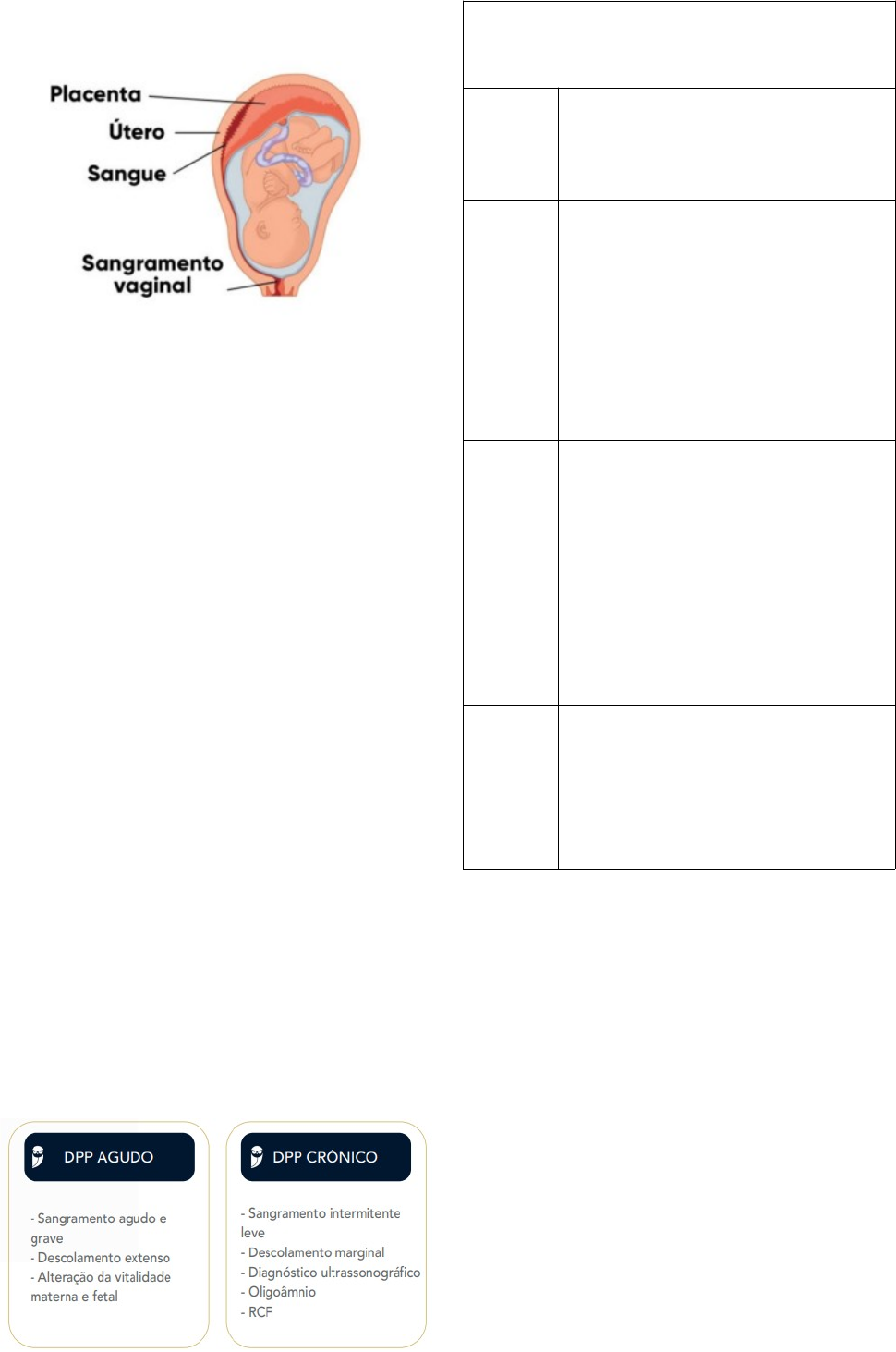 Descolamento prematuro de placenta DEFINIÇÃO Descolamento prematuro de placenta (DPP) é a separação parcial ou total da placenta, normalmente inserida, antes do nascimento do feto. Esse diagnóstico é feito para gestações de 20 semanas ou mais, isto é, a partir da segunda metade da gestação. TIPOS DE DPP – agudo ou crônico → DPP AGUDO O DPP agudo é a forma clássica e mais comum de descolamento. O sangramento é agudo, grave e extenso e os sintomas estão relacionados à intensidade do sangramento e do descolamento da placenta, provocando, com frequência, alteração das vitalidades fetal e materna. Por isso, trata-se de uma emergência obstétrica e o diagnóstico é clínico, baseado nos sinais e sintomas da paciente. → DPP CRÔNICO O DPP crônico ocorre em 20% dos casos e caracteriza-se por sangramento crônico e intermitente, que se inicia geralmente no segundo trimestre. Os sintomas são frustros e, geralmente, o diagnóstico é ultrassonográfico. Pode ocorrer oligoâmnio, restrição de crescimento fetal, pré-eclâmpsia e rotura prematura pré-termo de membranas. Na ultrassonografia obstétrica é possível identificar um hematoma retroplacentário. CLASSIFICAÇÃO DO DPP AGUDO CLASSIFICAÇÃO DE SHER AND STALAND (considera achados clínicos e laboratoriais) GRAU 0 (mudança recente na classificação) • DPP assintomático • Diagnosticado após o parto, pela avaliação anatomopatológica da placenta GRAU 1 • Sangramento discreto • Sem hipertonia uterina • Vitalidade fetal preservada • Sem repercussão na hemodinâmica materna • Sem coagulopatia • Diagnóstico no pós-parto com identificação de coágulo retroplacentário GRAU 2 • Sangramento moderado • Hipertonia uterina com contrações tetânicas • Vitalidade fetal com sinais se sofrimento fetal • Hemodinâmica materna com taquicardia e alterações posturais da PA • Alterações iniciais de coagulopatia, com queda de fibrinogênio GRAU 3 • Sangramento importante • Hipertonia uterina • Óbito fetal • Hipotensão arterial materna → 3A: sem coagulopatia instalada → 3B: com coagulopatia instalada COMPLICAÇÕES * Dependem da severidade do descolamento da placenta e da IG em que o parto ocorre → MATERNAS: hemorragia, anemias, coagulopatias, hemotransfusões, cesárea, histerectomia e morte * As hemorragias podem levar ao choque hipovolêmico, insuficiência renal por necrose cortical aguda, falência de múltiplos órgãos. * O DPP é a principal causa de CIVD e de necrose cortical aguda renal em obstetrícia → PERINATAIS: prematuridade, RCF, baixo peso ao nascer, sofrimento fetal e óbito perinatal FATORES DE RISCO → A história obstétrica prévia de DPP é o principal fator de risco para a ocorrência de um novo descolamento, sendo o risco de recorrência em torno de 10 a 15 vezes maior. Os distúrbios hipertensivos na gestação, por sua vez, são as patologias que mais se associam com DPP, aumentando em torno de 5 vezes o risco. QUADRO CLÍNICO → DOR ABDOMINAL • Varia de leve desconforto a dor intensa • Pode ou não estar associada a sangramento vaginal • Associada ao aumento do tônus uterino = taquihiperssistolia até hipertonia • OBS: dor é lombar se placenta for de inserção posterior → SANGRAMENTOS – podem se manifestar de 3 maneiras: • Hemorragia exteriorizada • Hemoâmnio • Sangramento retroplacentário e infiltração sanguínea intramiometrial – é oculto, útero-placentária ou “útero de Couvelaire”, fica com aspecto arroxeado = derramamento de sangue do interior do órgão, o útero não consegue se contrair, levando à atonia uterina e causa hemorragia pós-parto, que respondem muito pouco ao tratamento com uterotônico, geralmente evoluindo para histerectomia puerperal. * Primeiro o que ocorre é o útero lenhoso (por contrações de grande intensidade, útero fica duro), o “útero de Couvelaire” é evolução do útero lenhoso no descolamento prematuro de placenta, que fica amolecido porque sangue infiltrou por todas as fibras. Conduta: histerectomia • OBS: quantidade pode não refletir a exata perda e, se escuro, pode significar formação de coágulos Útero de Couvelaire → COAGULOPATIAS • Coágulo retroplacentário consome fatores de coagulação e descolamento faz com que seja liberada tromboplastina na circulação materna, causando coagulação intravascular disseminada • INICIALMENTE: alterações posturais da pressão e/ou taquicardia • TARDIAMENTE: sinais de instabilidade circulatória • Se sinais e sintomas de choque presentes = perda de até 30% da volemia DIAGNÓSTICO O diagnóstico de DPP é eminentemente CLÍNICO, por meio da apresentação dos seguintes sinais e sintomas: • Início abrupto do sangramento vaginal, que pode ser de intensidade leve a grave. • Dor abdominal súbita. • Dor à palpação do útero (hipersensibilidade uterina). • Contrações uterinas, taquissistolia. • Hipertonia uterina (útero lenhoso). • Hipotensão, taquicardia. • Alteração da frequência cardíaca fetal. • Trabalho de parto prematuro. • Bolsa corioamniótica tensa ao toque. → O sangramento vaginal ocorre em torno de 80% dos casos, mas a perda sanguínea é, na maioria das vezes, subestimada, porque a maior parte do sangramento fica retida no útero. Por isso, a quantidade de sangramento vaginal não se correlaciona com o grau de descolamento e não serve como um marcador de risco materno ou fetal. → Por outro lado, as presenças de dor abdominal intensa, hipotensão e alteração da frequência cardíaca fetal indicam gravidade e sugerem descolamento extenso. → Quando o descolamento da placenta excede 50%, a ocorrência de coagulação intravascular disseminada e morte fetal é mais comum. A coagulação intravascular disseminada ocorre em 10 a 20% dos quadros de DPP graves com óbito fetal. Sabemos que o DPP é a causa mais comum de coagulopatia de consumo na gravidez. EXAMES: hem