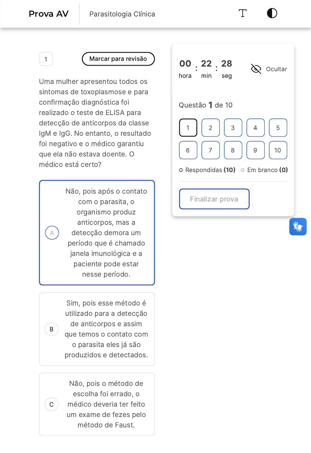 27/04/2024, 10:26 estacio.saladeavaliacoes.com.br/prova/662cf696ab6d34f3d6ba3a4b/ https://estacio.saladeavaliacoes.com.br/prova/662cf696ab6d34f3d6ba3a4b/ 1/10 A B C 1 Marcar para revisão Uma mulher apresentou todos os sintomas de toxoplasmose e para confirmação diagnóstica foi realizado o teste de ELISA para detecção de anticorpos da classe IgM e IgG. No entanto, o resultado foi negativo e o médico garantiu que ela não estava doente. O médico está certo? Não, pois após o contato com o parasita, o organismo produz anticorpos, mas a detecção demora um período que é chamado janela imunológica e a paciente pode estar nesse período. Sim, pois esse método é utilizado para a detecção de anticorpos e assim que temos o contato com o parasita eles já são produzidos e detectados. Não, pois o método de escolha foi errado, o médico deveria ter feito um exame de fezes pelo método de Faust. 00 hora : 22 min : 28 seg Ocultar Questão 1 de 10 Respondidas �10� Em branco �0� Finalizar prova 1 2 3 4 5 6 7 8 9 10 Prova AV Parasitologia Clínica 27/04/2024, 10:26 estacio.saladeavaliacoes.com.br/prova/662cf696ab6d34f3d6ba3a4b/ https://estacio.saladeavaliacoes.com.br/prova/662cf696ab6d34f3d6ba3a4b/ 2/10 D E A B Sim, pois esse método apresenta grande sensibilidade e especificidade e é o padrão ouro para esse diagnóstico. Não, pois o método de escolha foi errado, o médico deveria ter feito um exame de fezes pelo método de Wills. 2 Marcar para revisão O diagnóstico específico das helmintíases intestinais exige a escolha da técnica parasitológica adequada e a identificação morfológica, principalmente, de ovos nas fezes. Esta escolha deverá estar em consonância com características biológicas dos parasitos, como por exemplo, o local no corpo humano onde se encontra a maioria dos ovos. Indique o Método de diagnóstico mais adequado para o diagnóstico da enterobiose. Willis Kato-katz 27/04/2024, 10:26 estacio.saladeavaliacoes.com.br/prova/662cf696ab6d34f3d6ba3a4b/ https://estacio.saladeavaliacoes.com.br/prova/662cf696ab6d34f3d6ba3a4b/ 3/10 C D E A B C Bermann-morais Grahamn (fita gomada) Faust 3 Marcar para revisão Sabemos que existem vias indiretas e diretas de acordo com a infecção do parasito e sua relação com o hospedeiro. Acerca desse assunto leia as afirmativas a seguir: I. As vias diretas e indiretas são sempre transmitidas através do contato sexual. II. As duas vias de transmissão não podem ocorrer simultaneamente na mesma doença III. As vias indiretas de transmissão envolvem a via oral- fecal Está correto o que se afirma em: I. II. I e II. 27/04/2024, 10:26 estacio.saladeavaliacoes.com.br/prova/662cf696ab6d34f3d6ba3a4b/ https://estacio.saladeavaliacoes.com.br/prova/662cf696ab6d34f3d6ba3a4b/ 4/10 D E III. I e III. 4 Marcar para revisão As espécies do gênero Cryptosporidium são protozoários que infectam a maioria dos animais e representam uma causa significante de morbidade e mortalidade. A criptosporidiose é uma das causas mais comuns de diarreia não viral em humanos, de ocorrência mundial. Com relação ao C. parvum analise as afirmativas a seguir. I. Dentre as diversas formas de transmissão da criptosporidiose, destaca-se principalmente ingestão de carnes mal passadas contaminadas com os oocistos. II. Os oocistos infectantes são altamente resistentes aos fatores ambientais, incluindo o cloro, largamente utilizado no tratamento de água de abastecimento. III. Os oocistos são inativados pela maioria dos desinfetantes empregados em serviços de saúde (álcool, glutaraldeído, ácido peracético, ortoftaldeído, fenóis e quaternário de amônia). Está correto o que se afirma em: 27/04/2024, 10:26 estacio.saladeavaliacoes.com.br/prova/662cf696ab6d34f3d6ba3a4b/ https://estacio.saladeavaliacoes.com.br/prova/662cf696ab6d34f3d6ba3a4b/ 5/10 A B C D E A B C III. I. I e III. I e II. II. 5 Marcar para revisão A leishmaniose (úlcera de Bauru) e a tripanossomíase (doença de chagas) são parasitoses cujos vetores são, respectivamente, o mosquito-palha e o barbeiro. A leishmaniose e a tripanossomíase são doenças: Transmitidas diretamente pela picada de mosquitos. Prevenidas por meio de saneamento básico Causadas por protistas flagelados. 27/04/2024, 10:26 estacio.saladeavaliacoes.com.br/prova/662cf696ab6d34f3d6ba3a4b/ https://estacio.saladeavaliacoes.com.br/prova/662cf696ab6d34f3d6ba3a4b/ 6/10 D E A B C D E Prevenidas por meio de campanhas de vacinação de animais domésticos. Classificadas como verminose e zoonose, respectivamente. 6 Marcar para revisão Os estados febris (picos de febre) que ocorrem no indivíduo com malária são devidos à/ao Invasão do fígado pelo plasmódio. Migração dos protozoários para as zonas do cérebro que regulam a temperatura. Liberação de substância tóxica quando da ruptura simultânea de milhares de hemácias. Reprodução sexuada do protozoário no baço do indivíduo infectado. Aumento excessivo do pâncreas, que passa a produzir mais insulina. 27/04/2024, 10:26 estacio.saladeavaliacoes.com.br/prova/662cf696ab6d34f3d6ba3a4b/ https://estacio.saladeavaliacoes.com.br/prova/662cf696ab6d34f3d6ba3a4b/ 7/10 A B C 7 Marcar para revisão Enterobius vermicularis é um parasito que possui um único hospedeiro. A passagem do parasito de uma pessoa para outra faz-se pela transferência dos ovos, que devem permanecer pelo menos algumas horas no meio exterior para tornarem-se infectantes. Sobre as formas de transmissão de E. vermicularis, está correto afirmar que: A forma de infecção mais frequente é por meio da ingestão de carne de boi ou porco mal cozidas. A infecção de um novo hospedeiro dá-se geralmente pela inalação ou ingestão dos ovos disseminados por via aérea. A transmissão indireta da região anal para a boca, através das mãos contaminadas, não ocorre com frequência. 27/04/2024, 10:26 estacio.saladeavaliacoes.com.br/prova/662cf696ab6d34f3d6ba3a4b/ https://estacio.saladeavali