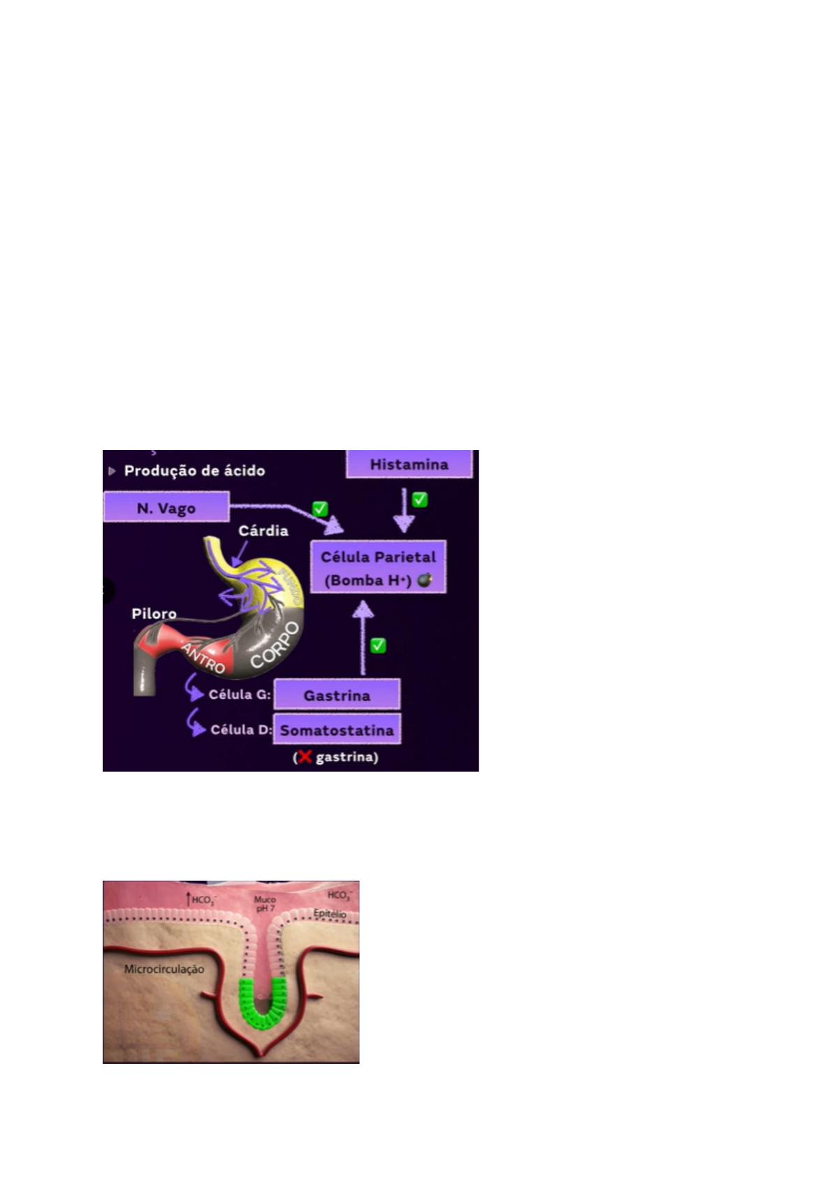 Doenças do estômago ➢ Noções gerais ○ Produção de ácido no fundo gástrico onde há as células parietais (bomba de próton) ■ Vias que estimulam as células parietais: ● No Antro: ○ células G produzem gastrina ○ células D produzem somatostatina que inibem a produção de gastrina ● N. vago: a acetilcolina estimula a produção de ácido nas células parietais ● Histamina: produzida pelas células enterocromafins like. Ex ranitidina ➢ Proteção estomacal: ○ Barreira de mucosa gástrica - devido a ação de prostaglandinas: muco, bicarbonato (HCO3), fluxo sanguíneo, renovação celular Doença ulcerosa péptica ➢ Pode ocorrer tanto no estômago quanto no duodeno Fisiopatologia ➢ Desbalanço em relação entre os fatores de agressão e de proteção (ácido > barreira de mucosa gástrica). ➢ Facilitadores: ○ H pylori ○ AINE ➢ H pylori ○ Infecção no antro em um primeiro momento. As células D são as principais afetadas, inibindo a produção de gastrina. Dessa forma, não inibe mais a produção de gastrina, gerando hipercloridria. → DUP ○ Infecção disseminada: acomete as células parietais produtoras de ácido, gerando hipocloridria. Há também a redução dos fatores de proteção → DUP ➢ AINE ○ Inibição da cox → DUP ■ Cox 1: estimula prostaglandinas ■ Cox 2: estimula resposta inflamatória ○ Obs: os coxibs são seletivos para a cox2, mas aumentam os riscos cardiovascular Clínica ➢ Dispepsia ○ Dor e queimação epigástrica (azia) ○ Saciedade precoce ○ Plenitude pós prandial ➢ Há diferentes tipos de dispepsia (funcional/ por helicobacter) ➢ Dispepsia com dor clássica = dispepsia por úlcera péptica ➢ DUP no estômago - a dispepsia é pior com alimentos ➢ DUP no duodeno - dispepsia após 2-3 horas após alimentação ➢ Obs: Pirose (queimação retroesternal ascendente) + refluxo (volta do conteúdo gástrico) - Pensar em DRGE Diagnóstico ➢ A endoscopia digestiva só fazemos quando risco de câncer ➢ Sempre investigar H pylori ➢ Paciente jovem e sem alarme: diagnóstico presuntivo ➢ Quando solicitar EDA para descartar neoplasias? ○ > 45 anos ○ Sintomas de alarme ➢ Obs: úlceras do duodeno tem chances ínfimas de serem CA, mas úlceras de estômago, temos que fazer a biópsia. ➢ Como pesquisar H. pylori? ○ Endoscopia digestiva (invasivo) com teste de urease/ biópsia/ cultura ○ Sem endoscopia (não invasivo) com teste de ureia respiratória/ ag fecal/ sorologia (não serve para controle de cura) → sempre investigar infecção de h pylori. Tratamento da doença ulcerosa péptica ➢ Terapia anti secretora ácida ○ Inibidor de bomba de próton (padrão ouro) - omeprazol 20 mg/ pantoprazol 40 mg/ esomeprazol 40 mg ○ Bloqueador histamínico - ranitidina/ cimetidina ➢ Tratar H. pylori (se presente): ○ Por 14 dias: ■ Claritromicina 500 mg 12/12 + ■ Amoxicilina 1g 12/12h + ■ Omeprazol 20 mg 12/12 h (IPB). ○ Após 4 semanas de tratamento: confirmar erradicação ➢ Úlceras H. pylori (-) ○ Suspender AINE ○ IBP por 4-8 semanas ○ Uso continuo se: síntomas refractarios, úlceras > 2 cm, uso de AINE ou múltiplas comorbidades ➢ Quando fiz endoscopia inicialmente, depois do tratamento devo repetir EDA? Não, se histopatológico negativo para CA: ○ Repetir EDA, se: sintomas recorrentes, úlceras gástricas > 2 cm, suspeitas de malignidade. Outras indicações de pesquisa de H pylori ➢ DUP/ Dispepsia ➢ Linfoma MALT ➢ Uso crônico de AINE ➢ Anemia ferropriva inexplicada ➢ Púrpura trombocitopênica idiopática ➢ Risco aumentado de CA gástrico (HFam 1 grau, após de CA gástrico) OPAA! Se paciente em uso de IBP = suspender 2 semanas antes da pesquisa de Hpylori Visão cirúrgica ➢ Tipos de úlcera - Classificação de Jhonson ○ Hipercloridria ■ Duodenal (sempre) - nuna associada a h. pylori ■ Gástrica II - corpo gástrico associada a uma úlcera duodenal ■ Gástrica III - pré pilórica ○ Hipocloridria ■ Gástrica I (Mais comum - 60% dos casos) - ocorre na pequena curvatura baixa ■ Gástrica IV - pequena curvatura alta Como diminuir a acidez cirurgicamente? ➢ Se hipercloridria (vagotomia + antrectomia) ○ Vagotomia ■ Vagotomia troncular + piloroplastia (para garantir esvaziamento) ● Como o n. vago tem a função de auxiliar no esvaziamento do piloro, geralmente, a cirurgia é associada a piloroplastia (pilorotomia - abre e sutura em uma direção oposta, retirando a função de esfíncter). ● O n. vago deve ser seccionada antes do ramo hepático - para preservar os ramos biliares e intestinais. ■ Vagotomia superseletiva (gastrica proximal) ● Retirar os ramos do n vago que vão para o fundo gástrico ● Tem altas taxas de recidiva ● Não é mais feita ○ Antrectomia ■ Se eu quiser intensificar a hipocloridria, há a possibilidade de fazer uma vagotomia troncular + antrectomia, pois é retirada as células G que produzem gastrina. ● No entanto, temos que fazer uma reconstrução do trânsito intestinal que pode ser de diferentes tipos. ○ Reconstrução do trânsito intestinal Billroth I - gastroduodenostomia Pego o coto do duodeno e ligo ao estômago Billroth II - gastrojejunostomia + alça aferente Ligo o jejuno ao coto. é usado quando há ressecções altas do antro. Deixo o duodeno (alça aferente), pois ela está recebendo o conteúdo biliopancreatica. ➢ Se úlceras gástricas: retirar a úlcera (câncer?) -> alguma gastrectomia ○ Gástrica I (pequena curvatura baixa) - Hipocloridria ■ Antrectomia + B I (gastroduodenostomia) ○ Gástrica II (corpo gástrico) - Hipercloridria ■ Vagotomia troncular + antrectomia + B II (gastrojejunostomia) ○ Gástrica III (pré pilórica) - Hipercloridria ■ Vagotomia troncular + antrectomia + B II (gastrojejunostomia) ○ Gástrica IV (pequena curvatura alta) - Hipocloridria ■ Gastrectomía subtotal + Y Roux (gastrojejunosanastomose + enteroenteroanastomose) ● A 