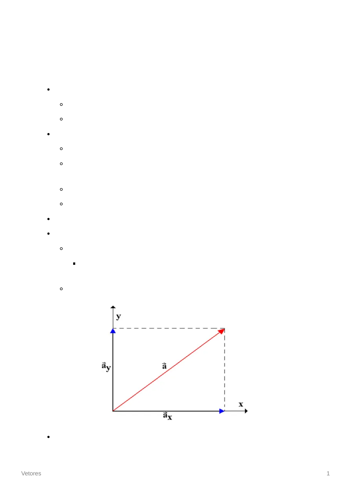 Vetores 1 Vetores Representar grandezas vetoriais Segmento de reta orientados (seta) ⇾ Grandezas vetoriais: módulo, direção e sentido Módulo: tamanho do vetor (quanto maior a força aplicada maior será a reta) Direção: vertical ou horizontal (se for em outra direção, provavelmente precisa decompor nessas direções) Sentido: direita, esquerda, para cima, para baixo obs: toda direção pode ter dois sentidos Na física: velocidade, força, campo elétrico Decomposição de vetores Determinar as componentes que formam um vetor As componentes de um vetor são as projeções desse vetor nos eixos coordenados (x,y) V→ = Vx→ + Vy→ Pode usar cosseno e seno para determinar Vx e Vy Vetores 2 Regra do paralelogramo - adição entre vetores Vr = √V1² + V2² + 2 ༝ V1 ༝ V2 ༝ cos Θ Vr: vetor resultante Casos especiais: Mesma direção e sentido Vr = V1 + V2 Mesma direção e sentidos contrário Vr = V1 - V2 Perpendiculares entre si (90°) Vr = √V1² + V2² Porque o cosseno de Θ = 0, anulando a multiplicação