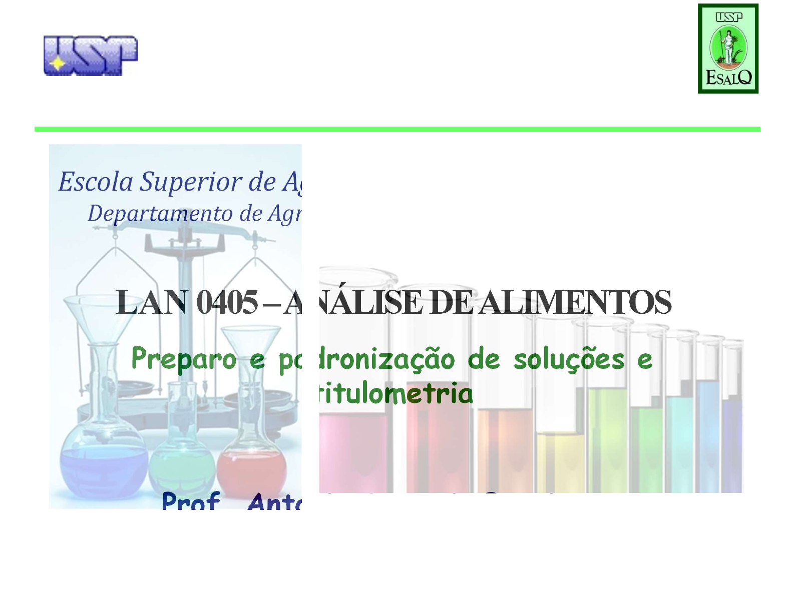 1 Universidade de São Paulo – USP Escola Superior de Agricultura “Luiz de Queiroz” – Esalq Departamento de Agroindústria, Alimentos e Nutrição - LAN LAN 0405 –ANÁLISE DE ALIMENTOS Preparo e padronização de soluções e titulometria Prof. Antonio Sampaio Baptista PREPARO DE SOLUÇÕES, PADRONIZAÇÃO E TITULAÇÃO Os alimentos são compostos por carboidratos, proteínas, lipídios, fibras, minerais, vitaminas, ácidos orgânicos, compostos fenólicos, flavonóides e outros componentes. A análise de alimentos pode ser realizada de diversas formas, através do uso de técnicas gravimétricas, análises cromatográficas, análises espectrofotométricas, análises de absorção atômica, análises por títulometria e por colorimetria. Em todas essas análises é essencial o preparo de soluções para a obtenção de respostas sobre a composição dos alimentos. Além disso, há técnicas que com o uso de soluções padronizadas, através de titulação é possível obter a concentração de determinados compostos em alimentos. Por esses motivos, os objetivos desta aula serão estudar o preparo de soluções, os cálculos de concentrações, a padronização de soluções e análise por titulação. Introdução PREPARO DE SOLUÇÕES, PADRONIZAÇÃO E TITULAÇÃO Introdução Sólido/líquido/gás PREPARO DE SOLUÇÕES, PADRONIZAÇÃO E TITULAÇÃO Introdução O solvente apresenta a capacidade de dissolver o soluto. Contudo, todo solvente tem um limite de capacidade dissolver o soluto. A essa capacidade se dá o nome de coeficiente de solubilidade. Portanto, o coeficiente de solubilidade é a capacidade que um solvente tem de dissolver um determinado soluto. O coeficiente de solubilidade sofre influência da temperatura e muda conforme o soluto. PREPARO DE SOLUÇÕES, PADRONIZAÇÃO E TITULAÇÃO Tipos de soluções a) Solução insaturada b) Solução saturada c) Solução supersaturada O que muda em cada uma dessas soluções é basicamente a quantidade de soluto que é dissolvido, ou não, pelo solvente e a característica em função da temperatura. a) Solução insaturada Uma solução insaturada é aquela em que a quantidade de soluto é inferior ao coeficiente de solubilidade do solvente, ou seja, o soluto é totalmente dissolvido pelo solvente, podendo o solvente dissolver mais soluto sem a necessidade de alterações de características físicas da solução. Considerações gerais PREPARO DE SOLUÇÕES, PADRONIZAÇÃO E TITULAÇÃO Tipos de soluções b) Solução saturada Uma solução saturada é aquela em que a quantidade de soluto está dentro do limite do coeficiente de solubilidade do solvente, ou seja, o solvente dissolve exatamente a quantidade máxima que consegue em condições normais de temperatura ambiente. c) Solução supersaturada Uma solução supersaturada é formada quando se altera algum fator como a temperatura ou a pressão do solvente, com isso aumentando o coeficiente de solubilidade do solvente. Dessa forma o solvente passa solubilizar uma quantidade maior de soluto do que conseguia em uma solução saturada. Considerações gerais PREPARO DE SOLUÇÕES, PADRONIZAÇÃO E TITULAÇÃO Considerações gerais CONCENTRAÇÕES DE SOLUÇÕES a) Concentração comum (Cc) A concentração comum é a relação direta de massa de um composto por volume de solução, ou seja, é a relação direta da proporção de soluto por volume de solvente. Cc = M/V Cc = concentração comum M é a massa do soluto (g) V é o volume do solvente (L) A unidade padrão de concentração comum é o grama por litro (g/L). PREPARO DE SOLUÇÕES, PADRONIZAÇÃO E TITULAÇÃO Considerações gerais CONCENTRAÇÕES DE SOLUÇÕES b) Título de uma solução () O título de uma solução é a relação direta entre a massa de soluto e de solvente em uma determinada solução. Pode ser dado por valor absoluto (adimensional) ou em percentagem, ou seja, o título é a relação de massas de solvente e soluto de uma determinada solução. = m (soluto)/m (solução), ou seja = m (soluto)/(m (soluto) + m (solvente)) O título em percentagem é dado quando pega-se o resultado do título e multiplica-se por 100. %= (m (soluto)/(m (soluto) + m (solvente))) * 100 PREPARO DE SOLUÇÕES, PADRONIZAÇÃO E TITULAÇÃO Considerações gerais CONCENTRAÇÕES DE SOLUÇÕES b) Título de uma solução () Exemplo de título de uma solução %= (m (soluto)/(m (soluto) + m (solvente))) * 100 1) Calcular o título de uma solução formada por 20 gramas de sal (NaCl) dissolvido em 100 mL de água. %= (m (soluto)/(m (soluto) + m (solvente))) * 100 %= (20)/(20 +100) * 100 % = 16,67 Massa (mA ; mB)/ g Quantidade de Matéria (nA; nB) / mols Volume (VA; VB) / L Volume Total (V) / L A B Líquido-Líquido Ex: Etanol-Água V ≠ VA+ VB Solução 10 PREPARO DE SOLUÇÕES, PADRONIZAÇÃO E TITULAÇÃO Solução PREPARO DE SOLUÇÕES, PADRONIZAÇÃO E TITULAÇÃO Unidades de Concentração % massa/massa (m/m) ou (p/p) (g / 100 g solução) x 100% volume/volume (v/v) (mL / 100 mLsolução) x 100% Teor alcoólico 70 % (m/m) Solução PREPARO DE SOLUÇÕES, PADRONIZAÇÃO E TITULAÇÃO Unidades de Concentração Molaridade (M) Molalidade (W) Mols Volume Massa M = W = Cálculos de concentrações de soluções químicas PREPARO DE SOLUÇÕES, PADRONIZAÇÃO E TITULAÇÃO A) Molaridade B) Molalidade A) Molaridade A molaridade (M) pode ser compreendida como a relação entre o número de mols de soluto por quilograma de solução. Esta relação é expressa pela seguinte equação: n (soluto) M = molaridade (mols/L) M = ------------------------ n = número de mols (soluto) V (solvente) V = volume de solvente (L) Cálculos de concentrações de soluções químicas PREPARO DE SOLUÇÕES, PADRONIZAÇÃO E TITULAÇÃO A.1) Exemplo de Molaridade Considerando que foram preparados 250 mL de solução de NaOH 0,1 M. Calcule a quantidade NaOH necessária para preparar esta solução. 1 Mol ---------- 40 g/L 0,1 Mol -------