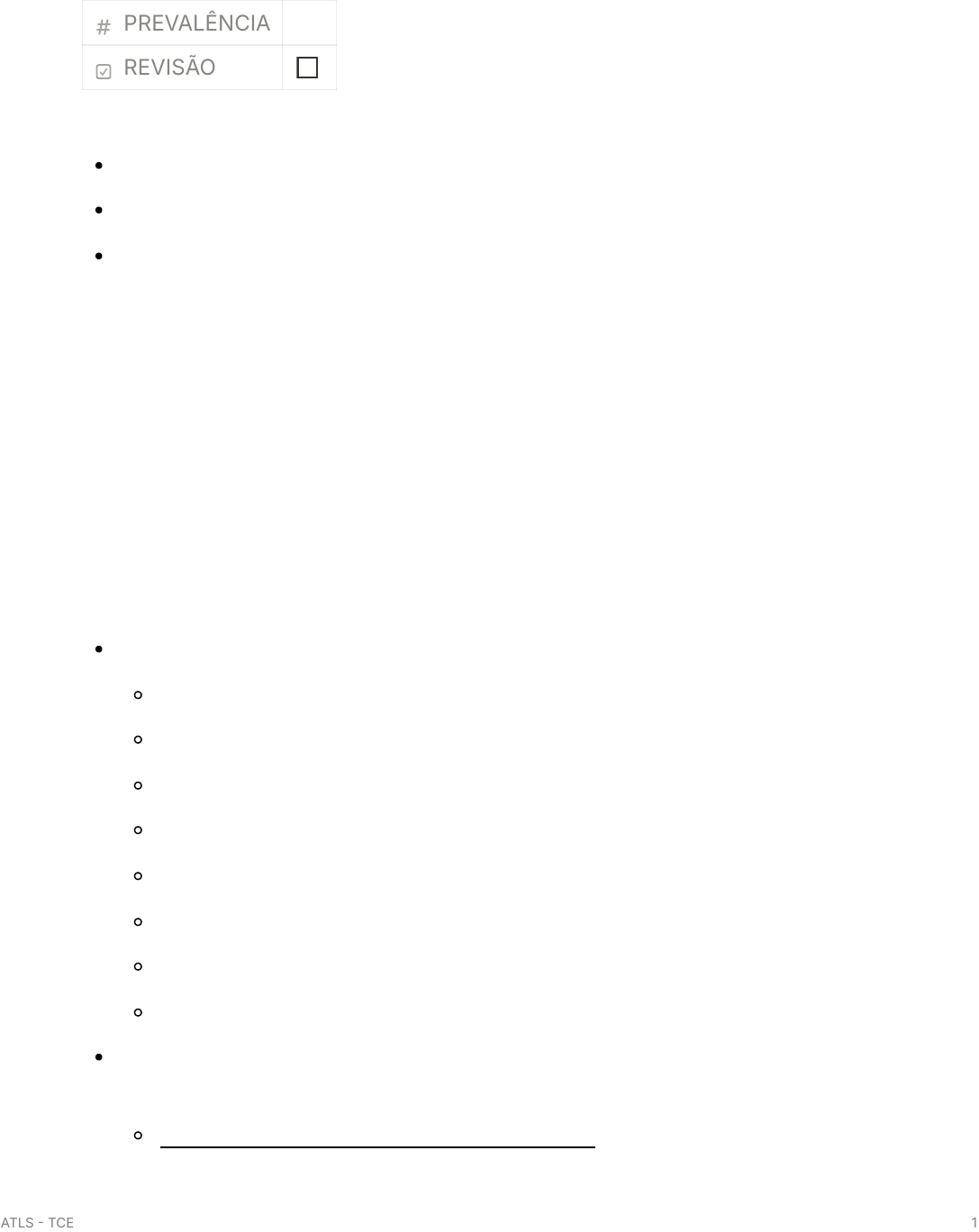 ATLS TCE 1 ATLS - TCE PREVALÊNCIA 4 REVISÃO Classificação do TCE de acordo com o Glasgow: Leve: 13. Moderado: 9 a 12. Grave: 8. O objetivo do tratamento para portadores de TCE deve ser a prevenção da lesão secundária. Para isso, precisamos garantir oxigenação e perfusão cerebral (manter a pressão e a saturação de oxigênio PAs 100 a 110; Sat02 > 95 a 98; PaO2 100. O TCE leve ECG de 13 a 15 é definido por uma história de desorientação, amnésia ou perda transitória da consciência em um doente que está consciente e falando. Se o doente estiver assintomático, completamente acordado, em alerta e neurologicamente normal, poderá ser observado por algumas horas, reexaminado e, se ainda estiver normal, receber alta com segurança. A internação para observação seriada está indicada em casos de: Traumatismo perfurante de crânio. Piora do nível da consciência. Cefaleia moderada ou grave. Intoxicação significativa por álcool ou drogas. Fratura de crânio. Perda de LCR (otorreia, rinorreia). Outros traumas importantes associados. Déficits neurológicos focais. A TC está indicada para todos os casos de TCE moderados e graves. No TCE leve, está indicado se: Alto risco para intervenção neurocirúrgica: ATLS TCE 2 ECG 15 até 2h após o trauma. Suspeita de fratura de crânio. Suspeita de fratura de base de crânio (hemotímpano, olhos de guaxinim, hematoma de battle — hematoma em mastoide, otorreia, rinorreia). Vômitos (mais de 2 episódios). Idade 65 anos. Uso de anticoagulantes. Risco moderado para lesões cerebrais em TC Perda de consciência 5 minutos. Amnésia para fatores anteriores ao impacto 30 minutos). Mecanismo de trauma perigoso (atropelamento, ejeção do veículo, queda de altura maior que 1m ou 5 degraus). Déficits neurológicos focais. Para o TCE moderado ECG de 9 a 12 está sempre indicada a internação, a avaliação neurocirúrgica e a TC de crânio. Para o TCE grave ECG 8, a primeira indicação é a IOT sempre (precisamos garantir a VA de todos os pacientes com Glasgow 9. Esses pacientes precisam manter a PAS 100 a 110mmHg e a SatO2 98%. Outras medidas incluem: Cabeceira elevada e centrada 30 a 45º), para melhorar a perfusão craniana. Sedação com propofol, midazolam e opioides, pois a agitação pode aumentar a PIC. Em geral, pacientes vítimas de TCE grave com HIC são sedados de forma intensa ou moderada nos primeiros dias após o trauma. A avaliação dessa sedação pode ser feita conforme a Escala de Agitação e Sedação de Richmond RASS. RASS 4 combativo — combativo, violento, representando risco para a equipe. RASS 3 muito agitado — puxa ou remove tubos ou cateteres, agressivo verbalmente. ATLS TCE 3 RASS 2 agitado — movimentnos despropositaods frequentes, briga com o ventilador. RASS 1 inquieto — apresenta movimentos, mas que não são agressivos ou vigorosos. RASS 0 alerta e calmo. RASS 1 sonolento — adormecido, mas acorda ao ser chamado (estímulo verbal) e mantém os olhos abertos por mais de 10 segundos. RASS 2 sedação leve — despertar precoce ao estímulo verbal, mantém contato visual por menos de 10 segundos. RASS 3 sedação moderada — movimentação ou abertura ocular ao estímulo verbal, mas sem contato visual. RASS 4 sedação intensa — sem resposta ao ser chamado pelo nome, mas apresenta movimentação ou abertura ocular ao toque (estímulo físico). RASS 5 não desperta — sem resposta ao estímulo verbal ou físico. A hiperventilação profilática não deve ser utilizada, pois gera hipercapnia, que, por sua vez, leva à vasoconstrição cerebral. Um menor aporte sanguíneo no cérebro leva à redução da PIC, mas, por outro lado, gera maior isquemia. A recomendação atual é de manter a PaCO2 no limite inferior da normalidade 35mmHg). Breves períodos de hiperventilação podem ser utilizados em casos raros, em que há iminência de herniação uncal e deteriorização clínica progressiva. O manitol tem efeito diurético importante, reduzindo o edema cerebral e, consequentemente, a PIC. Mas fica reservado a casos de HIC grave, quando há risco de herniação uncal (piora neurológica aguda presenciada com dilatação pupilar, hemiparesia ou perda da consciência). Nunca devemos fornecer manitol para pacientes em choque hemorágico, pois o efeito hiperosmolar do manitol piorará a hipotensão do paciente. A solução salina hipertônica (salgadão) tem as mesmas indicações que o manitol, mas apresenta a vantagem de não ser diurético, podendo ser utilizado em pacientes hipotensos. Anticonvulsivantes devem ser realizados de maneira seletiva. Não há indicação absoluta de profilaxia de convulsões em TCE grave. ATLS TCE 4 A profilaxia da úlcera de estresse com IBP está indicada para todo TCE grave. As lesões intracranianas podem ser divididas em: Lesões focais: hematoma extradural, hematoma subdural, hemorragia intraparenquimatosa, contusões e hematomas. Hematoma extradural (epidural): mais raro. Decorre de trauma direto em região temporal ou temporoparietal (fratura óssea). Há uma lesão da artéria meníngea média, cursando com sangramento arterial e manifestando-se na TC como uma lente biconvexa. Pode ser rapidamente fatal e cursar com tríade de Cushing (hipertensão arterial, bradicardia e bradipneia) e herniação do uncus. O paciente paresenta o intervalo lúcido, que é a perda da consciência no momento do trauma, seguida de melhora parcial oucompleta, e, finalmente, piora neurológica súbita. A intervenção cirúrgica pode ser realizada se: TCE grave ECG 9, sinais de herniação (anisocoria), hematoma 15mm ou volume 30ml e desvio da linha média 5mm. A herniação do uncus pode ser suspeitada em casos de midríase ipsilateral à lesão expansiva e hemiplegia contralateral — a pupila aponta para o lado da lesão. Hematoma subdural: mais frequente. Ocorre por dilacerações de vasos superficiais pequenos ou vasos-ponte do córtex cerebral. Ocorre em localização fro