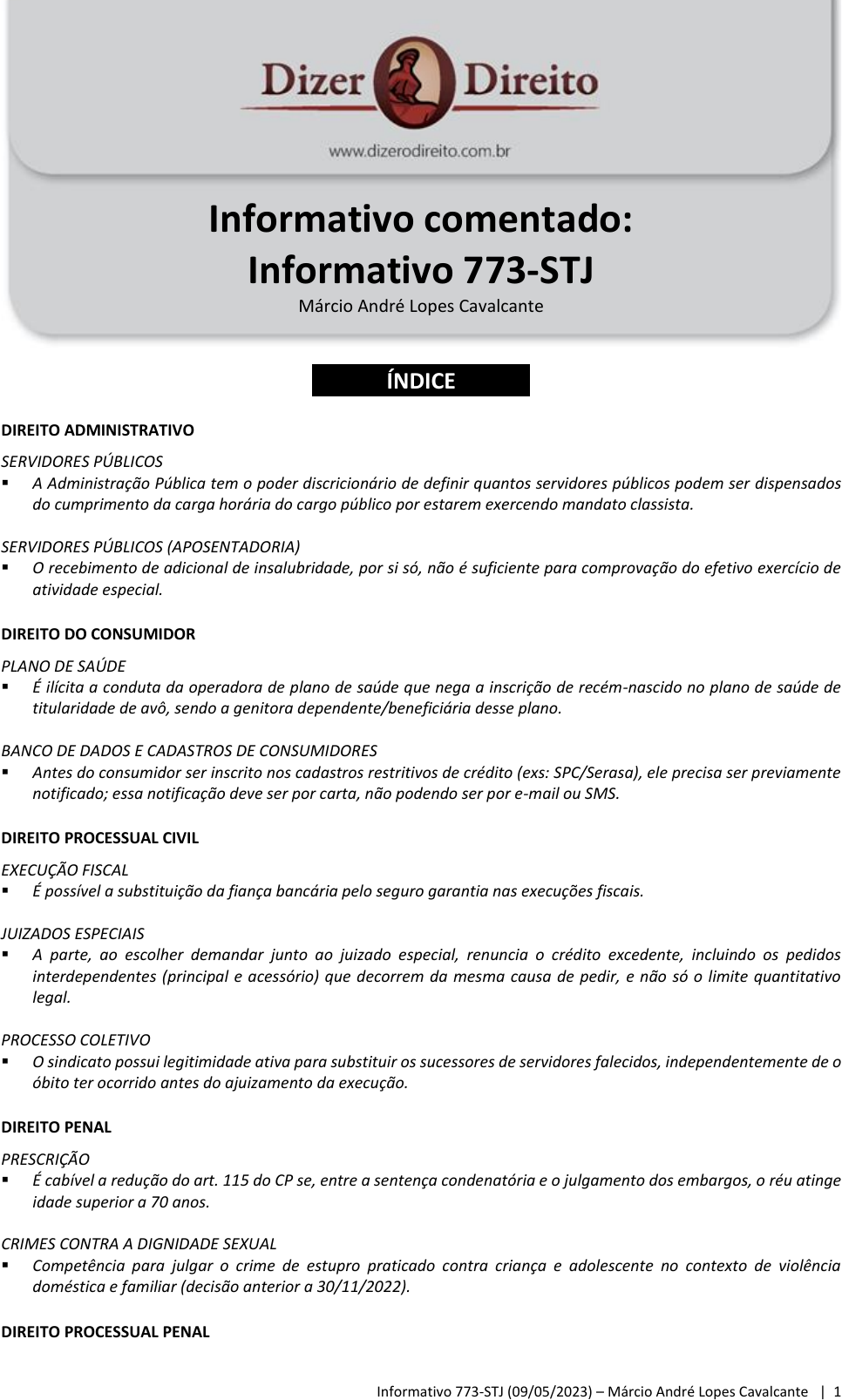 Informativo 773-STJ (09/05/2023) – Márcio André Lopes Cavalcante | 1 Informativo comentado: Informativo 773-STJ Márcio André Lopes Cavalcante ÍNDICE DIREITO ADMINISTRATIVO SERVIDORES PÚBLICOS ▪ A Administração Pública tem o poder discricionário de definir quantos servidores públicos podem ser dispensados do cumprimento da carga horária do cargo público por estarem exercendo mandato classista. SERVIDORES PÚBLICOS (APOSENTADORIA) ▪ O recebimento de adicional de insalubridade, por si só, não é suficiente para comprovação do efetivo exercício de atividade especial. DIREITO DO CONSUMIDOR PLANO DE SAÚDE ▪ É ilícita a conduta da operadora de plano de saúde que nega a inscrição de recém-nascido no plano de saúde de titularidade de avô, sendo a genitora dependente/beneficiária desse plano. BANCO DE DADOS E CADASTROS DE CONSUMIDORES ▪ Antes do consumidor ser inscrito nos cadastros restritivos de crédito (exs: SPC/Serasa), ele precisa ser previamente notificado; essa notificação deve ser por carta, não podendo ser por e-mail ou SMS. DIREITO PROCESSUAL CIVIL EXECUÇÃO FISCAL ▪ É possível a substituição da fiança bancária pelo seguro garantia nas execuções fiscais. JUIZADOS ESPECIAIS ▪ A parte, ao escolher demandar junto ao juizado especial, renuncia o crédito excedente, incluindo os pedidos interdependentes (principal e acessório) que decorrem da mesma causa de pedir, e não só o limite quantitativo legal. PROCESSO COLETIVO ▪ O sindicato possui legitimidade ativa para substituir os sucessores de servidores falecidos, independentemente de o óbito ter ocorrido antes do ajuizamento da execução. DIREITO PENAL PRESCRIÇÃO ▪ É cabível a redução do art. 115 do CP se, entre a sentença condenatória e o julgamento dos embargos, o réu atinge idade superior a 70 anos. CRIMES CONTRA A DIGNIDADE SEXUAL ▪ Competência para julgar o crime de estupro praticado contra criança e adolescente no contexto de violência doméstica e familiar (decisão anterior a 30/11/2022). DIREITO PROCESSUAL PENAL B u scad o r D izer o D ireito - w w w .b u scad o rd izero d ireito .co m .b r D isponibilizado para: Luà s F elipe G onà §alves de C arvalho | lfelipegc@ outlook.com | C P F : 365.975.868-08 Informativo comentado Informativo 773-STJ (09/05/2023) – Márcio André Lopes Cavalcante | 2 COMPETÊNCIA ▪ Havendo juízo especializado para apurar e julgar crimes praticados contra criança e adolescente, é este o competente independentemente do tipo de crime. CONEXÃO ▪ É incabível a conexão de processos quando ausente a exposição de um liame circunstancial que demonstre a relação de interferência ou prejudicialidade entre as condutas criminosas. NULIDADES ▪ O venire contra factum proprio também se aplica para o réu no processo penal. ▪ Declinada a competência do feito para a Justiça estadual, não cabe à Polícia Federal prosseguir nas investigações. DIREITO TRIBUTÁRIO PIS/COFINS ▪ O ICMS-ST constitui parte integrante do custo de aquisição da mercadoria e, por conseguinte, deve ser admitido na composição do montante de créditos a ser deduzido para apuração da Contribuição ao PIS e da Cofins, no regime não cumulativo. DIREITO PREVIDENCIÁRIO PREVIDÊNCIA PRIVADA ▪ Competência para julgar ação proposta contra o patrocinador para recomposição de reserva matemática, em cumulação sucessiva ao pedido de revisão do benefício pela entidade fechada de previdência privada complementar. DIREITO ADMINISTRATIVO SERVIDORES PÚBLICOS A Administração Pública tem o poder discricionário de definir quantos servidores públicos podem ser dispensados do cumprimento da carga horária do cargo público por estarem exercendo mandato classista ODS 16 A definição da quantidade de servidores públicos que podem ser dispensados do cumprimento da carga horária do cargo público para o exercício de mandato classista faz parte do poder discricionário da administração pública. STJ. 2ª Turma. AgInt no RMS 70.020-SE, Rel. Min. Mauro Campbell Marques, julgado em 18/4/2023 (Info 773). A situação concreta, com adaptações, foi a seguinte: O sindicato dos servidores do Ministério Público do Estado de Sergipe requereu que 3 (três) dos seus dirigentes fossem liberados da carga horária por estarem exercendo mandato classista. O pedido foi baseado no art. 278 da Constituição Estadual: Art. 278. É assegurada a liberação, com ônus para o órgão ou entidade de origem, de servidores públicos membros titulares da Diretoria de Sindicatos representativos das categorias de servidores públicos, até o limite de 03 (três), em tempo integral, ou 06 (seis) em termos de 50% (cinquenta por cento) da jornada de trabalho, garantidos os direitos e vantagens pessoais. O Procurador-Geral de Justiça acolheu em parte o pedido e autorizou o afastamento de apenas 1 (um) membro da Diretoria do Sindicato. B u scad o r D izer o D ireito - w w w .b u scad o rd izero d ireito .co m .b r D isponibilizado para: Luà s F elipe G onà §alves de C arvalho | lfelipegc@ outlook.com | C P F : 365.975.868-08 Informativo comentado Informativo 773-STJ (09/05/2023) – Márcio André Lopes Cavalcante | 3 O sindicato não concordou e impetrou mandado de segurança sustentando que a Administração não teria discricionariedade para liberar apenas 1 (um), como foi feito no caso. O Tribunal de Justiça denegou a segurança, ou seja, julgou improcedente o pedido. Ainda inconformado, o sindicato interpôs recurso ordinário. O que decidiu o STJ? O Ministério Público poderia ter liberado apenas um único diretor do sindicato das suas obrigações de cumprimento da carga horária no serviço? SIM. Trata-se de mandado de segurança contra ato do Procurador Geral de Justiça do Estado de Sergipe que deferiu o afastamento de apenas 1 (um) membro da Diretoria do Sindicato. O sindicato defendeu haver direito líquido e certo dos dirigentes sindicais à liberaç