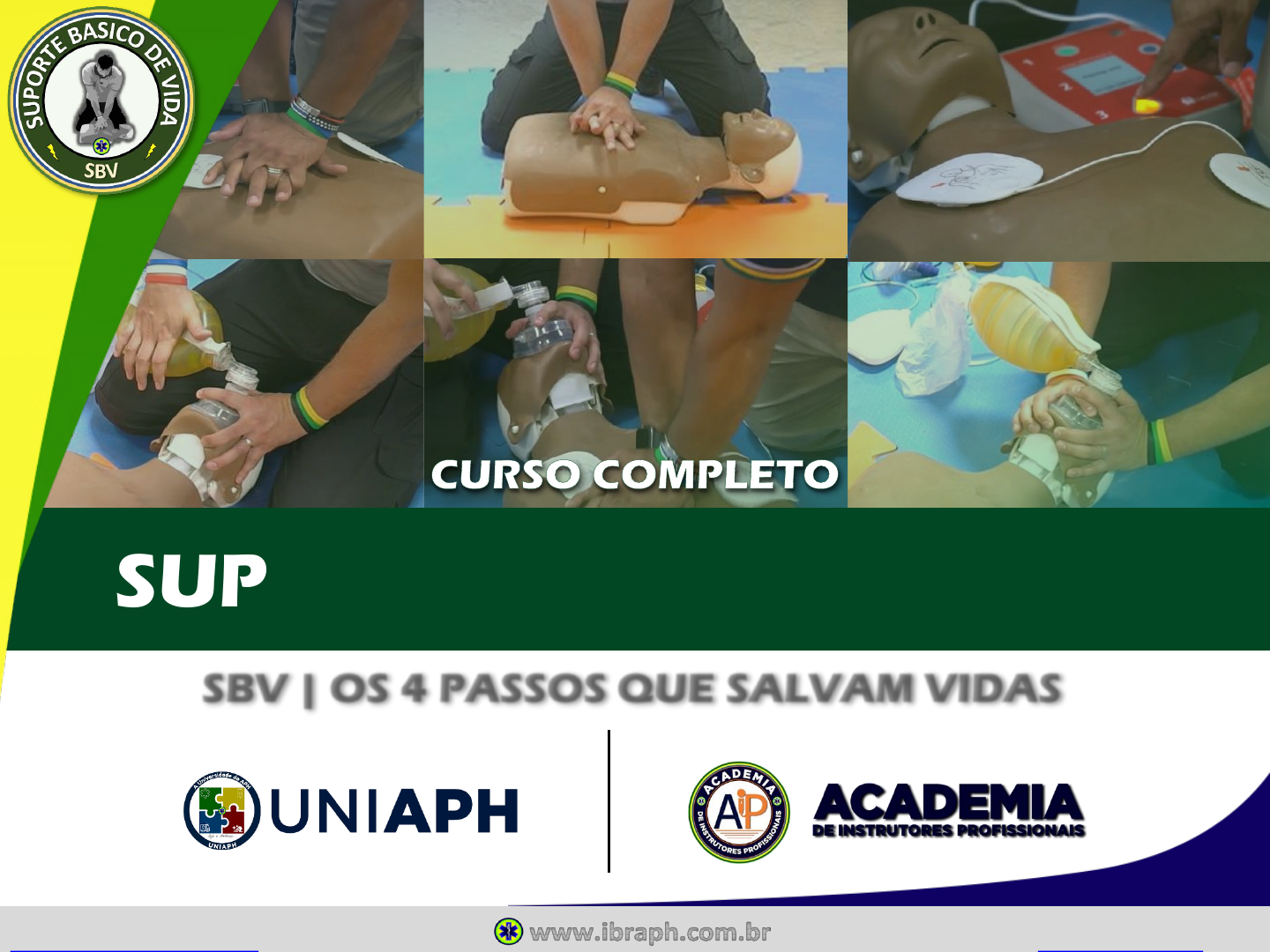 Conheça a Universidade do APH https://bit.ly/uniaph Torne-se instrutor(a) https://bit.ly/academia-ibraph SUPORTE BÁSICO DE VIDA SBV | OS 4 PASSOS QUE SALVAM VIDAS https://bit.ly/uniaph https://bit.ly/academia-ibraph Conheça a Universidade do APH https://bit.ly/uniaph Torne-se instrutor(a) https://bit.ly/academia-ibraph MATERIAL DE APOIO DO CURSO Esse material foi elaborado pelo Instituto Brasileiro de APH (IBRAPH) e o mesmo representa os slides em PDF do curso: Suporte Básico de Vida (SBV), os 4 passos que salvam vidas. Esse curso foi realizado de forma AO VIVO e online, entre os dias 11 e 14 de Abril de 2022. Para ter acesso às gravações do curso + um certificado de participação de 10h. Adquira o acesso ouro neste link: https://ibraph.com.br/sbv-acesso-ouro/ Para se tornar instrutor(a) de SBV, Primeiro Socorros e Controle de Hemorragias: Assine a Academia de Instrutores Profissionais (AiP): https://bit.ly/academia-ibraph Para se capacitar e se manter atualizado(a) em APH: Assine a Universidade do APH (UNiAPH): https://bit.ly/uniaph Esse material foi disponibilizado gratuitamente pelo Instituto Brasileiro de APH (IBRAPH). É proibida a duplicação ou reprodução deste PDF para fins comerciais, no todo ou em parte, sob quaisquer formas ou por quaisquer meios (eletrônico, mecânico, gravação, fotocópia, distribuição na Web e outros), sem permissão expressa do IBRAPH. Esse é um material gratuito, que não poderá ser comercializado. https://bit.ly/uniaph https://bit.ly/academia-ibraph https://ibraph.com.br/sbv-acesso-ouro/ https://bit.ly/academia-ibraph https://bit.ly/uniaph Conheça a Universidade do APH https://bit.ly/uniaph Torne-se instrutor(a) https://bit.ly/academia-ibraph PLANO DO CURSO PARTE 2 | SBV NO ADULTO + USO DO DEA PARTE 3 | SBV NA PEDIATRIA + ENGASGO PARTE 1 | CONCEITOS FUNDAMENTAIS DE SBV PARTE 4 | como se tornar instrutor(a) profissional https://bit.ly/uniaph https://bit.ly/academia-ibraph Conheça a Universidade do APH https://bit.ly/uniaph Torne-se instrutor(a) https://bit.ly/academia-ibraph CONCEITOS FUNDAMENTAIS https://bit.ly/uniaph https://bit.ly/academia-ibraph Conheça a Universidade do APH https://bit.ly/uniaph Torne-se instrutor(a) https://bit.ly/academia-ibraph NOSSA MISSÃO “Contribuir para zerar as mortes por PCR não assistidas adequadamente” https://bit.ly/uniaph https://bit.ly/academia-ibraph Conheça a Universidade do APH https://bit.ly/uniaph Torne-se instrutor(a) https://bit.ly/academia-ibraph SBV X PRIMEIROS SOCORROS X APH https://bit.ly/uniaph https://bit.ly/academia-ibraph Conheça a Universidade do APH https://bit.ly/uniaph Torne-se instrutor(a) https://bit.ly/academia-ibraph FONTES BIBLIOGRÁFICAS https://bit.ly/uniaph https://bit.ly/academia-ibraph Conheça a Universidade do APH https://bit.ly/uniaph Torne-se instrutor(a) https://bit.ly/academia-ibraph A IMPORTÂNCIA DO SBV NA SOCIEDADE 4 min → Órgãos nobres -10% a cada minuto de atraso Descentralização do SBV<< NOSSA MISSÃO Multiplicar os 4 passos que salvam vidas Tempo é vida! https://bit.ly/uniaph https://bit.ly/academia-ibraph Conheça a Universidade do APH https://bit.ly/uniaph Torne-se instrutor(a) https://bit.ly/academia-ibraph OS 4 PASSOS QUE SALVAM VIDAS Reconhecer a PCR precocemente Pedir Ajuda Adequadamente RCP de Alta Qualidade (Compressões + Ventilações) Uso do DEA assim que disponível Fonte das imagens: IBRAPH https://bit.ly/uniaph https://bit.ly/academia-ibraph Conheça a Universidade do APH https://bit.ly/uniaph Torne-se instrutor(a) https://bit.ly/academia-ibraph O QUE É UMA PCR? Ausência de ventilação associada a uma ausência de débito cardíaco suficiente que gere uma perfusão mínima para os órgãos nobres https://bit.ly/uniaph https://bit.ly/academia-ibraph Conheça a Universidade do APH https://bit.ly/uniaph Torne-se instrutor(a) https://bit.ly/academia-ibraph OS 4 RITMOS DE PCR Taquicardia Ventricular (TV) Fibrilação Ventricular (FV) Atividade Elétrica sem pulso (AESP) Assistolia https://bit.ly/uniaph https://bit.ly/academia-ibraph Conheça a Universidade do APH https://bit.ly/uniaph Torne-se instrutor(a) https://bit.ly/academia-ibraph CADEIAS DA SOBREVIVÊNCIA Fonte: AHA https://bit.ly/uniaph https://bit.ly/academia-ibraph Conheça a Universidade do APH https://bit.ly/uniaph Torne-se instrutor(a) https://bit.ly/academia-ibraph CADEIAS DA SOBREVIVÊNCIA Fonte: AHA https://bit.ly/uniaph https://bit.ly/academia-ibraph Conheça a Universidade do APH https://bit.ly/uniaph Torne-se instrutor(a) https://bit.ly/academia-ibraph CADEIA DA SOBREVIVÊNCIA | PS Fonte: IBRAPH/IBRAPS https://bit.ly/uniaph https://bit.ly/academia-ibraph Conheça a Universidade do APH https://bit.ly/uniaph Torne-se instrutor(a) https://bit.ly/academia-ibraph OS 4 PASSOS QUE SALVAM VIDAS Reconhecer a PCR precocemente Pedir Ajuda Adequadamente RCP de Alta Qualidade (Compressões + Ventilações) Uso do DEA assim que disponível Fonte das imagens: IBRAPH https://bit.ly/uniaph https://bit.ly/academia-ibraph Conheça a Universidade do APH https://bit.ly/uniaph Torne-se instrutor(a) https://bit.ly/academia-ibraph NOSSA MISSÃO “Contribuir para zerar as mortes por PCR não assistidas adequadamente” https://bit.ly/uniaph https://bit.ly/academia-ibraph Conheça a Universidade do APH https://bit.ly/uniaph Torne-se instrutor(a) https://bit.ly/academia-ibraph SBV NO ADULTO https://bit.ly/uniaph https://bit.ly/academia-ibraph Conheça a Universidade do APH https://bit.ly/uniaph Torne-se instrutor(a) https://bit.ly/academia-ibraph PLANO DO MÓDULO COMPRESSÕES CARDÍACAS VENTILAÇÃO NO SBV ATENDIMENTO EM EQUIPE AVALIAÇÃO INICIAL + PEDIDO DE AJUDA https://bit.ly/uniaph https://bit.ly/academia-ibraph Conheça a Universidade do APH https://bit.ly/uniaph Torne-se instrutor(a) https://bit.ly/academia-ibraph INTRODUÇÃO Adultos > Início da puberdade Final da vida Adolescentes Principal etiologia da PCR Cardiogênica Adultos Idosos https://bit.ly/uniaph https://bit.ly/academ
