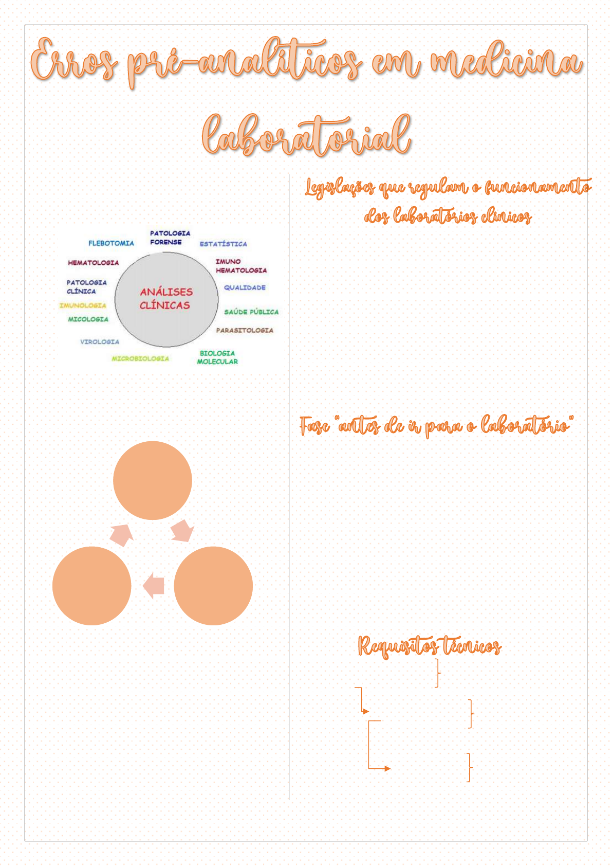 Grande número de pessoas, diferentes formações profissionais, focos de interesse e grau de envolvimento. Além da rotatividade. Sendo assim, o laboratório não é um organismo isolado. 70% das decisões médicas são apoiadas nos exames laboratoriais. A medicina diagnóstica como especialidade: • Confirmar, estabelecer ou complementar o diagnóstico clínico; • Pressão sobre os custos: mais exames em menos tempo; • Exame laboratorial = material biológico + informação do paciente; • Reduzir dúvida no raciocínio médico; • É o produto do laboratório clínico; • RDC/ANVISA nº 302: Regulamento Técnico para funcionamento de Laboratórios Clínicos; • RDC nº 306: Regulamento Técnico para o gerenciamento de resíduos de serviço de saúde; • RDC nº 50: Regulamento Técnico para planejamento, programação, elaboração e avaliação de projetos físicos de estabelecimentos assistenciais de saúde; • RDC nº 20: Regulamento sanitário para o transporte de material biológico humano; • RDC nº 63: Requisitos de Boas Práticas: Funcionamento para os Serviços de Saúde. Fase pré-analítica: • Pedido de exame, coleta, encaminhamento; • Transporte ao laboratório; • Conferência; • Envio à área técnica. Fase analítica: • Análise. Fase pós analítica: • Liberação do resultado; • Acesso ao resultado; • Interpretação; • Tomada de conduta. Cliente > Atendimento > Fase Coleta > Amostra Pré-Analítica Análise laboratorial Fase Analítica Laudo > Cliente Fase Pós Analítica Médico: Decisão diagnóstica Cliente/PacienteLaboratório • Fase pré-pré analítica: Seleção dos exames pelo clínico; • Fase pós-pós analítica: Interpretação dos resultados. Variáveis do paciente: • Identificação; • Dieta; • Massa corporal; • Idade; • Medicamentos; • Gênero; • Tabaco e álcool; • Gravidez; • Exercício físico; • Raça. Variáveis na coleta: • Postura; • Variação biológica; • Jejum; • Calibre da agulha; • Torniquete; • Capilar x venoso; • Aditivo; • Ordem de coleta; • Identificação; • Desidratação. Variáveis na manipulação: • Volume; • Rotulagem; • Hemólise; • Lipemia; • Centrifugação; • Tempo de processamento; • Homogeneização; • Fibrina; • Coágulo; • Condições de transporte.