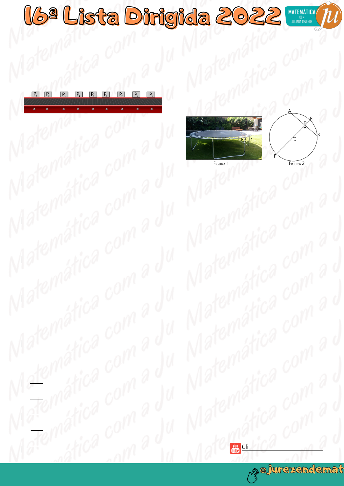 1)(Ju) No setor produtivo de uma firma há uma esteira com nove postos de trabalho numerados de P1 a P9, mas, apesar dessa quantidade de vagas, apenas dois operários trabalham nessa estação. A figura a seguir mostra uma configuração possível para o trabalho. Pesquisas realizadas pelo setor de logística da empresa garantem que, para uma melhor produtividade, os dois funcionários escalados para esteira devem se posicionar de forma que haja, pelo menos, um posto de trabalho vazio entre eles. Estabelecidas as posições que cada um vai ocupar, os funcionários devem cumprir o dia todo de trabalho nas posições escolhidas. Se Artur e Brenda foram designados para esse setor, o número máximo de dias que esses dois funcionários poderão trabalhar sem repetir uma configuração já utilizada é a) 72. b) 64. c) 56. d) 48. e) 42. 2)(Ju) No próximo mês haverá eleições para o novo Colegiado de uma Universidade Federal. Serão escolhidos um presidente, um vice- presidente, um conselheiro, um auditor e um secretário. Ao todo, sete docentes se candidataram aos cargos, mas, por ainda estarem na fase de estágio probatório, três deles não podem ocupar os cargos de presidente e vice-presidente do Colegiado. Dessa forma, o número de maneiras distintas de montar esse Colegiado é a) 5! 2! 2! b) 7! 2! 2! c) 6! .5! 4! 2! d) 5! 4! 2! 2! e) 7! 6! 3! 2! 3)(Ju) Ricardo decidiu finalmente realizar o sonho de suas duas filhas e comprou uma cama elástica enorme, como a da Figura 1. Porém, antes mesmo de realizar a compra, ao pesquisar sobre o produto, percebeu que muitos consumidores reclamavam da estrutura da cama. Para minimizar possíveis danos à estrutura, Ricardo decidiu soldar duas peças de metal representadas pelos segmentos AB e FE na Figura 2 Considerando que C é o centro da circunferência, que FE ⊥ AB, o raio da cama mede 15 dm e que DE = 3 dm, a medida da barra representada na figura pelo segmento AB, em metro, é a) 1,5 b) 1,6 c) 1,7 d) 1,8 e) 1,9 Clique aqui para se inscrever http://youtube.com/matematicacomaju?sub_confirmation=1 http://youtube.com/matematicacomaju?sub_confirmation=1 http://instagram.com/jurezendemat