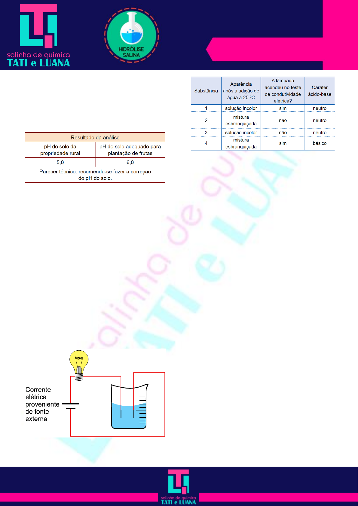 HIDRÓLISE SALINA L ista 5 9 QUESTÃO 1 (IBMEC SP Insper) Um agricultor pretende iniciar um empreendimento de produção de frutas e, para isso, submeteu amostras do solo de sua propriedade para análise química e parecer técnico de um engenheiro agrônomo. Para que o agricultor possa fazer a correção do pH do solo de forma adequada para a sua produção, ele deverá adicionar ao solo a) NaCl. b) P4O10. c) KNO3. d) NH4Cl. e) CaO. QUESTÃO 2 (IBMEC SP Insper) Um professor de laboratório preparou uma aula de química empregando algumas substâncias trazidas pelos alunos: açúcar (C12H22O11), sal (NaCl), cal (CaO) e amido de milho ((C6H10O5)n), que é um polímero natural. As substâncias foram rotuladas aleatoriamente de 1 a 4 e submetidas a testes de solubilidade, condutividade elétrica da solução (experimento representado na figura) e de caráter ácido-base com uso de papel indicador de pH. Os resultados obtidos pelos alunos estão apresentados na tabela. Com base nos resultados dos testes, os alunos concluíram que as substâncias 1, 2, 3 e 4 são, respectivamente, a) cal, açúcar, amido de milho e sal. b) amido de milho, cal, sal e açúcar. c) sal, amido de milho, açúcar e cal. d) açúcar, sal, cal e amido de milho. e) açúcar, amido de milho, sal e cal. QUESTÃO 3 (UniCESUMAR PR) Para diminuir a acidez de um molho de tomate, uma cozinheira adicionou fermento químico, cujo principal componente é o bicarbonato de sódio, NaHCO3. Esse procedimento é adequado porque o molho de tomate possui a) pH < 7 e o bicarbonato de sódio é um sal ácido. b) pH < 7 e o bicarbonato de sódio é um sal básico. c) pH = 7 e o bicarbonato de sódio é um sal neutro. d) pH > 7 e o bicarbonato de sódio é um sal básico. e) pH > 7 e o bicarbonato de sódio é um sal ácido. QUESTÃO 4 (FAMERP SP) O hipoclorito de sódio é utilizado na desinfecção da água para o consumo humano devido à ação oxidante do íon ClO–. No entanto, esse sal sofre hidrólise de acordo com a seguinte sequência de reações: NaClO → Na+ + ClO– ClO– + H2O → HClO + OH– O número de oxidação do cloro no íon hipoclorito e a condição ideal para aumentar a concentração desse íon na solução são a) +1 e pH < 7. b) –1 e pH > 7. c) +1 e pH > 7. HIDRÓLISE SALINA L ista 5 9 d) +2 e pH > 7. e) –1 e pH < 7. QUESTÃO 5 (UNESP SP) Para sua apresentação em um “show de química”, um grupo de estudantes confeccionou um recipiente com três compartimentos, 1, 2 e 3, dispostos de modo a lembrar o formato da bandeira brasileira. A esses compartimentos, adicionaram três soluções aquosas diferentes, todas incolores e de concentração igual a 0,1 mol/L, uma em cada compartimento. O recipiente foi mantido em posição horizontal. Em seguida, acrescentaram em cada compartimento o indicador azul de bromotimol, que apresenta cor azul em pH > 7,6 e amarela em pH < 6,0. Como resultado, o recipiente apresentou as cores da bandeira nacional, conforme mostra a figura. As soluções aquosas colocadas inicialmente pelos estudantes nos compartimentos 1, 2 e 3 podem ter sido, respectivamente, a) cloreto de sódio, ácido clorídrico e hidróxido de sódio. b) cloreto de sódio, carbonato de sódio e ácido clorídrico. c) hidróxido de sódio, ácido clorídrico e cloreto de sódio. d) hidróxido de sódio, carbonato de sódio e ácido clorídrico. e) carbonato de sódio, hidróxido de sódio e ácido clorídrico. QUESTÃO 6 (ENEM) O manejo adequado do solo possibilita a manutenção de sua fertilidade à medida que as trocas de nutrientes entre matéria orgânica, água, solo e o ar são mantidas para garantir a produção. Algumas espécies iônicas de alumínio são tóxicas, não só para a planta, mas para muitos organismos como as bactérias responsáveis pelas transformações no ciclo do nitrogênio. O alumínio danifica as membranas das células das raízes e restringe a expansão de suas paredes, com isso, a planta não cresce adequadamente. Para promover benefícios para a produção agrícola, é recomendada a remediação do solo utilizando calcário (CaCO3). Essa remediação promove no solo o(a) a) diminuição do pH, deixando-o fértil. b) solubilização do alumínio, ocorrendo sua lixiviação pela chuva. c) interação do íon cálcio com o íon alumínio, produzindo uma liga metálica. d) reação do carbonato de cálcio com os íons alumínio, formando alumínio metálico. e) aumento da sua alcalinidade, tornando os íons alumínio menos disponíveis. QUESTÃO 7 (UEFS BA) Em uma aula de química, a professora desenhou na lousa o esquema representado a seguir. Em seguida fez duas perguntas para a turma: Qual é o pH da solução 1? Das três soluções, qual é aquela que tem o pH mais alto? As respostas corretas às perguntas feitas pela professora são a) pH = 3 e solução 2. b) pH = 1 e solução 2. HIDRÓLISE SALINA L ista 5 9 c) pH = 2 e solução 2. d) pH = 2 e solução 3. e) pH = 3 e solução 3. QUESTÃO 8 (FAMERP SP) Considere duas soluções aquosas, uma preparada com o sal NH4Cl e outra com o sal NaHCO3. Ambas têm a mesma concentração em mol/L. Uma delas apresenta pH igual 4 e a outra, pH igual a 8. a) Escreva as equações que representam a hidrólise desses sais. b) Calcule o valor da concentração de íons H+ (aq) na solução alcalina. QUESTÃO 9 (FMSanta Casa SP) Uma indústria alimentícia solicitou a seu laboratório de controle de qualidade a análise de um lote de bicarbonato de sódio (NaHCO3), utilizado como matéria- prima na fabricação de seus produtos. Durante a análise, constatou-se que ao aquecer uma amostra de 4,200 g em estufa, sob condições de temperatura e tempo de aquecimento para a decomposição total do NaHCO3 presente na matéria-prima, restaram 2,805 g de material sólido no interior do recipiente de aquecimento. A reação de decomposição do bicarbonato de sódio é apresentada a seguir. 2NaHCO3 (s) ⎯→⎯ Na2CO3 (s) + H2O (g) + CO2 