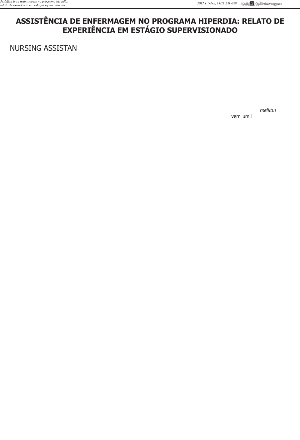 231 � � � � � � � � � � � � � � � � � � � � � � � � � � � � � � � � � �� � � � � � � � � � � � � � � � � � � � � � � � � � � � � � � � � � � � � � � � � � � � � � � � � � ! � � " � � � " # ASSISTÊNCIA DE ENFERMAGEM NO PROGRAMA HIPERDIA: RELATO DE NURSING ASSISTANCE IN THE HIPERDIA PROGRAM: EXPERIENCE REPORT DURING SUPERVISED STAGE ASISTENCIA DE ENFERMERÍA EN EL PROGRAMA HIPERDIA: RELATO DE EXPERIENCIA EN ETAPA SUPERVISADA ionarcosson@uol.com.br Bacharelado em Enfermagem da Universidade Federal do Acre (UFFAC), Rio Branco-AC, Brasil. Contato: jacamaraldenora@bol.com.br Resumo $ % & & ' ( ) * pela rede ambulatorial do Sistema Único de Saúde. Destina-se ao tratamento dessas condições crônicas que envolvem um leque muito amplo de doenças e agravos, especialmente cardiovasculares. Objetivos: Relatar a experiência de Estágio Supervisionado na Atenção Básica em Saúde, realizado por acadêmicas de enfermagem em uma unidade de referência, no município de Rio Branco-Acre, no período de abril a junho de 2015; traçar um paralelo entre as ações assistenciais realizadas e as preconizadas pelo Ministério da Saúde, quanto ao programa Hiperdia. Material e Método: Trata-se de um relato de experiência que utilizou como técnica de coleta de dados o diário de campo e a pelo enfermeiro quanto à atuação de forma efetiva e direta no programa, assim como ausência de educação continuada e permanente para os técnicos de enfermagem, pouca busca ativa dos faltosos e acompanhamento domiciliar, como também pouca informação verbal ou visual ao público alvo, estando, portanto, em desacordo com o preconizado pelo Ministério da Saúde, pactuado no caderno do programa Hiperdia. Conclusão: Perceberam-se falhas na comunicação do enfermeiro com o cliente e a família, não contribuindo para acompanhamento integral e longitudinal dos pacientes com fatores de risco e, consequentemente, para a emancipação do usuário do sistema, considerando-se que proporcionem melhor qualidade de vida, adoção de medidas preventivas de doenças e de possíveis complicações futuras. Palavras-chave: Assistência de enfermagem. Hiperdia. Sistema Único de Saúde. Enfermeiro. Educação. Abstract involve a very wide range of diseases and complications, especially cardiovascular diseases. Objectives: To report the experience of Supervised Internship in Health Primary Care, carried out by nursing students in a reference unit, in the municipality of Rio Branco - Acre, from April to June 2015; to draw a parallel between the assistance actions carried out and those recommended by the Health Ministry care by the nurse regarding the effective and direct intervention in the program, as well as the absence of continuous and permanent education for the nursing technicians, little active search of the absentees and home monitoring, as well as lack of verbal or visual information to the target audience, being, therefore, in disagreement with the Health Ministry recommendation, agreed in the Hiperdia program booklet. Conclusion: We perceived failure in nurses communication with the client and the family as well, not contributing to the integral and longitudinal follow-up of patients with risk factors and, consequently, to the emancipation of the system user, considering that provide him a better quality of life, adoption of measures preventive of diseases and of possible future complications as well. Keywords: Nursing care. Hyperdia. SUS. Nurse. Education. Resumen ambulatoria del Sistema Único de Salud - SUS. Se destina al tratamiento de estas condiciones crónicas que involucran un abanico muy amplio de enfermedades y agravios, especialmente cardiovasculares. Objetivos: Comunicar la experiencia de Etapa Supervisada en la Atención Básica en Salud, realizada por académicas de enfermería en una unidad de referencia, en el municipio de Rio Branco - Acre, en el período de abril a junio de 2015; trazar un paralelo entre las acciones asistenciales realizadas y las preconizadas por el Ministerio de Salud, en cuanto al programa Hiperdia. Material y Método: Se trata de un relato de experiencia que utilizó como técnica de recolección de datos el diario de campo y la observación participativa en las actividades clínicas y gerenciales de la unidad. Resultados: Se evidenció ausencia de educación continuada y permanente para los técnicos de enfermería, poca búsqueda activa de los faltos y acompañamiento domiciliar, como también poca la información verbal o visual al público objetivo, estando, por lo tanto, en desacuerdo con lo preconizado por el Ministerio de Salud, pactado en el cuaderno del programa Hiperdia. Conclusión: Se percibieron fallas en la comunicación del enfermero con el cliente y la familia, no contribuyendo para acompañamiento integral y longitudinal de los pacientes con factores de riesgo y, consecuentemente, para la emancipación del usuario del sistema, considerando que es de posesión de la información que la vida, adopción de medidas preventivas de enfermedades y de posibles complicaciones futuras. Palabras claves: Asistencia de enfermería. Hiperdia. SUS. Enfermero. Educación. 232 � � � � � � � � � � � � � � � � � � � � � � � � � � � � � � � � � �� � � � � � � � � � � � � � � � � � � � � � � � � � � � � � � � � �� � � � � � � � � � � � � � � � ! � � " � � � " # INTRODUÇÃO Doenças Crônicas Não Transmissíveis (DCNTs) ameaçam a saúde e o desenvolvimento das nações, pois geralmente são incapacitantes, ocasionam sofrimentos e custos materiais diretos aos pacientes e seus familiares, de saúde1 Básica em Saúde (ABS) é a aten