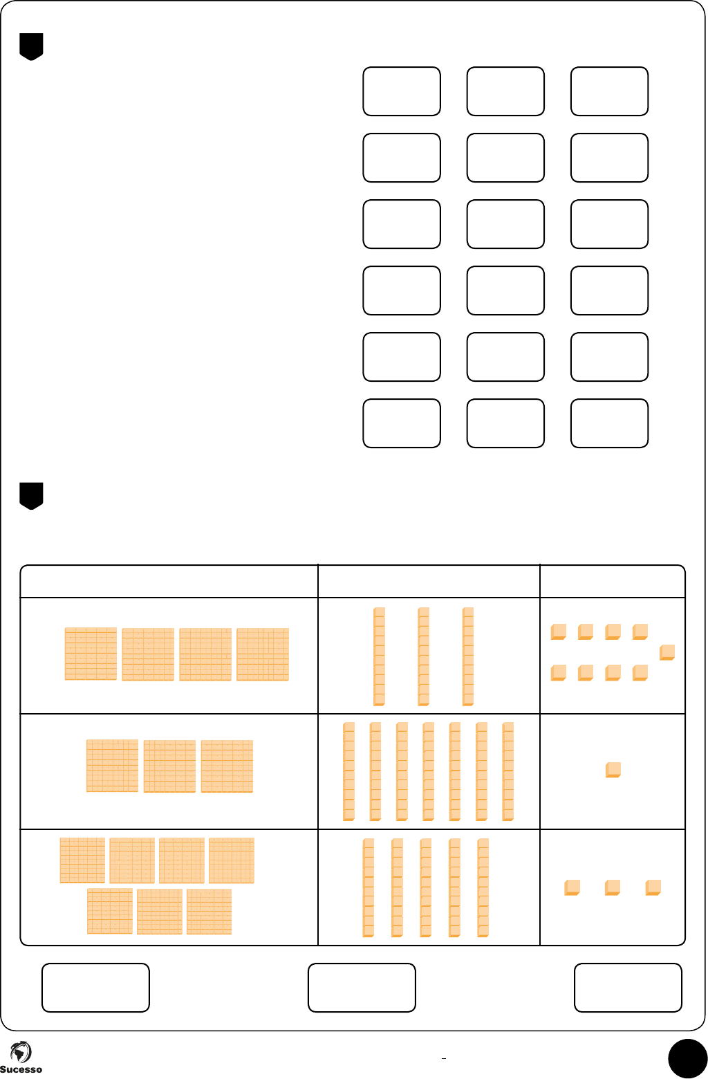 Banco de Questões – Matemática – 2o ano | Ensino Fundamental 51 a. 2 centenas, 4 dezenas e 3 unidades. b. 3 centenas, 7 dezenas e 8 unidades. c. 4 centenas, 6 dezenas e 9 unidades. d. 7 centenas, 5 dezenas e 1 unidade. e. 9 centenas, 8 dezenas e 4 unidades. f. 8 centenas, 2 dezenas e 2 unidades. 234 378 649 751 849 228 243 387 496 715 984 822 342 783 469 175 489 282 4. Pinte a resposta correta. 5. Os números estão sendo representados no Quadro Valor de Lugar. Escreva-os no lugar indicado. CENTENA DEZENA UNIDADE a. b. c.