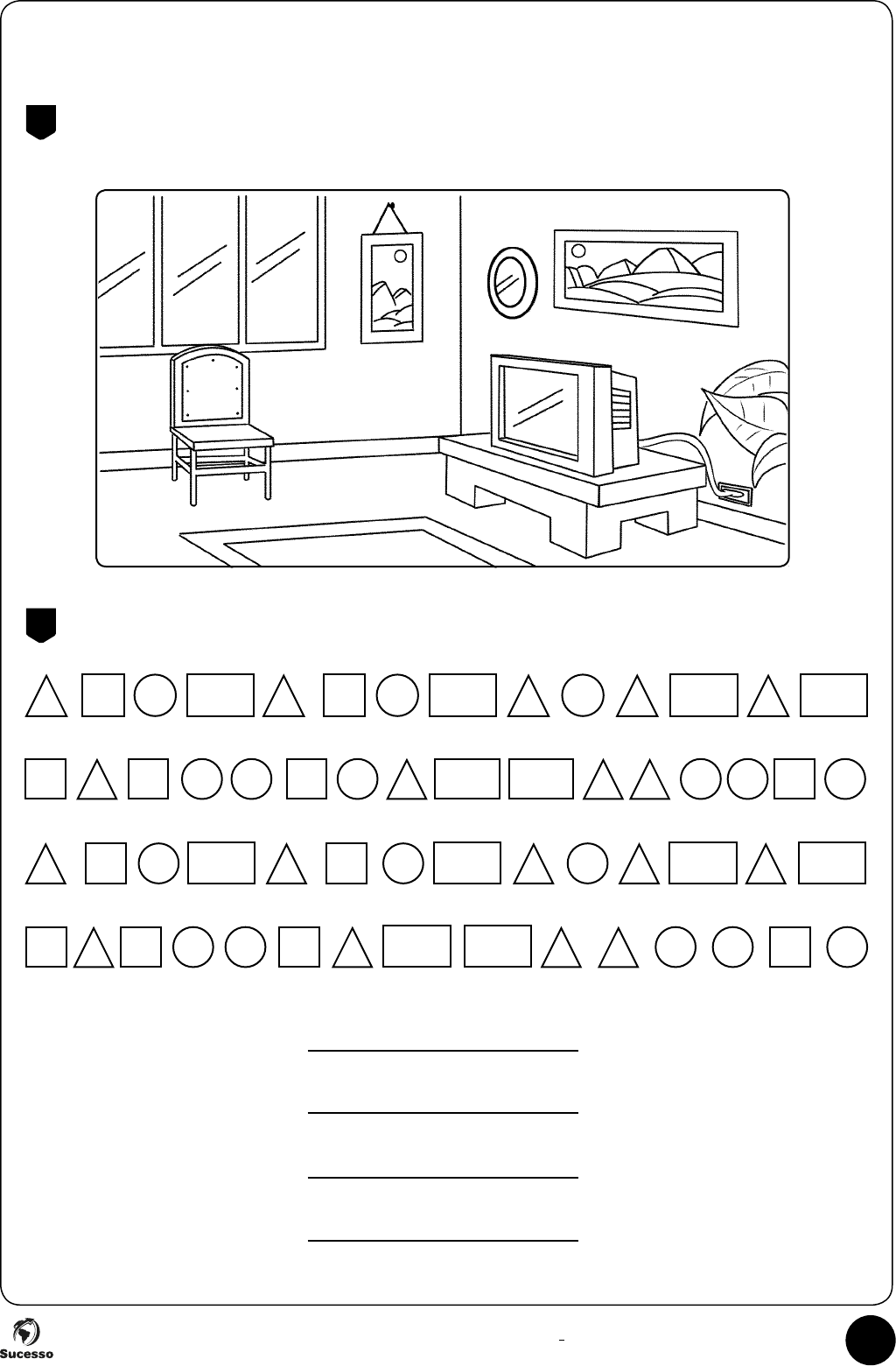 Banco de Questões – Matemática – 2o ano | Ensino Fundamental 67 LINHAS RETAS, CURVAS, ABERTAS E FECHADAS 1. Observe a cena e veja quantas formas geométricas existem nela. Marque um X nas formas que você conhece. 2. Observe e responda: a. Há quantos triângulos? b. Há quantos círculos? c. Há quantos quadrados? d. Há quantos retângulos?