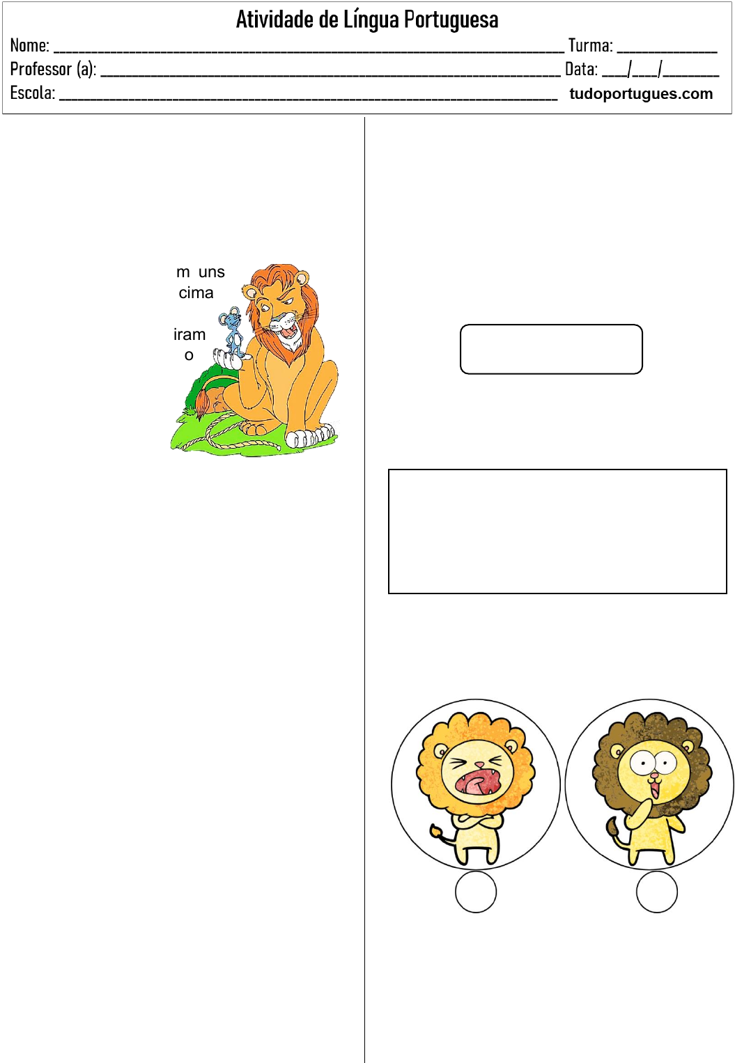Leia o texto e responda às questões. O LEÃO E O RATINHO Um leão, cansado de tanto caçar, dormia espichado à sombra de uma boa árvore. Vieram uns ratinhos passear em cima dele e ele acordou. Todos conseguiram fugir, menos um, que o leão prendeu embaixo da pata. Tanto o ratinho pediu e implorou que o leão desistiu de esmagá-lo e deixou que fosse embora. Algum tempo depois, o leão ficou preso na rede de uns caçadores. Não conseguia se soltar, e fazia a floresta inteira tremer com seus urros de raiva. Nisso, apareceu o ratinho. Com seus dentes afiados, roeu as cordas e soltou o leão. Esopo 1. Quais são os personagens do texto? ____________________________________ ____________________________________ 2. Em que local o leão dormia? a) Debaixo de uma árvore. b) Debaixo de uma ponte. c) Debaixo de um rio. 3. Quem acordou o leão? ____________________________________ ____________________________________ 4. Em que local o leão prendeu o ratinho? ____________________________________ ____________________________________ 5. O que o ratinho fez para que o leão desistisse de esmagá-lo? a) Pediu e implorou. b) Chorou e resmungou. c) Pulou e se esperneou. 6. Veja a palavra abaixo. Circule a palavra que tem o mesmo significado SENTADO JOGADO PENDURADO ESTICADO 7. Como o leão se sentiu ao ficar preso dentro da rede dos caçadores? 8. O que o ratinho utilizou para cortar a rede e soltar o leão? a) Uma faca. b) Uma tesoura. c) os dentes. ESPICHADO
