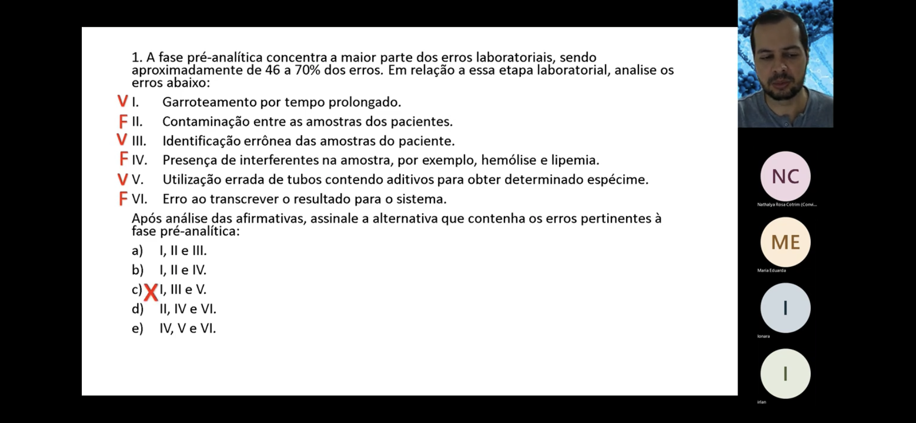 A fase pré-analítica concentra a maior parte dos erros laboratoriais, sendo aproximadamente de 46 a 70% dos erros. Em relação a essa etapa laboratorial, analise os erros abaixo: V I. Garroteamento por tempo prolongado. F II. Contaminação entre as amostras dos pacientes. V III. Identificação errônea das amostras do paciente. F IV. Presença de interferentes na amostra, por exemplo, hemólise e lipemia. V V. Utilização errada de tubos contendo aditivos para obter determinado espécime. NC F VI. Erro ao transcrever o resultado para o sistema. Nathalya Rosa Cotrim (Convi... Após análise das afirmativas, assinale a alternativa que contenha os erros pertinentes à fase pré-analítica: