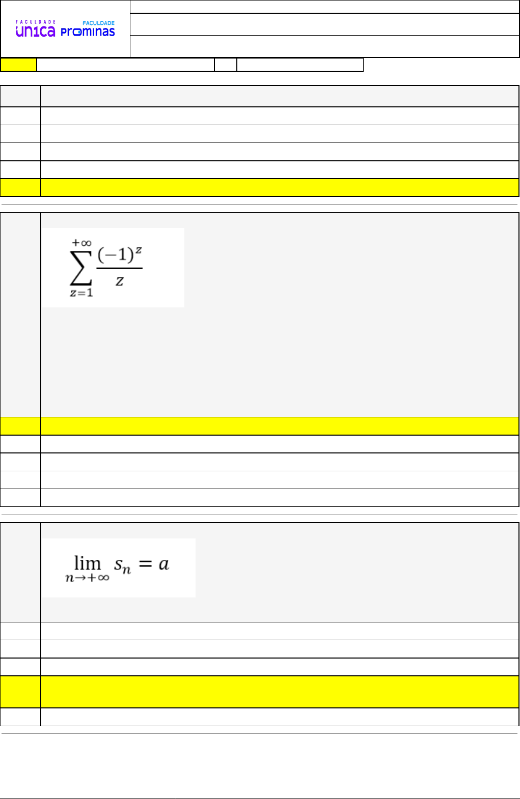22/04/2024 16:14:10 1/3 REVISÃO DE SIMULADO Nome: ROBERTO DA SILVA JUNIOR Disciplina: Cálculo III Respostas corretas são marcadas em amarelo X Respostas marcardas por você. Questão 001 Quantos múltiplos de 7 existem entre a sequência 52 e 2341’ ? A) 340 B) 350 C) 325 D) 326 X E) 327 Questão 002 Analise a expressão abaixo: De acordo as informações apresentadas no trecho, avalie as afirmativas abaixo: I. A expressão dada acima representa uma série chamada de geométrica. II. A soma dos termos da expressão acima converge, uma vez que a série será decrescente. III - Os valores de z representam um único valor na expressão dada acima e, portanto, a soma geral será convergente. É correto o que se afirma em: A) III, apenas. X B) I, apenas. C) I e II, apenas. D) II, apenas. E) II e III, apenas. Questão 003 Considere a expressão abaixo: A expressão dada indica A) a definição do critério de descontinuidade para séries. B) a definição do critério de continuidade para séries. C) o teorema do valor médio para séries infinitas. X D) a definição da convergência de uma série. E) a definição do critério de Cauchy para séries. 22/04/2024 16:14:10 2/3 Questão 004 Analise a série abaixo: Pode-se afirmar que a soma da série indicada converge para X A) B) C) D) E) Questão 005 Leia o trecho abaixo: O desenvolvimento da compreensão acerca das sequências numéricas teve como um dos seus estudiosos Cauchy. Este, criou um método para interpretação das somas e da determinação de séries. Estas, por sua vez são unidades infinitas compostas por subunidades. As subunidades que o trecho faz alusão referem-se X A) aos elementos de uma série. B) aos valores dos zeros da série. C) aos quadrados de uma série. D) as raízes da série. E) aos pontos pares da série. Questão 006 Considere a soma geral dada abaixo: Sobre a sequência acima foram feitas as seguintes afirmações: I. Toda sequência é representada por um conjunto finito de termos, os quais são indicados pela variável k na expressão dada. II. Quando uma sequência apresentar um intervalo de soma infinito, dizemos que se trata de uma série. III. As sequências são formadas por termos que dependem de uma fórmula geral ou lei geral de formação. É correto o que se afirma em: A) II, apenas. X B) I e II, apenas. C) I, II e III. D) III, apenas. 22/04/2024 16:14:10 3/3 E) I, apenas. Questão 007 Analise a situação a seguir: De acordo a expressão acima, avalie as afirmativas abaixo: I. A expressão acima representa uma série caracterizada como geométrica. II. A soma da série representada pela expressão será divergente. III. A expressão dada não representa uma série, mas sim uma sequência finita divergente. É correto o que se afirma em: A) II, apenas. B) II e III, apenas. X C) I, apenas. D) III, apenas. E) I e III, apenas. Questão 008 (UnBgama-Adaptada) O intervalo de convergência da série de potência abaixo será : A) (-1,1) B) (1,4) C) (3,0) D) (-1,2) X E) (-2,2)