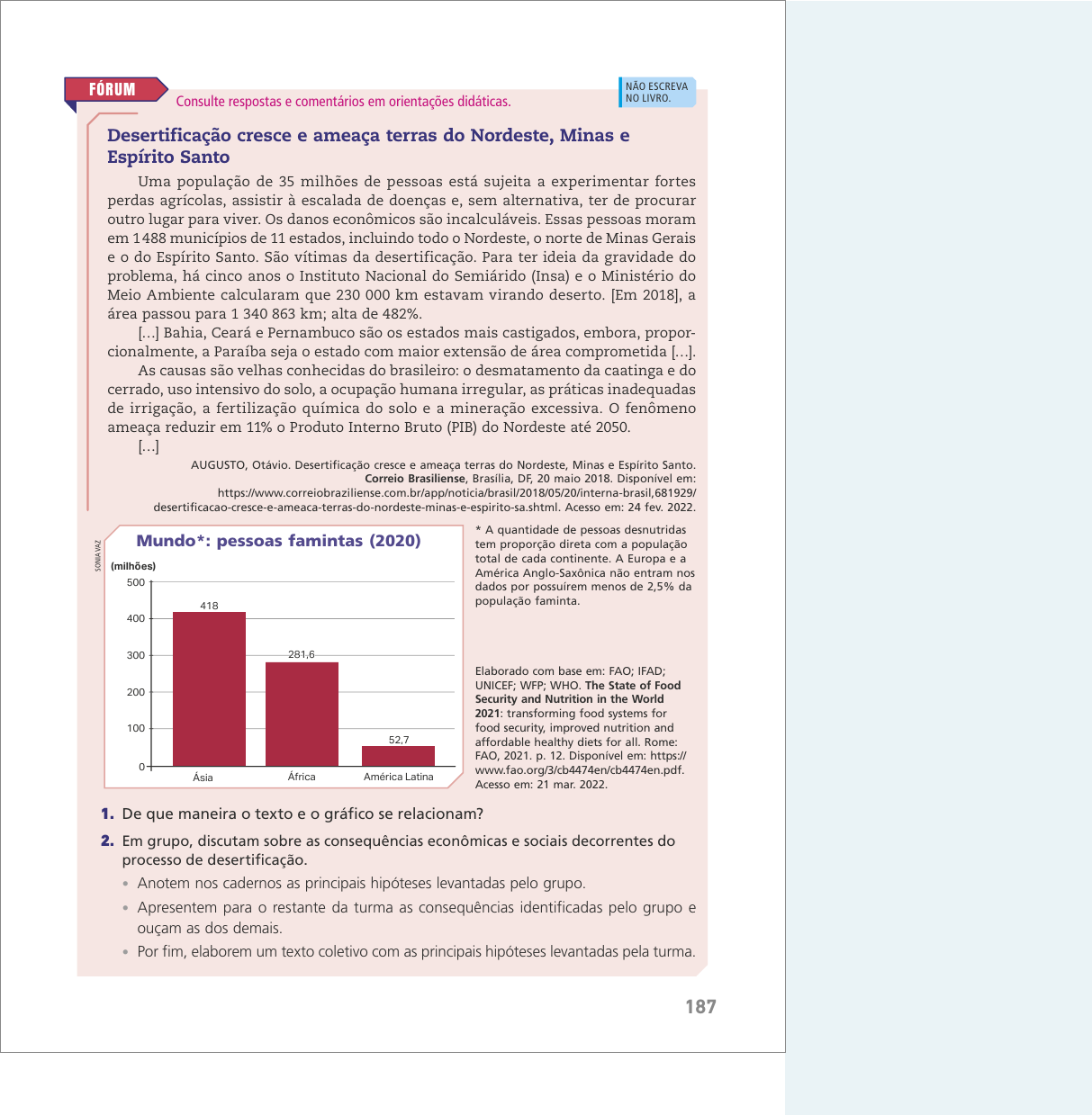 FÓRUM Desertificação cresce e ameaça terras do Nordeste, Minas e Espírito Santo Uma população de 35 milhões de pessoas está sujeita a experimentar fortes perdas agrícolas, assistir à escalada de doenças e, sem alternativa, ter de procurar outro lugar para viver. Os danos econômicos são incalculáveis. Essas pessoas moram em 1 488 municípios de 11 estados, incluindo todo o Nordeste, o norte de Minas Gerais e o do Espírito Santo. São vítimas da desertificação. Para ter ideia da gravidade do problema, há cinco anos o Instituto Nacional do Semiárido (Insa) e o Ministério do Meio Ambiente calcularam que 230 000 km estavam virando deserto. [Em 2018], a área passou para 1 340 863 km; alta de 482%. […] Bahia, Ceará e Pernambuco são os estados mais castigados, embora, propor- cionalmente, a Paraíba seja o estado com maior extensão de área comprometida […]. As causas são velhas conhecidas do brasileiro: o desmatamento da caatinga e do cerrado, uso intensivo do solo, a ocupação humana irregular, as práticas inadequadas de irrigação, a fertilização química do solo e a mineração excessiva. O fenômeno ameaça reduzir em 11% o Produto Interno Bruto (PIB) do Nordeste até 2050. […] AUGUSTO, Otávio. Desertificação cresce e ameaça terras do Nordeste, Minas e Espírito Santo. Correio Brasiliense, Brasília, DF, 20 maio 2018. Disponível em: https://www.correiobraziliense.com.br/app/noticia/brasil/2018/05/20/interna-brasil,681929/ desertificacao-cresce-e-ameaca-terras-do-nordeste-minas-e-espirito-sa.shtml. Acesso em: 24 fev. 2022. NÃO ESCREVA NO LIVRO. 1. De que maneira o texto e o gráfico se relacionam? 2. Em grupo, discutam sobre as consequências econômicas e sociais decorrentes do processo de desertificação. • Anotem nos cadernos as principais hipóteses levantadas pelo grupo. • Apresentem para o restante da turma as consequências identificadas pelo grupo e ouçam as dos demais. • Por fim, elaborem um texto coletivo com as principais hipóteses levantadas pela turma. 0 100 200 300 400 500 (milhões) Ásia 418 África América Latina 281,6 52,7 Mundo*: pessoas famintas (2020) Elaborado com base em: FAO; IFAD; UNICEF; WFP; WHO. The State of Food Security and Nutrition in the World 2021: transforming food systems for food security, improved nutrition and affordable healthy diets for all. Rome: FAO, 2021. p. 12. Disponível em: https:// www.fao.org/3/cb4474en/cb4474en.pdf. Acesso em: 21 mar. 2022. * A quantidade de pessoas desnutridas tem proporção direta com a população total de cada continente. A Europa e a América Anglo-Saxônica não entram nos dados por possuírem menos de 2,5% da população faminta. Consulte respostas e comentários em orientações didáticas. SO N IA V A Z 187 FÓRUM Nesta seção, é possível aprofundar o problema da desertificação. Sob a perspectiva da diminuição da produtividade agrícola, o texto apresenta os impactos ambientais (EF06GE11 e EF07GE13) que ocorrem em várias regiões do Brasil, tra- zendo o problema para a realidade do contexto nacional. Realize a leitura com os estu- dantes e exercite habilidades de leitura de textos. Essa atividade pode contemplar o TCT Saúde – saúde. Trabalhando a prática de pesquisa com elaboração de entrevistas, é interessante pedir aos estudantes que façam uma investigação sobre o problema da fome no Brasil, a começar de seu lugar de vivência. Uma suges- tão é partir de uma perspectiva social, considerando histórias de vida de pessoas que já pas- saram por dificuldades ou que conheceram sujeitos que esti- veram ou estão em situação de fome. Por isso, recolha histórias orais e narrativas autobiográficas em práticas que possam sensibi- lizar os estudantes e ensiná-los a compreender os problemas da sociedade em que estão inseri- dos. Peça-lhes que organizem as histórias em textos, reme- tendo a habilidades de Língua Portuguesa, como produção escrita e leitura de histórias. Faça uma roda de conversa em que todos os estudantes possam compartilhar suas histórias e compreender situações viven- ciadas por pessoas próximas. O objetivo principal dessa atividade é desenvolver a empatia.Atividades 1. O texto fala sobre a desertificação e o modo como esse fenômeno pode prejudicar tanto a sociedade quanto a economia. O gráfico trata da fome no mundo, que atinge grande quantidade de pessoas na Ásia, na África e na América Latina. O texto e o gráfico se rela- cionam pelo fato de a desertificação ser um processo que esgota os solos e impossibilita o cultivo de alimentos; dessa forma, pode locais, causando mais desmata- mento e prejuízos ambientais. Além disso, os impactos podem ser percebidos em outras áreas, caso a população passe a procurar abrigo nelas, como refugiados ambientais. aumentar a situação de fome à qual muitas pessoas estão sujeitas. 2. Produção coletiva. Os prejuízos sociais da desertificação ocorrem quando esse fenô- meno atinge locais onde há agricultura de subsistência. Já os prejuízos econômicos se devem à desvalorização das terras desertifi- cadas, à improdutividade agrícola dos solos e à perda de espaço para as práticas econômi- cas, que terão de ser desenvolvidas em outros 187