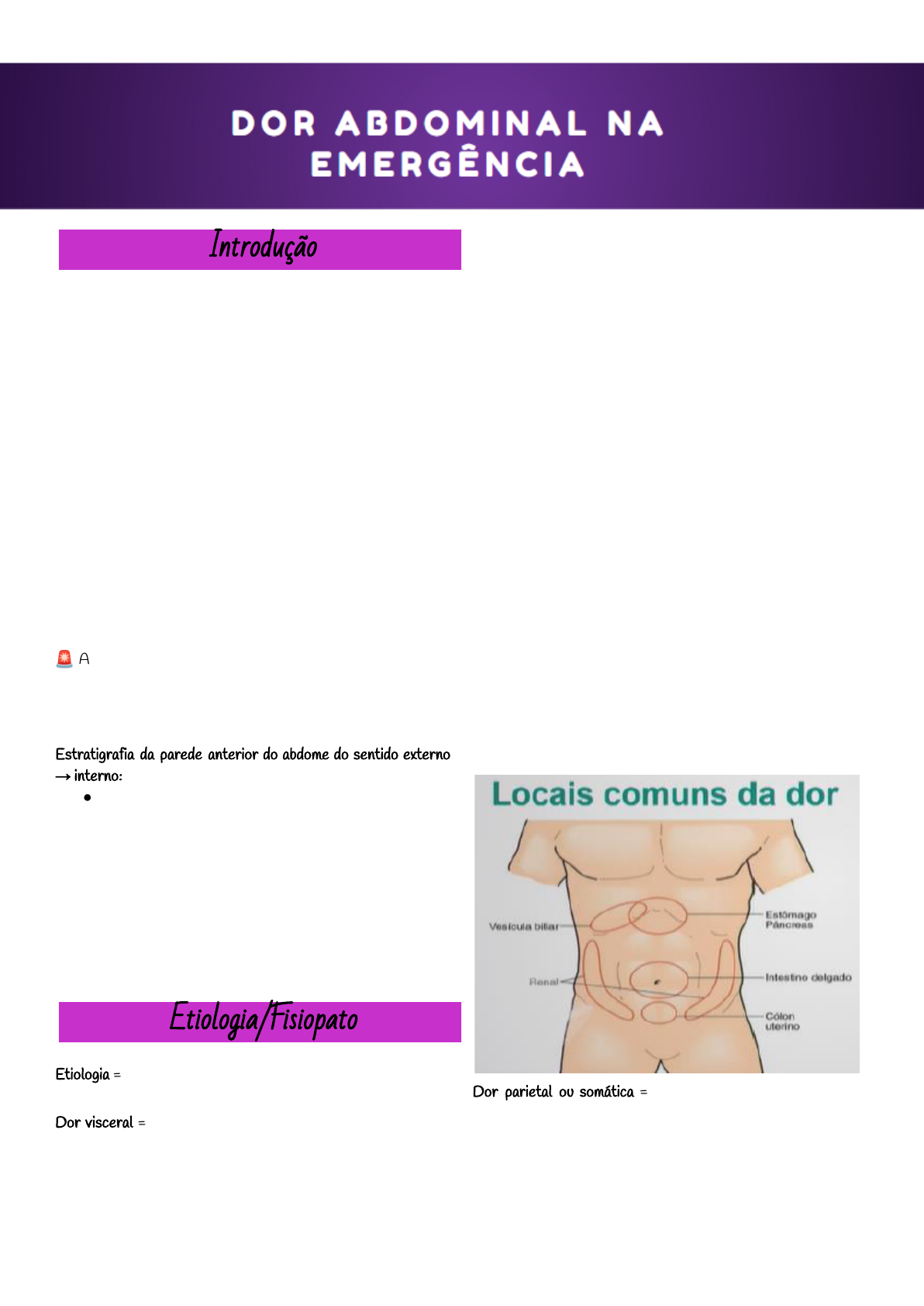 Sandy Vanessa Med 08 - UFPE-CAA Introdução Difícil diagnóstico = apresentações variadas, grande número de diferenciais, variabilidade do quadro clínico de acordo com gênero, idade, etc… Pacientes idosos = mais chances de diagnóstico fatal ● Apendicite aguda ● Diverticulite ● Ruptura de aneurisma de aorta abdominal ● Isquemia mesentérica. Pacientes imunodeprimidos = manifestações atípicas, sutis e variáveis. Em mulheres o diagnóstico diferencial é amplo e inclui condições pélvicas, reprodutivas e relacionadas à gestação 🚨 A abordagem inicial visa o diagnóstico ou descartar abdome agudo = causas potencialmente graves, nas quais o quadro necessita de definição diagnóstica e conduta imediatas. Estratigrafia da parede anterior do abdome do sentido externo → interno: ● Pel ● Tela subcutânea/fáscia superficial (fáscia de Camper e de Scarpa) ● Aponeurose ● Músculo ● Fáscia transversal (fáscia endoabdominal) ● Tecido extraperitneal ● Peritônio. Etiologia/Fisiopato Etiologia = maioria TGI ou TGU. Dor visceral = relacionada com inervação de fibras aferentes de órgãos intra-abdominais. Fraca correlação localizatória e pode ocorrer por distensão de órgãos por gás ou distensão da cápsula de órgãos por edema, sangue, massa ou abscesso. = Dor difusa e insidiosa ● Referida ou verdadeira. ● Dor visceral referida: miótomos e dermátomos supridos por neurônios que se projetam nos mesmos segmentos medulares das vísceras afetadas ● Dor visceral verdadeira: inervação de fibras aferentes na parede do órgão, caracteriza-se por ser mal localizada em epigastro, mesogastro e hipogastro, geralmente associado a náusea, vômito, sudorese ou palidez ● Aorta e rins = retroperitoneais = dor na região dorsal. ● Os nociceptores viscerais podem ser estimulados por distensão, estiramento, contração vigorosa e isquemia. ● Intestino anterior = Estruturas peritoneais = estômago, pâncreas, fígado, vias biliares e duodeno proximal = região epigástrica. ● Intestino médio = O resto do intestino delgado e 1/3 proximal do cólon, incluindo o apêndice = estruturas do intestino médio= região periumbilical = mesogástrio ● Intestino posterior = Bexiga e 2/3 distais do cólon, órgãos pélvicos genitourinários = região suprapúbica = hipogástrio Dor parietal ou somática = ocorre pela irritação do peritônio parietal. Sentida na pele e no peritônio parietal. Costuma ser de forte intensidade e a dor à descompressão brusca costuma estar presente (sinal de Blumberg). = Dermátomo correspondente a área do estímulo. 1 Sandy Vanessa Med 08 - UFPE-CAA ● Fibras mielinizadas que trafegam por locais específicos da medula, correlacionando melhor o local da dor. Ocorre irritação do peritônio parietal = dor de forte intensidade que piora à palpação. Ex: diverticulite aguda - fossa ilíaca esquerda. Dor referida = resulta da sensação de dor diferente de seu local de origem, como a dor em ombros por irritação diafragmática ou patologias intratorácicas simulando dor abdominal. ● Captada no mesmo segmento medular para dermátomo e víscera. ● Inflamação hepática e da vesícula: pode ter uma dor referida no ombro direito ou escápula direita. ● Pancreatite = escápula esquerda Dor abdominal neuropática = localiza-se em região de distribuição de uma ou mais raízes nervosas torácicas caudais (D8-D12) em queimação, choque, pontada ou formigamento, associado a alterações sensitivas e motoras locais QID QIE ● Apendicite ● Divertículo de Meckel ● Diverticulite cecal ● Aneurisma de aorta ● Gestação ectópica ● Cistos ovarianos ou torção de ovário ● Endometriose ● Cálculos ureterais ● Abscesso de psoas ● Adenite mesentérica ● Hérnia estrangulada ● Pielonefrite ● Diverticulite ● Patologias ovarianas ● Hérnia estrangulada Gestação ectópica ● Doença pélvica inflamatória ● Cálculos ureterais ● Abscesso de psoas ● Pielonefrite Dor difusa QSD QSE ● Peritonite ● Pancreatite ● Crise álgica por anemia falciforme ● Cetoacidose diabética ● Isquemia mesentérica ● Gastroenterite ● Aneurisma ou dissecção de aorta ● Doença inflamatória intestinal ● Intestino irritável ● Obstrução intestinal ● Intolerância a lactose ● Insuficiência adrenal ● Porfiria intermitente aguda ● Cólica biliar ● Colecistite ● Colangite ● Abscesso hepático ● Síndrome dispéptica ● Congestão hepática ● Peri-hepatites ● Trombose hepática ● Apendicite retrocecal ● Embolia pulmonar ● Pneumonia ● Pancreatite ● Refluxo gastroesofágico ● Síndromes dispépticas ● Pancreatite ● Refluxo gastroesofágico ● Esplenomegalia ou abscesso esplênico ● Isquemia miocárdica ● Miocardites e pericardites ● Pneumonia Sistêmicas ● Cetoacidose diabética ● Anemia falciforme ● Lúpus eritematoso sistêmico ● Porfiria ● Uremia Torácicas ● Infarto ● Pericardite/miocardite ● Pneumonia ● Embolia pulmonar ● DIssecção aguda de aorta Toxicológicas ● Intoxicação por ferro/chumbo ● Acidentes por animais peçonhentos Infecciosas ● Febre tifóide ● Arboviroses ● Mononucleose ● Faringoamigdalite 2 Sandy Vanessa Med 08 - UFPE-CAA Parede abdominal ● Espasmo muscular/ hematoma ● Hérpes-zóster Genitourinárias ● Torção testicular Avaliação História completa = alguns dados são MUITO relevantes: ● Antecedentes de cirurgias e comorbidades ● Fatores de melhora ou piora ● Tipo da dor ● Aguda ou crônica? ● Região e radiação ● Gravidade ● Fatores temporais e modo de início, progressão e episódios anteriores. ● Uso de fármacos, bebidas alcoólicas, alimentos ingeridos, defecação, jejum. ● Associação com o período menstrual, traumatismos ou cicatrizes. ● Peso, febre, anemia, adinamia, síncopes, obstipação, distensão abdominal, eructações, pirose, saciedade precoce, emp
