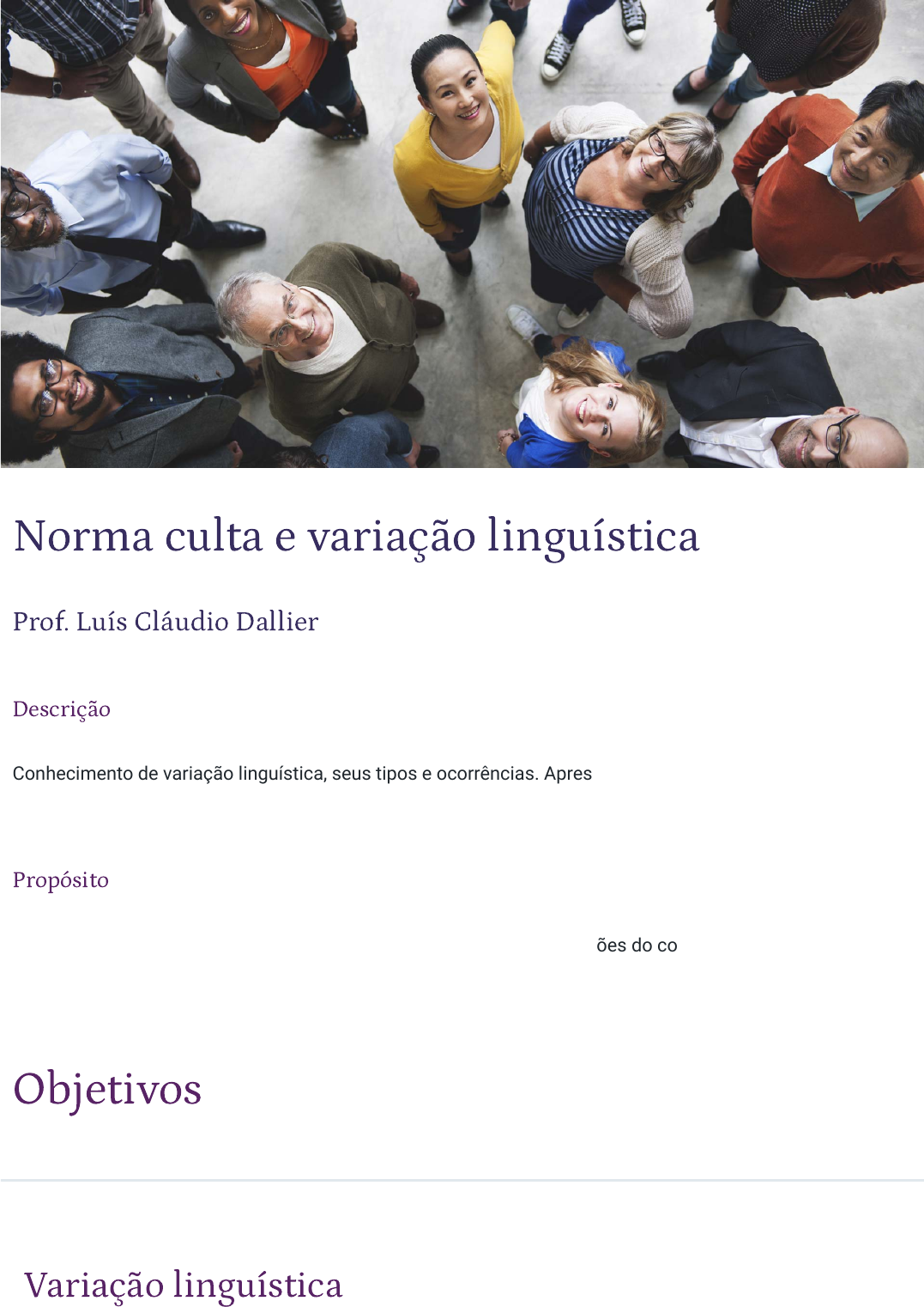 16/05/2023, 20:47 Norma culta e variação linguística https://stecine.azureedge.net/repositorio/00212hu/00227/index.html# 1/36 Norma culta e variação linguística Prof. Luís Cláudio Dallier Descrição Conhecimento de variação linguística, seus tipos e ocorrências. Apresentação da norma culta e seu uso na comunicação. Propósito Compreender os diferentes casos de variação linguística e as implicações do conceito de norma culta no uso adequado da língua portuguesa. Objetivos Módulo 1 Variação linguística 16/05/2023, 20:47 Norma culta e variação linguística https://stecine.azureedge.net/repositorio/00212hu/00227/index.html# 2/36 Reconhecer diferentes tipos e manifestações da variação linguística no português. Módulo 2 O que é a norma culta Identificar o conceito de norma culta e suas implicações no uso da língua portuguesa. Você já percebeu que a língua portuguesa apresenta variações em relação à pronúncia ou ao significado de algumas palavras dependendo da localidade do falante? Isso acontece porque a língua é algo vivo, dinâmico, e seu uso no dia a dia implica variações que estão relacionadas com a região, a profissão, o grau de escolaridade e outros fatores do usuário da língua. Reconhecer que a língua apresenta diversidades no seu uso é importante para identificarmos em que situações de comunicação uma variedade da língua é apropriada ou inadequada. Na verdade, precisamos conhecer a norma culta da língua para reconhecermos as diferentes manifestações das variações em relação a essa norma ou padrão. Por isso, vamos estudar alguns casos de variação linguística para depois compreendermos o que é e como funciona a norma culta da língua. Introdução 16/05/2023, 20:47 Norma culta e variação linguística https://stecine.azureedge.net/repositorio/00212hu/00227/index.html# 3/36 1 - Variação linguística Ao �nal deste módulo, você será capaz de reconhecer diferentes tipos e manifestações da variação linguística no português. Contextualizando Neste vídeo, o professor Luís Cláudio Dallier faz uma breve contextualização do assunto. Confira! 16/05/2023, 20:47 Norma culta e variação linguística https://stecine.azureedge.net/repositorio/00212hu/00227/index.html# 4/36 Variação linguística: o que é? A língua sofre variações ao longo do tempo, conforme o espaço geográfico, a estrutura social e a situação ou o contexto de uso. Isso significa dizer que uma língua está sujeita a passar por modificações no tempo e no espaço a fim de satisfazer às necessidades de expressão e de comunicação, individuais ou coletivas, de seus usuários. Isso é o que se chama variação linguística. Podemos abordar a variação linguística sob diversas perspectivas. Se levarmos em conta uma situação de comunicação qualquer, teremos alguns elementos que vão apontar para variedades no uso da língua. Essas perguntas evidenciam que nossa fala pode variar de acordo com a situação ou com o contexto, conforme o falante e as pessoas que ouvem (interlocutores), o assunto tratado ou a intenção da mensagem. Perceba que a variação linguística corresponde a diferentes ocorrências de uma mesma língua. Tipos de variações linguísticas Sem nos preocuparmos muito com classificações técnicas e exaustivas, próprias da Sociolinguística, podemos dizer que a variação linguística pode ser de, pelo menos, três tipos: ociolinguística 16/05/2023, 20:47 Norma culta e variação linguística https://stecine.azureedge.net/repositorio/00212hu/00227/index.html# 5/36 Sociolinguística é uma área da Linguística que trata das relações entre linguagem e sociedade, estudando a função social da linguagem e a influência dos fatores sociais sobre a língua. Abordaremos cada um desses tipos a seguir. Variação regional Variações da língua numa perspectiva geográfica, originando os regionalismos. Manifestam-se, principalmente, pelo sotaque e por palavras ou expressões utilizadas pelos falantes de determinada região. Um exemplo desse tipo de variação são os falares ou dialetos. Veja a diferença entre alguns falares no Brasil: Dialetos São variações faladas por comunidades geograficamente definidas. Também denominados “falares” por alguns linguistas. 16/05/2023, 20:47 Norma culta e variação linguística https://stecine.azureedge.net/repositorio/00212hu/00227/index.html# 6/36 Êta que esse curso é bem arretado! Caraca! Esse curso é muito maneiro! Nossinhora! Esse curso é bom demais da conta, sô! Bah, esse curso é tri! 16/05/2023, 20:47 Norma culta e variação linguística https://stecine.azureedge.net/repositorio/00212hu/00227/index.html# 7/36 As diferentes designações no Brasil para um mesmo referente ou aspecto da realidade é outro exemplo de variação linguística na dimensão geográfica: macaxeira no Nordeste, mandioca em São Paulo e aipim no Rio de Janeiro correspondem à mesma raiz utilizada na culinária nacional. Rio de Janeiro X São Paulo O professor Luís Cláudio Dallier explora mais essas diferenças entre as cidades do Rio de Janeiro e São Paulo. Não podemos afirmar que determinada região do país fala “o português mais correto”. Tal afirmação é falsa, pois o que há são variações da língua portuguesa. Exemplo A pronúncia do cearense ou do carioca, por exemplo, não é errada ou certa, mas, simplesmente, o modo próprio de articular os sons numa determinada comunidade linguística. Sendo o português uma língua falada por diversas nações, em diferentes continentes, é interessante lembrar que a língua também varia de um país para outro, tanto na fala quanto na escrita. Ainda que o Novo Acordo Ortográfico da Língua Portuguesa procure padronizar a grafia das palavras, há alguns aspectos na escrita que são peculiares em Portugal e outros no Brasil. 16/05/2023, 20:47 Norma culta e variação linguística https://stecine.azureedge.net/repositorio/0