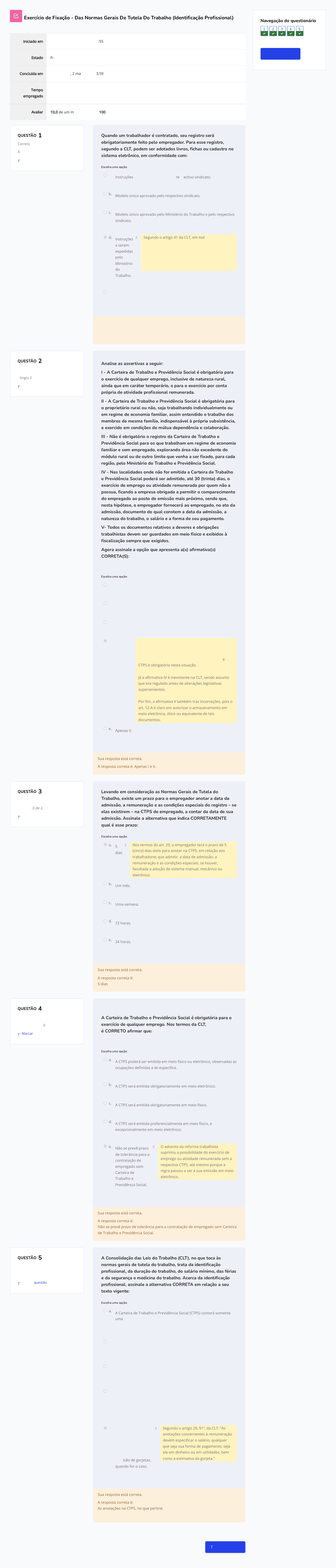 QUESTÃO Correto Atingiu 2,0 de 2,0 Marcar questão QUESTÃO Correto Atingiu 2,0 de 2,0 Marcar questão QUESTÃO Correto Atingiu 2,0 de 2,0 Marcar questão QUESTÃO Correto Atingiu 2,0 de 2,0 Marcar questão QUESTÃO Correto Atingiu 2,0 de 2,0 Marcar questão Terminar revisão Iniciado em quinta-feira, 2 mai. 2024, 13:55 Estado Finalizada Concluída em quinta-feira, 2 mai. 2024, 13:59 Tempo empregado 4 minutos 42 segundos Avaliar 10,0 de um máximo de 10,0(100%) 1 Quando um trabalhador é contratado, seu registro será obrigatoriamente feito pelo empregador. Para esse registro, segundo a CLT, podem ser adotados livros, fichas ou cadastro no sistema eletrônico, em conformidade com: Escolha uma opção: a. Instruções a serem expedidas pelo respectivo sindicato. b. Modelo único aprovado pelo respectivo sindicato. c. Modelo único aprovado pelo Ministério do Trabalho e pelo respectivo sindicato. d. Instruções a serem expedidas pelo Ministério do Trabalho. � Segundo o artigo 41 da CLT, em todas as atividades será obrigatório para o empregador o registro dos respectivos trabalhadores, podendo ser adotados livros, fichas ou sistema eletrônico, conforme instruções a serem expedidas pelo Ministério do Trabalho. e. Modelo único aprovado pelo Ministério do Trabalho. Sua resposta está correta. A resposta correta é: Instruções a serem expedidas pelo Ministério do Trabalho. 2 Analise as assertivas a seguir: I - A Carteira de Trabalho e Previdência Social é obrigatória para o exercício de qualquer emprego, inclusive de natureza rural, ainda que em caráter temporário, e para o exercício por conta própria de atividade profissional remunerada. II - A Carteira de Trabalho e Previdência Social é obrigatória para o proprietário rural ou não, seja trabalhando individualmente ou em regime de economia familiar, assim entendido o trabalho dos membros da mesma família, indispensável à própria subsistência, e exercido em condições de mútua dependência e colaboração. III - Não é obrigatório o registro da Carteira de Trabalho e Previdência Social para os que trabalham em regime de economia familiar e sem empregado, explorando área não excedente do módulo rural ou de outro limite que venha a ser fixado, para cada região, pelo Ministério do Trabalho e Previdência Social. IV - Nas localidades onde não for emitida a Carteira de Trabalho e Previdência Social poderá ser admitido, até 30 (trinta) dias, o exercício de emprego ou atividade remunerada por quem não a possua, ficando a empresa obrigada a permitir o comparecimento do empregado ao posto de emissão mais próximo, sendo que, nesta hipótese, o empregador fornecerá ao empregado, no ato da admissão, documento do qual constem a data da admissão, a natureza do trabalho, o salário e a forma de seu pagamento. V- Todos os documentos relativos a deveres e obrigações trabalhistas devem ser guardados em meio físico e exibidos à fiscalização sempre que exigidos. Agora assinale a opção que apresenta a(s) afirmativa(s) CORRETA(S): Escolha uma opção: a. Apenas I, II e IV. b. Apenas III, IV e V. c. Apenas I. d. Apenas I e II. � A afirmativa I está correta, nos termos do art. 13 da CLT, assim como a II, que está em consonância com o artigo 13, I . A afirmativa III está incorreta, pois conforme se depreende do art. 13, II, o registro na CTPS é obrigatório nesta situação. Já a afirmativa IV é inexistente na CLT, sendo assunto que era regulado antes de alterações legislativas supervenientes. Por fim, a afirmativa V também traz incorreções, pois o art, 12-A é claro em autorizar o armazenamento em meio eletrônico, ótico ou equivalente de tais documentos. e. Apenas V. Sua resposta está correta. A resposta correta é: Apenas I e II. 3 Levando em consideração as Normas Gerais de Tutela do Trabalho, existe um prazo para o empregador anotar a data da admissão, a remuneração e as condições especiais do registro – se elas existirem – na CTPS do empregado, a contar da data de sua admissão. Assinale a alternativa que indica CORRETAMENTE qual é esse prazo: Escolha uma opção: a. 5 dias � Nos termos do art. 29, o empregador terá o prazo de 5 (cinco) dias úteis para anotar na CTPS, em relação aos trabalhadores que admitir, a data de admissão, a remuneração e as condições especiais, se houver, facultada a adoção de sistema manual, mecânico ou eletrônico. b. Um mês. c. Uma semana. d. 72 horas. e. 24 horas. Sua resposta está correta. A resposta correta é: 5 dias 4 A Carteira de Trabalho e Previdência Social é obrigatória para o exercício de qualquer emprego. Nos termos da CLT, é CORRETO afirmar que: Escolha uma opção: a. A CTPS poderá ser emitida em meio físico ou eletrônico, observadas as ocupações definidas e lei específica. b. A CTPS será emitida obrigatoriamente em meio eletrônico. c. A CTPS será emitida obrigatoriamente em meio físico. d. A CTPS será emitida preferencialmente em meio físico, e excepcionalmente em meio eletrônico. e. Não se prevê prazo de tolerância para a contratação de empregado sem Carteira de Trabalho e Previdência Social. � O advento da reforma trabalhista suprimiu a possibilidade do exercício de emprego ou atividade remunerada sem a respectiva CTPS, até mesmo porque a regra passou a ser a sua emissão em meio eletrônico. Sua resposta está correta. A resposta correta é: Não se prevê prazo de tolerância para a contratação de empregado sem Carteira de Trabalho e Previdência Social. 5 A Consolidação das Leis do Trabalho (CLT), no que toca às normas gerais de tutela do trabalho, trata da identificação profissional, da duração do trabalho, do salário mínimo, das férias e da segurança e medicina do trabalho. Acerca da identificação profissional, assinale a alternativa CORRETA em relação a seu texto vigente: Escolha uma opção: a. A Carteira de Trabalho e Previdência Social (CTPS) conterá somente 