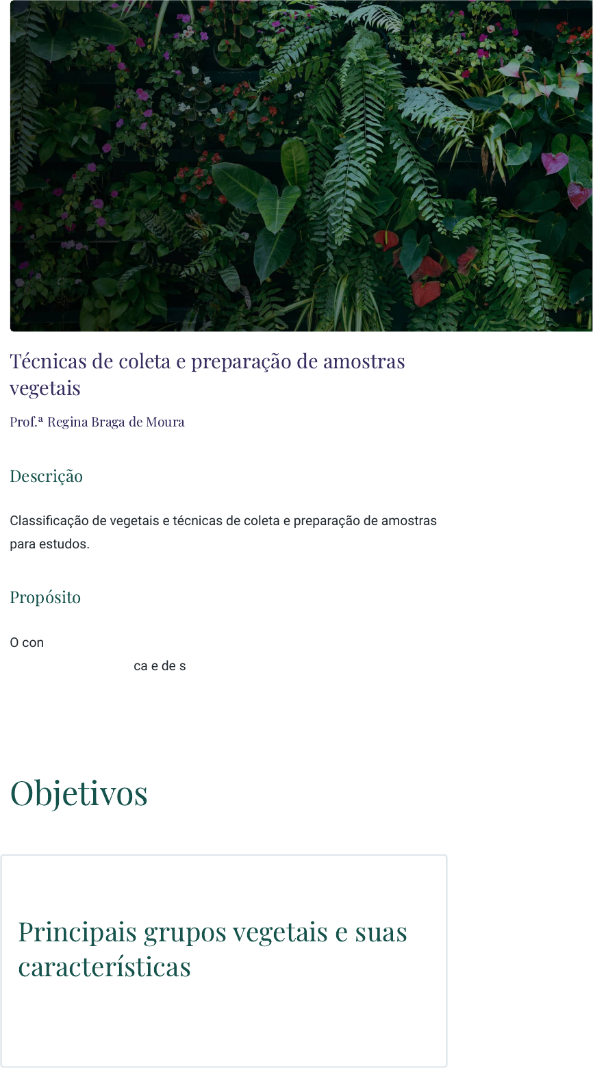 03/03/24, 06:03 Técnicas de coleta e preparação de amostras vegetais https://stecine.azureedge.net/repositorio/00212sa/03025/index.html# 1/64 Técnicas de coleta e preparação de amostras vegetais Prof.ª Regina Braga de Moura Descrição Classificação de vegetais e técnicas de coleta e preparação de amostras para estudos. Propósito O conhecimento da diversidade da flora de interesse medicinal, de sua nomenclatura científica e de seu sistema de classificação filogenético, bem como o domínio das técnicas de coleta e preparação adequada de amostras botânicas, é essencial para profissionais que estudam a flora. Objetivos Módulo 1 Principais grupos vegetais e suas características Identificar os principais grupos vegetais. 03/03/24, 06:03 Técnicas de coleta e preparação de amostras vegetais https://stecine.azureedge.net/repositorio/00212sa/03025/index.html# 2/64 Módulo 2 Coleta e preparação de amostras botânicas macroscópicas Descrever as técnicas de coleta e preparação de amostras macroscópicas. Módulo 3 Coleta e preparação de amostras botânicas para microscopia Descrever as técnicas de coleta e preparação de amostras para microscopia. O estudo da flora – seja para conhecimento de sua diversidade, seja para propósitos terapêuticos – deve começar pela identificação correta dos táxons estudados. Atualmente, o sistema de classificação das plantas é o filogenético. Esse sistema se baseia em vários caracteres, especialmente os moleculares. Ainda assim, a morfologia e a anatomia continuam sendo empregadas como ferramentas primordiais para descrição de novas espécies, autenticação de drogas vegetais e plantas medicinais. De modo geral, podemos distinguir quatro grandes grupos vegetais na natureza: Briófitas; Pteridófitas; Gimnospermas; Angiospermas. Introdução 03/03/24, 06:03 Técnicas de coleta e preparação de amostras vegetais https://stecine.azureedge.net/repositorio/00212sa/03025/index.html# 3/64 A maioria das plantas medicinais está no grupo das Angiospermas, por isso, vamos focar esse grupo em nossos estudos. A morfologia e a anatomia são ferramentas importantes para identificarmos os grupos taxonômicos e, dentro deles, distinguirmos seus diversos representantes. Em estudos morfológicos, anatômicos e mesmo moleculares, as amostras de vegetais precisam estar adequadas, de modo a permitir a identificação do táxon, bem como a descrição precisa das suas características. Dominar as técnicas de coleta e preparação de amostras para estudos morfológicos e anatômicos faz parte, portanto, das habilidades do profissional que vai estudar a flora, seja medicinal ou não. Vamos começar nossos estudos conhecendo a organização dos grupos vegetais atuais e as características que podem auxiliar na sua identificação. Orientação sobre unidade de medida Em nosso material, unidades de medida e números são escritos juntos (ex.: 25km) por questões de tecnologia e didáticas. No entanto, o Inmetro estabelece que deve existir um espaço entre o número e a unidade (ex.: 25 km). Logo, os relatórios técnicos e demais materiais escritos por você devem seguir o padrão internacional de separação dos números e das unidades. 03/03/24, 06:03 Técnicas de coleta e preparação de amostras vegetais https://stecine.azureedge.net/repositorio/00212sa/03025/index.html# 4/64 1 - Principais grupos vegetais e suas características Ao �nal deste módulo, você será capaz de identi�car os principais grupos vegetais. Conceitos em sistemática vegetal Em sistemática vegetal, precisamos dominar alguns conceitos importantes para compreendermos a classificação das plantas. São eles: Taxonomia Identifica, descreve, nomeia e classifica um táxon. Classi�cação Categorização hierárquica. Sistemática Estudo das relações parentais entre os diferentes grupos de plantas, considerando sua história evolutiva. 03/03/24, 06:03 Técnicas de coleta e preparação de amostras vegetais https://stecine.azureedge.net/repositorio/00212sa/03025/index.html# 5/64 Táxon Nome de cada grupo de organismos. Por exemplo: Cactaceae é o táxon que agrupa todos os gêneros e espécies de cactos. Clado Qualquer grupo monofilético. Grupo mono�lético Grupo de organismos cujos membros compartilham um ancestral comum e exclusivo. Categoria taxonômica Nível hierárquico em que um táxon se encontra. Por exemplo: família é a categoria taxonômica do táxon Cactaceae. Grado Grupo de organismos cujos membros estão no mesmo nível de organização, mas não possuem ancestral comum. 03/03/24, 06:03 Técnicas de coleta e preparação de amostras vegetais https://stecine.azureedge.net/repositorio/00212sa/03025/index.html# 6/64 Sistema de classi�cação �logenético das plantas Observe as imagens a seguir, que apresentam uma carqueja, um girassol e um assa-peixe: Carqueja Girassol 03/03/24, 06:03 Técnicas de coleta e preparação de amostras vegetais https://stecine.azureedge.net/repositorio/00212sa/03025/index.html# 7/64 Assa-Peixe As três plantas pertencem à mesma família botânica: a Asteraceae. Mas como isso pode ser possível se elas são tão diferentes? Embora tenham aparência diferente, a carqueja, o girassol e o assa- peixe compartilham características semelhantes que, apesar de nem sempre serem facilmente visíveis, fazem com que essas plantas se tornem membros da mesma família. Tais plantas são, contudo, de gêneros diferentes: a carqueja é do gênero Baccharis, o girassol é do gênero Helianthus e o assa-peixe é do gênero Vernonia. Esse é um agrupamento atual, com base em várias características, inclusive morfológicas e, principalmente, moleculares. Mas nem sempre foi assim. O Species Plantarum, escrito em 1753, serviu de referência para a nomenclatura botânica. A diversidade dos seres viventes sempre foi alvo de interesse de filósofos, naturalistas e botânicos ao longo da existência da humanidade. A busca pelo conhecim