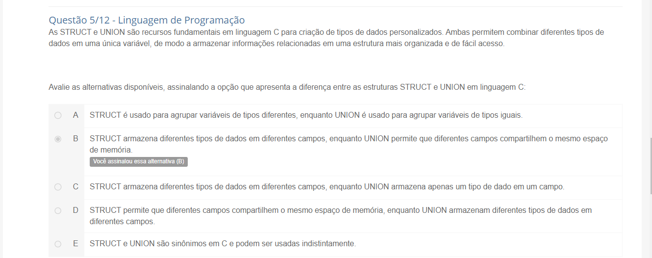 A STRUCT é usado para agrupar variáveis de tipos diferentes, enquanto UNION é usado para agrupar variáveis de tipos iguais. B STRUCT armazena diferentes tipos de dados em diferentes campos, enquanto UNION permite que diferentes campos compartilhem mesmo espaço de Você assinalou essa alternativa (B) C STRUCT armazena diferentes tipos de dados em diferentes campos, enquanto UNION armazena apenas um tipo de dado em um campo. D STRUCT permite que diferentes campos compartilhem mesmo espaço de enquanto UNION armazenam diferentes tipos de dados em diferentes campos. E STRUCT e UNION são sinônimos em C e podem ser usadas