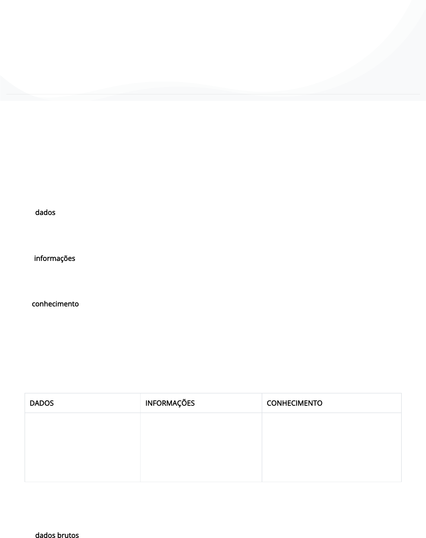 Nesta webaula, abordaremos aspectos nos permitem diferenciar informações, dados e conhecimento. Nos dias atuais, temos um grande volume de informação disponível a nós apenas por um clique. Com tanta informação disponível, é comum nós assimilarmos inteligência com quantidade de informação, mas essa conexão pode ser bastante enganosa. Tratar a informação e o conhecimento como sinônimos é uma crença bastante comum nos nossos tempos. Nós lidamos com dados, informações e conhecimento diariamente, todavia muitas vezes os tomamos como sinônimos e cabe saber diferenciá-los. Os dados podem ser de�nidos como a matéria-prima da informação, eles representam signi�cados que isoladamente não transmitem nenhuma mensagem ou conhecimento. Em uma pesquisa de opinião sobre a qualidade de um produto, por exemplo, a coleta da opinião de cada pessoa só poderá produzir alguma informação signi�cativa sobre a satisfação com o produto depois de ser tratada e agregada às demais. As informações, por sua vez, são os dados tratados. A informação é resultado do processamento dos dados coletados que interessam ao pesquisador. Como elas possuem signi�cado, auxiliam no processo de tomadas de decisão. Com base no exemplo da pesquisa de opinião, a informação expressaria os níveis de satisfação das pessoas entrevistadas com o produto, revelando se a imagem que elas têm é positiva ou negativa. O conhecimento está além da informação porque tem tanto signi�cado como aplicação. O conhecimento envolve nossa faculdade de abstração, em que se é capaz de produzir novas ideias a partir das informações que temos em dado momento. Com base nessa diferenciação, apresentaremos um resumo sobre dados. Veja um resumo das principais características desses três pilares: Diferenciação entre dados, informações e conhecimento DADOS INFORMAÇÕES CONHECIMENTO Os dados são observações simples sobre do mundo, facilmente estruturados e que podem ser obtidos por meio de maquinários. São quanti�cáveis e transferíveis. As informações são dados tratados em termos de relevância e propósito. Sempre exigem intervenção humana, pois precisam de um consenso acerca de seu signi�cado. O conhecimento é a informação tratada em termos de re�exão, síntese e contexto. Sua estruturação é difícil, já que não é fácil construí-lo por meio de máquinas, e frequentemente é difícil transferi-lo. Fonte: elaborada pela autora. Dados Os dados brutos são observações não estruturadas e desorganizadas que devem ser tratadas para que possam oferecer uma informação e, portanto, ganharem signi�cância. Os dados não possuem uma �nalidade incutida neles, diferentemente da informação. Os dados são a matéria-prima da informação, enquanto esta é matéria- prima do conhecimento. Pensamento Cientí�ico Quais fatores podem interferir em uma análise? Você sabia que seu material didático é interativo e multimídia? Isso signi�ca que você pode interagir com o conteúdo de diversas formas, a qualquer hora e lugar. Na versão impressa, porém, alguns conteúdos interativos �cam desabilitados. Por essa razão, �que atento: sempre que possível, opte pela versão digital. Bons estudos! Os dados podem ser estruturados, em tabelas, grá�cos, árvore de dados. Já as informações são linguagens, ideias e pensamentos com base nos dados fornecidos. Nesta seção, você aprendeu a diferenciar informação, dados e conhecimento. Paul Otlet (1868-1944) é considerado um dos pais da ciência da informação. Otlet desenvolveu inúmeros ensaios sobre como coletar e organizar o conhecimento do mundo na década de 1890 e, no �nal da vida pro�ssional, resumiu suas ideias em dois grandes livros de síntese, o Traité de documentation, em 1934, e o Monde: Essai d'universalisme, em 1935. A principal preocupação do advogado belga era a questão de como tornar o conhecimento disponível para aqueles que precisam dele. Dados, informação e conhecimento Fonte: elaborada pela autora. Os dados podem ser classi�cados em quantitativos e qualitativos. Os dados quantitativos são numéricos e usados para medir ou contar, classi�cando-se em discretos e contínuos. Os dados qualitativos são não numéricos, expressam atributo ou qualidade, classi�cando-se em nominais e ordinais. Classi�cação dos dados Fonte: elaborada pela autora.