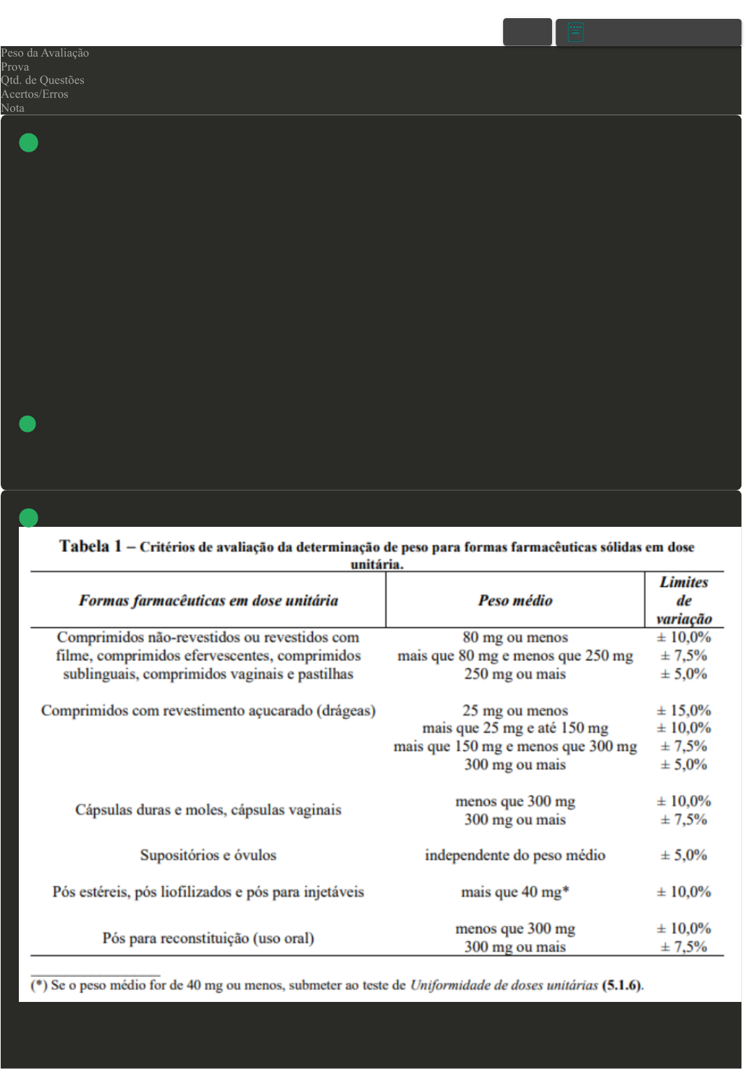 Prova Impressa GABARITO | Avaliação II - Individual (Cod.:954869) Peso da Avaliação 2,00 Prova 80678829 Qtd. de Questões 10 Acertos/Erros 10/0 Nota 10,00 “A estabilidade depende de fatores ambientais como temperatura, umidade e luz, e de outros inerentes ao produto como propriedades físicas e químicas de substâncias ativas e dos demais componentes da formulação, forma de apresentação, tipo e propriedades dos materiais de embalagem. [...] Conjunto de testes projetados para obter informações sobre a estabilidade de produtos quanto aos limites previamente especificados, visando definir seu prazo de validade e período de utilização em embalagem e condições de estocagem determinadas” (BRASIL, [20--?], on-line). Fonte: BRASIL. Agência Nacional de Vigilância Sanitária. Guia para a realização de estudos de estabilidade de produtos saneantes. Brasília: Anvisa, [20--?]. Disponível em: https://abrassam.org.br/legislacao/guia_estabilidade.pdf. Acesso em: 29 jul. 2023. Com base no estudo de estabilidade acelerada em indústrias farmacêuticas, analise as afirmativas a seguir: I. É realizado apenas com medicamentos. II. É realizado para selecionar formulações e recipientes adequados para o desenvolvimento do produto. III. É realizado para acelerar a degradação química ou mudanças físicas de um produto farmacêutico em condições forçadas de armazenamento. IV. É realizado para avaliar o impacto de curtas exposições em condições fora daquelas estabelecidas no rótulo de um produto, que podem ocorrer durante o transporte, por exemplo. É correto o que se afirma em: A I, II e III, apenas. B II e IV, apenas. C II, III e IV, apenas. D III e IV, apenas. Observe a tabela a seguir: Fonte: BRASIL. Ministério da Saúde. Agência Nacional de Vigilância Sanitária. Farmacopeia Brasileira: volume 1. 6. ed. Brasília: MS; Anvisa, 2019. p. 61. Disponível em: https://www.gov.br/anvisa/pt-br/assuntos/farmacopeia/farmacopeia-brasileira. Acesso em: 12 jan. 2024. Com base na tabela e nos métodos oficiais aplicados a medicamentos, identifique outro método também pode ser aplicado: A Dimensões. VOLTAR A+ Alterar modo de visualização 1 2 26/04/2024, 10:49 Avaliação II - Individual about:blank 1/4 B Aspecto. C Dureza. D Cor. Medicamento é o produto farmacêutico, tecnicamente obtido ou elaborado, que contém um ou mais fármacos e outras substâncias, com finalidade profilática, curativa, paliativa ou para fins de diagnóstico. Como a sua qualidade pode ser afetada por diversas causas, é importante avaliar os fatores físico-químicos fundamentais, principalmente aqueles envolvidos com o crescimento microbiano. Fonte: adaptado de: BRASIL. Ministério da Saúde. Agência Nacional de Vigilância Sanitária. Farmacopeia Brasileira: volume 1. 6. ed. Brasília: Ms; Anvisa, 2019. Disponível em: https://www.gov.br/anvisa/pt-br/assuntos/farmacopeia/farmacopeia-brasileira. Acesso em: 12 jan. 2024. Com base no texto e nos principais parâmetros que podem interferir no crescimento microbiano, assinale a alternativa correta: A O oxigênio é necessário para o crescimento de bactérias anaeróbias. B Os operadores são uma fonte de contaminação, pois alteram a atividade de água em um produto. C O pH abaixo de 4 e acima de 10 é desfavorável para o crescimento de microrganismos. D O pH abaixo de 4 proporciona condições ideais de crescimento para bolores e leveduras. “É definida pela Organização Mundial da Saúde (OMS) como a capacidade destes manterem as suas características químicas, físicas, microbiológicas e biofarmacêuticas especificadas durante todo o prazo de validade. [...] constitui um importante parâmetro para assegurar a qualidade e, consequentemente, a segurança e eficácia dos insumos farmacêuticos ativos (IFAs) e dos produtos farmacêuticos”(FACCI et al., 2020, p. 959). Fonte: FACCI, J. et al. Evolução da legislação e das técnicas analíticas aplicadas a estudos de estabilidade de insumos e produtos farmacêuticos. Química Nova, v. 43, p. 959-973, 2020.Disponível em: https://www.scielo.br/j/qn/a/KR94Br7H99ZSrxkXpcrQLMk/?lang=pt. Acesso em: 12 jan. 2024. Com base no texto e na avaliação técnica de medicamentos, sobre o conceito apresentado no texto, assinale a alternativa correta: A Estudos farmacocinéticos. B Estudos de estabilidade. C Estudo de degradação. D Estudo de conservação. “Em 1963, a 16ª Assembleia Mundial em Saúde reafirmou a necessidade de ação imediata perante as reações adversas a medicamentos, com o objetivo de promover rápida disseminação da informação, o que levou à criação do projeto piloto de pesquisa da OMS (Organização Mundial da Saúde) para monitorização internacional de medicamentos em 1968. Iniciou-se assim a prática eficiência da farmacovigilância” (MIRCO; ROCHA, 2007, on-line). Fonte: MIRCO, J.; ROCHA, M. S. da. Estudo de estabilidade de medicamentos. Revista Acadêmica Oswaldo Cruz, v. 2, n. 7, 2007. Disponível em: https://oswaldocruz.br/revista_academica/content/pdf/Edicao_07_Jessica_mirco.pdf. Acesso em: 12 jan. 2024. Com base no trecho e sobre o estudo de estabilidade de longa duração, analise as afirmativas a seguir: I. Deve ser realizado por laboratórios terceirizados. II. Deve ser realizado somente em produtos intermediários. III. Deve ser realizado com cosméticos, medicamentos e alimentos para avaliar a estabilidade do produto. IV. Deve fornecer informações precisas sobre a durabilidade do produto em condições reais de armazenamento.É correto o que se afirma em: A I e II, apenas. B III e IV, apenas. C I e IV, apenas. D II e III, apenas. 3 4 5 26/04/2024, 10:49 Avaliação II - Individual about:blank 2/4 “A qualidade microbiana é uma característica essencial para o funcionamento do produto, principalmente quanto à segurança e aceitabilidade, já que a presença de micro-organismos, a partir de determinada quantidade, promove a deterioração do mesmo, al