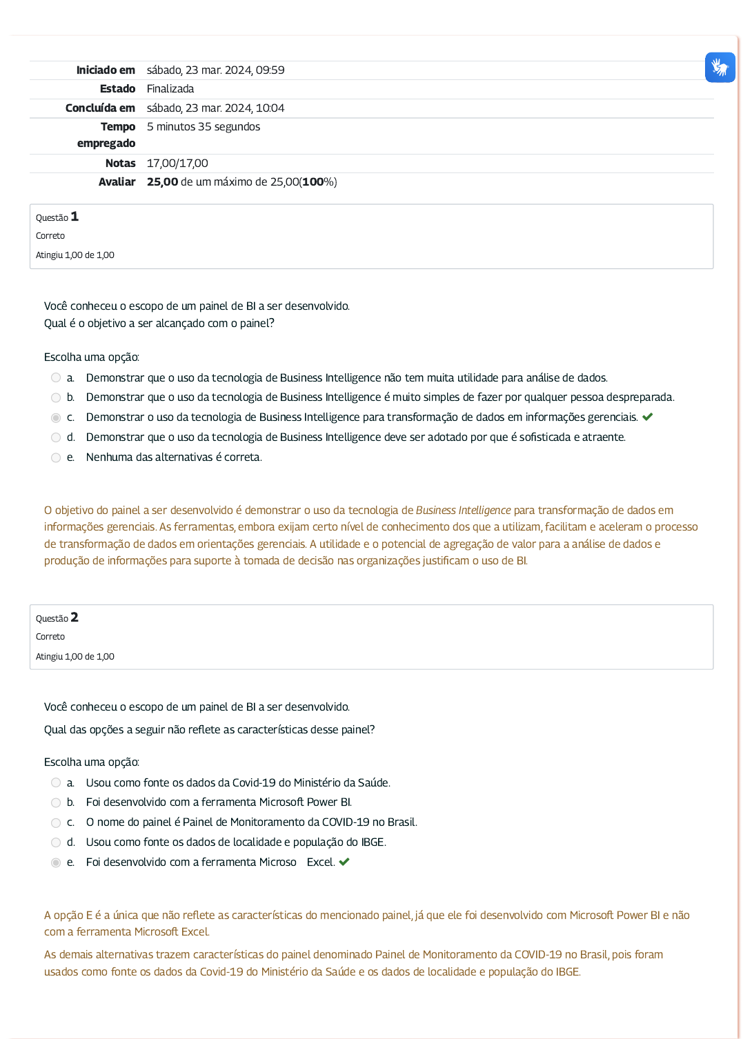 23/03/2024, 10:05 Exercício Avaliativo 4: Revisão da tentativa 1/9 Iniciado em sábado, 23 mar. 2024, 09:59 Estado Finalizada Concluída em sábado, 23 mar. 2024, 10:04 Tempo empregado 5 minutos 35 segundos Notas 17,00/17,00 Avaliar 25,00 de um máximo de 25,00(100%) Questão 1 Correto Atingiu 1,00 de 1,00 Questão 2 Correto Atingiu 1,00 de 1,00 Você conheceu o escopo de um painel de BI a ser desenvolvido. Qual é o objetivo a ser alcançado com o painel? Escolha uma opção: a. Demonstrar que o uso da tecnologia de Business Intelligence não tem muita utilidade para análise de dados. b. Demonstrar que o uso da tecnologia de Business Intelligence é muito simples de fazer por qualquer pessoa despreparada. c. Demonstrar o uso da tecnologia de Business Intelligence para transformação de dados em informações gerenciais. d. Demonstrar que o uso da tecnologia de Business Intelligence deve ser adotado por que é so�sticada e atraente. e. Nenhuma das alternativas é correta. O objetivo do painel a ser desenvolvido é demonstrar o uso da tecnologia de Business Intelligence para transformação de dados em informações gerenciais. As ferramentas, embora exi�am certo nível de conhecimento dos que a utilizam, facilitam e aceleram o processo de transformação de dados em orientações gerenciais. A utilidade e o potencial de agregação de valor para a análise de dados e produção de informações para suporte à tomada de decisão nas organizações justi�cam o uso de BI. Você conheceu o escopo de um painel de BI a ser desenvolvido. Qual das opções a seguir não re�ete as características desse painel? Escolha uma opção: a. Usou como fonte os dados da Covid-19 do Ministério da Saúde. b. Foi desenvolvido com a ferramenta Microso� Power BI. c. O nome do painel é Painel de Monitoramento da COVID-19 no Brasil. d. Usou como fonte os dados de localidade e população do IBGE. e. Foi desenvolvido com a ferramenta Microso Excel. A opção E é a única que não re�ete as características do mencionado painel, já que ele foi desenvolvido com Microso� Power BI e não com a ferramenta Microso� Excel. As demais alternativas trazem características do painel denominado Painel de Monitoramento da COVID-19 no Brasil, pois foram usados como fonte os dados da Covid-19 do Ministério da Saúde e os dados de localidade e população do IBGE. 23/03/2024, 10:05 Exercício Avaliativo 4: Revisão da tentativa 2/9 Questão 3 Correto Atingiu 1,00 de 1,00 Questão 4 Correto Atingiu 1,00 de 1,00 Para o desenvolvimento do Painel de Monitoramento da COVID-19 no Brasil foram escolhidas várias fontes de dados como os dados nacionais sobre a Covid-19, os dados das localidades brasileiras e os dados populacionais do Brasil. Qual o formato em que os dados nacionais sobre a COVID-19 foram disponibilizados para download? Escolha uma opção: a. Formato XLSX b. Formato JSON c. Formato CSV d. Formato XML e. Formato HTML Os dados das localidades brasileiras foram disponibilizados para acesso no formato JSON, por meio do serviço web no endereço: https://servicodados.ibge.gov.br/api/v1/localidades/estados. Os demais formatos (XLSX, CSV, XML e HTML) não foram disponibilizados. Para o desenvolvimento do Painel de Monitoramento da COVID-19 no Brasil foram escolhidas várias fontes de dados: Dados nacionais sobre a COVID-19; Dados das localidades brasileiras; e Dados populacionais do Brasil. Em qual formato os dados das localidades brasileiras foram disponibilizados para acesso? Escolha uma opção: a. Formato XLSX b. Formato JSON c. Formato CSV d. Formato XML e. Formato HTML Os dados das localidades brasileiras foram disponibilizados para acesso no formato JSON por meio de serviço web no endereço https://servicodados.ibge.gov.br/api/v1/localidades/estados. Os demais formatos XLSX, CSV, XML e HTML não foram disponibilizados. https://servicodados.ibge.gov.br/api/v1/localidades/estados https://servicodados.ibge.gov.br/api/v1/localidades/estados 23/03/2024, 10:05 Exercício Avaliativo 4: Revisão da tentativa 3/9 Questão 5 Correto Atingiu 1,00 de 1,00 Questão 6 Correto Atingiu 1,00 de 1,00 A ferramenta de BI escolhida para desenvolvimento do Painel de Monitoramento da COVID-19 no Brasil foi o Microso� Power BI. Escolha opção incorreta sobre a motivação dessa escolha: Escolha uma opção: a. Por ser a ferramenta líder do segmento de Business Intelligence. b. Por haver a possibilidade de uso gratuito, com limitações. c. Pelas limitações não comprometerem o objetivo didático esperado. d. As alternativas A, B e C re�etem a justi�cativa de escolha do Microso� Power BI. e. Apenas a alternativa A está correta. A única opção que contém uma informação incorreta é a opção E. A escolha do Microso� Power Bi se deu por ser a ferramenta líder do segmento de Business Intelligence, por haver a possibilidade de uso gratuito (com limitações) e pelas limitações não comprometerem o objetivo didático esperado. O Power BI é composto por diferentes aplicações. Qual das opções a seguir não é uma aplicação do Power BI? Escolha uma opção: a. Power BI Desktop b. Power Query c. Serviço de Nuvem Power BI d. Power BI Miner e. Aplicativo Móvel Power BI Mobile As principais aplicações que compõem o Power BI são: Power BI Desktop, Power Query, Serviço de Nuvem Power BI e o aplicativo móvel Power BI Mobile. Power BI Miner não existe como componente do Power BI. 23/03/2024, 10:05 Exercício Avaliativo 4: Revisão da tentativa 4/9 Questão 7 Correto Atingiu 1,00 de 1,00 Questão 8 Correto Atingiu 1,00 de 1,00 Depois de escolhidas as fontes de dados e a ferramenta de análise, foram realizadas as operações de acesso, extração, transformação e carga dos dados para o painel. Qual das aplicações que compõem o Power Bi foi utilizada para automatizar essas operações? Escolha uma opção: a. Power BI Desktop b. Power Query c. Serviço de Nuvem Power BI d. Aplicativo móvel 