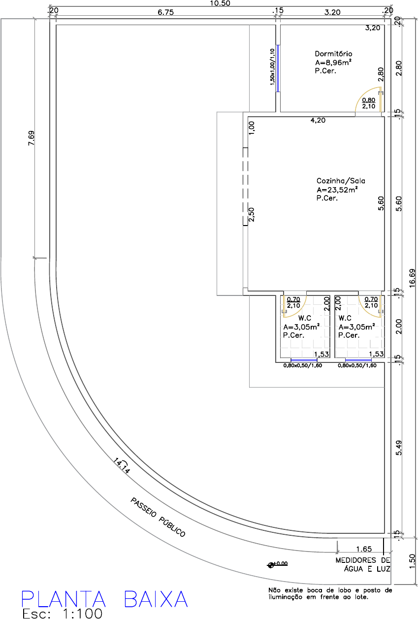 AutoCAD SHX Text PASSEIO PÚBLICO AutoCAD SHX Text MEDIDORES DE ÁGUA E LUZ AutoCAD SHX Text +0.00 AutoCAD SHX Text Não existe boca de lobo e posto de iluminação em frente ao lote. AutoCAD SHX Text 1,50x1,00/1,10 AutoCAD SHX Text 0,80x0,50/1,60 AutoCAD SHX Text 0,80x0,50/1,60 AutoCAD SHX Text Cozinha/Sala A=23,52m² P.Cer. AutoCAD SHX Text Dormitório A=8,96m² P.Cer. AutoCAD SHX Text W.C A=3,05m² P.Cer. AutoCAD SHX Text W.C A=3,05m² P.Cer. AutoCAD SHX Text 0,80 2,10 AutoCAD SHX Text 0,70 2,10 AutoCAD SHX Text 0,70 2,10 AutoCAD SHX Text PLANTA BAIXA AutoCAD SHX Text Esc: 1:100 Sheets and Views Model