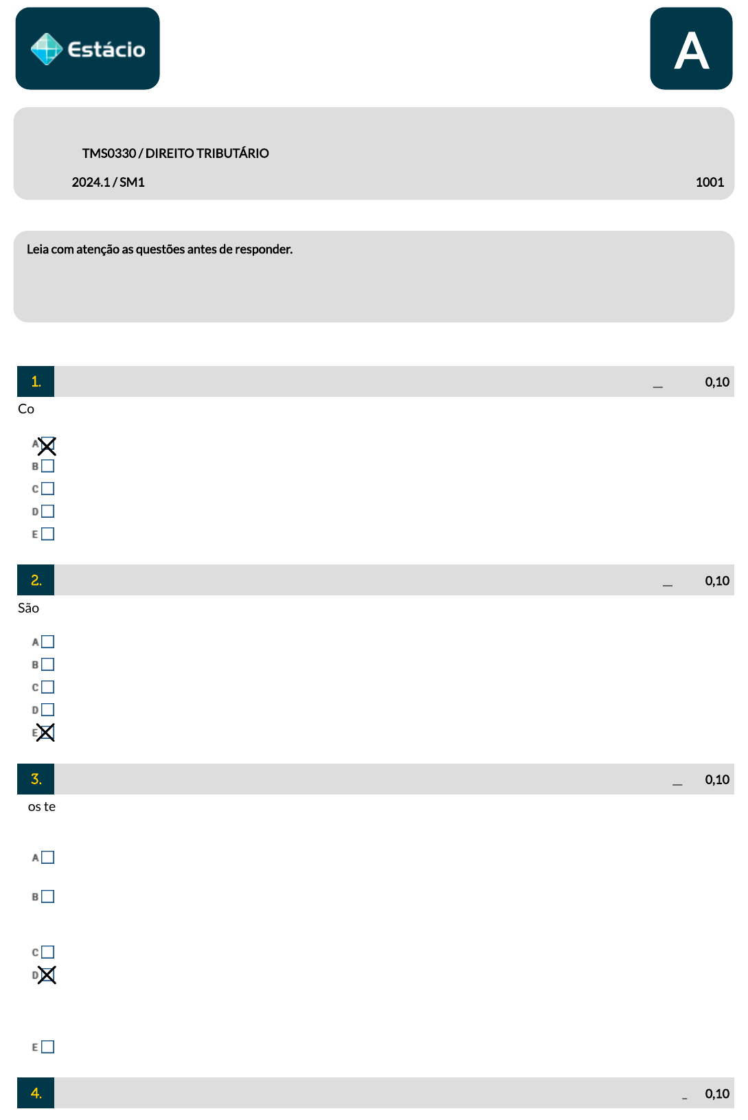 6984195754 A 29/04/2024 18:10 Nome: Disciplina: / DIR O TRIBUTÁRIO Período: 2024.1 / SM1 Matrícula: Data: ___ /___ /______ Turma: 1001 Leia com atenção as questões antes de responder. É proibido o uso de equipamentos eletrônicos portáteis e consulta a materiais de qualquer natureza durante a realização da prova. Boa prova. 1. _______ de 0,10 Constituem princípios constitucionais do direito tributário: Isonomia e anterioridade. Legalidade e e�cácia. Transparência e moralidade. Impessoalidade e retroatividade. Publicidade e seletividade. 2. _______ de 0,10 São princípios do Direito Tributário Princípio Padrão Capacidade CIvil Princípio da Leviaterz Aparência Legalidade 3. _______ de 0,10 Nos termos da Constituição Federal, sem prejuízo de outras garantias asseguradas ao contribuinte, é vedado à União, aos Estados, ao Distrito Federal e aos Municípios, instituir tratamento desigual entre contribuintes que se encontrem em situação equivalente, sendo permitida, contudo, distinção em razão de ocupação pro�ssional ou função por eles exercida. nstituir impostos sobre patrimônio, renda ou serviços dos partidos políticos, exceto suas fundações, das entidades sindicais dos trabalhadores, das instituições de educação e de assistência social, sem �ns lucrativos, atendidos os requisitos da lei. instituir impostos sobre livros, jornais, periódicos, exceto o papel destinado à sua impressão. instituir impostos sobre fonogramas e videofonogramas musicais produzidos no Brasil contendo obras musicais ou literomusicais de autores brasileiros e/ou obras em geral interpretadas por artistas brasileiros bem como os suportes materiais ou arquivos digitais que os contenham, salvo na etapa de replicação industrial de mídias ópticas de leitura a laser. exigir ou aumentar tributo sem lei complementar que o estabeleça. 4. _______ de 0,10 Lucas, menor de oito anos de idade, é proprietário de um imóvel (recebido por herança de seu avô), o qual foi alugado por seus pais, João e Maria, representando-o. Contudo, o Imposto sobre a Propriedade Territorial Urbana (IPTU) referente a este imóvel não está sendo pago pelo locatário, conforme havia sido pactuado no contrato de locação. Em razão do inadimplemento, foi enviada noti�cação de lançamento do crédito tributário em nome de Lucas como devedor do tributo, para seu domicílio tributário, a �m de que pagasse o débito. A noti�cação foi recebida via Correios por seus pais, que residem junto com seu �lho. Os pais, por entenderem que esta obrigação era do locatário, recusam-se a pagar. O Fisco Municipal está agora a cobrar judicialmente o valor da dívida de IPTU. Diante desse cenário e à luz do Código Tributário Nacional, assinale a a�rmativa correta. Por conta do contrato de locação, o locatário é contribuinte do IPTU e único responsável pelo pagamento do referido imposto. Lucas é o contribuinte do IPTU, sendo o locatário o responsável tributário pelo pagamento do mesmo. Lucas, embora absolutamente incapaz, pode �gurar como contribuinte devedor do IPTU, inclusive podendo constar seu nome na noti�cação de lançamento do crédito tributário. Lucas e seus pais são contribuintes do IPTU, mas os bens dos pais devem ser executados antes dos bens de Lucas. Em razão da menoridade de Lucas, apenas seus pais serão considerados contribuintes deste IPTU. 5. _______ de 0,10 João e Maria celebraram entre si contrato de locação, sendo João o locador e proprietário do imóvel. No contrato, eles estipularam que a responsabilidade pelo pagamento do Imposto sobre a Propriedade Predial e Territorial Urbana (IPTU) do imóvel será de Maria, locatária. Com base nessas informações, assinale a a�rmativa correta. O contrato é válido e e�caz, e, por consequência dele, a responsabilidade pelo pagamento do tributo se tornará solidária, podendo o �sco municipal cobrá-lo de João e/ou de Maria. O contrato �rmado entre particulares não poderá se opor ao �sco municipal, no que tange à alteração do sujeito passivo do tributo. Desconsiderar esta alternativa. O contrato será ine�caz entre as partes, pois transferiu a obrigação de pagar o imposto para pessoa não prevista em lei. No caso de o �sco municipal cobrar o tributo de João, ele não poderá ajuizar ação regressiva em face de Maria. 6. _______ de 0,10 O Município Tatodomundoliso, visando aumentar a sua arrecadação, instituiu novo imposto, não previsto na Constituição Federal, através de Lei Complementar. Sobre a hipótese, assinale a a�rmativa correta. .nenhuma das alternativas O Município Tatodomundoliso pode instituir o imposto novo, tendo em vista que a competência residual para a instituição de novos impostos é comum. É vedada aos Estados, ao Distrito Federal e aos Municípios, a instituição de impostos não previstos na Constituição Federal. Para exercer a competência residual do Município Tatodomundoliso, é necessária lei de iniciativa do Governador do Estado. Tendo em vista que foi instituído mediante Lei Complementar, o Município exerceu corretamente sua competência 7. _______ de 0,10 Em Direito Tributário, pode-se perceber, pelo menos, 4 teorias acerca das espécies de tributos existentes no Brasil. De acordo com a teoria adotada pelo Supremo Tribunal Federal, são considerados tributos: Impostos, taxas, empréstimos compulsórios e contribuições. Impostos, taxas e contribuições de melhoria. Impostos, taxas e empréstimos compulsórios. Impostos e taxas. Impostos, taxas, contribuições de melhoria, empréstimos compulsórios e contribuições especiais. Campus: VIA BRASIL - IRAJÁ Prova Impressa em 29/04/2024 por FREDERICO JACINTO CARDOSO GAZOLLA Ref.: 6984195754 Prova Montada em 11/04/2024 8. _______ de 0,10 Assinale a opção INCORRETA: O Imposto sobre produtos industrializados (IPI) é um imposto federal. O Imposto sobre a propriedade de veículos automo