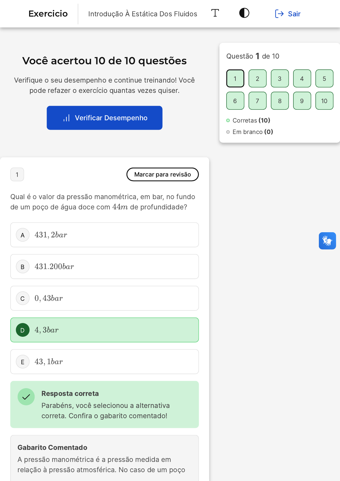 Você acertou 10 de 10 questões Verifique o seu desempenho e continue treinando! Você pode refazer o exercício quantas vezes quiser. Verificar Desempenho A B C D E 1 Marcar para revisão Qual é o valor da pressão manométrica, em bar, no fundo de um poço de água doce com de profundidade?44m 431, 2bar 431.200bar 0, 43bar 4, 3bar 43, 1bar Resposta correta Parabéns, você selecionou a alternativa correta. Confira o gabarito comentado! Gabarito Comentado A pressão manométrica é a pressão medida em relação à pressão atmosférica. No caso de um poço Questão 1 de 10 Corretas �10� Em branco �0� 1 2 3 4 5 6 7 8 9 10 Exercicio Introdução À Estática Dos Fluidos Sair A B C D E de água doce, a pressão manométrica no fundo do poço é determinada pela profundidade do poço e pela densidade da água. A pressão aumenta com a profundidade devido ao peso da água acima. Para um poço de de profundidade, a pressão manométrica é de . Portanto, a alternativa correta é a D. 44m 4, 3bar 2 Marcar para revisão Na produção de petróleo obtido do pré-sal, é comum a instalação de equipamentos em profundidades de . Considerando que a massa específica da água do mar é , calcule a pressão absoluta que esses equipamentos devem suportar: 2000m ρ = 1025kg/m3 20, 11MPa 101, 3kPa 20, 21MPa 2, 15MPa 2, 05MPa Resposta correta Parabéns, você selecionou a alternativa correta. Confira o gabarito comentado! Gabarito Comentado A pressão absoluta que os equipamentos devem suportar é calculada considerando a profundidade em que estão instalados e a massa específica da água do mar. A pressão é dada pela fórmula P � ρgh, A B C D E onde ρ é a massa específica da água, g é a aceleração da gravidade e h é a altura (ou profundidade). Substituindo os valores na fórmula, obtemos a pressão em Pascal (Pa). Para converter para Mega Pascal (MPa), dividimos o resultado por 1.000.000. Assim, a pressão absoluta que os equipamentos devem suportar é de , correspondendo à alternativa C. 20, 21MPa 3 Marcar para revisão Cada unidade, seja ela para densidade, pressão, viscosidade ou valores adimensionais, tem um papel crucial na precisão e clareza dos cálculos e análises técnicas em ciência e engenharia. Qual é a unidade de densidade? kg/m3 kN/m2 Pa Pa.s Adimensional Resposta correta Parabéns, você selecionou a alternativa correta. Confira o gabarito comentado! Gabarito Comentado A B C D E A unidade de densidade é tipicamente expressa em quilogramas por metro cúbico kg/m . Isso representa a massa de substância por unidade de volume. 3 4 Marcar para revisão Entre os corpos da Figura a seguir, qual corresponde a uma situação estável, instável e indiferente, respectivamente? A, B e C B, C e A C, A e B C, B e A A, C e B Resposta correta Parabéns, você selecionou a alternativa correta. Confira o gabarito comentado! Gabarito Comentado A resposta correta é: A, C e B A B C D E 5 Marcar para revisão Um construtor de aviões deseja construir um modelo de um avião real na razão para realizar testes em um túnel de vento. O avião real voa a , enquanto a velocidade do ar, no túnel de vento em que se encontra o modelo, é dada por . Dados: Viscosidade do ar Densidade do ar As performances dos dois serão equivalentes para um valor de , em , igual a: 7 : 1 111, 6km/h V η = 1, 8x10−5kg/(m. s) ρ = 1, 3kg/m3 V m/s 217 31 4,4 15,9 781,2 Resposta correta Parabéns, você selecionou a alternativa correta. Confira o gabarito comentado! Gabarito Comentado A B C D E Para que as performances do avião real e do modelo sejam equivalentes, a velocidade do ar no túnel de vento �V� deve ser tal que as forças de arrasto e sustentação sejam proporcionais nos dois casos. Considerando a razão de escala entre o avião real e o modelo, bem como a viscosidade e a densidade do ar fornecidas, a velocidade do ar no túnel de vento que torna as performances equivalentes é de 217 m/s. Portanto, a alternativa correta é a A. 6 Marcar para revisão Para avaliar o projeto de um navio de 100m de comprimento, cuja velocidade de cruzeiro será de 12m/s, um modelo com 4,0m será testado em laboratório. Qual deve ser a velocidade do modelo para que haja semelhança completa? 0,48m/s 2,4m/s 5,4m/s 12m/s 1m/s Resposta correta Parabéns, você selecionou a alternativa correta. Confira o gabarito comentado! Gabarito Comentado Para que haja semelhança completa entre o navio e o modelo, a velocidade do modelo deve ser A B C D E proporcional à velocidade do navio. Como o modelo é 25 vezes menor que o navio �100m/4m � 25�, a velocidade do modelo deve ser 25 vezes menor que a velocidade do navio. Portanto, a velocidade do modelo deve ser 12m/s dividido por 25, o que resulta em 2,4m/s. Logo, a alternativa correta é a B� 2,4m/s. 7 Marcar para revisão Qual é o adimensional utilizado tanto para análise de escoamento em canais quanto ao redor de cascos de navios? Froude Euler Coeficiente de arrasto Mach Biot Resposta correta Parabéns, você selecionou a alternativa correta. Confira o gabarito comentado! Gabarito Comentado O número adimensional Froude é utilizado tanto para análise de escoamento em canais quanto ao redor de cascos de navios. Ele é definido como a razão entre a força inercial e a força gravitacional. Este número é muito importante na análise de escoamentos onde a gravidade tem um papel significativo, como é o caso A B C D E do escoamento em canais e ao redor de cascos de navios. 8 Marcar para revisão Qual das situações a seguir poderia ser mais bem representada por uma descrição lagrangiana? Transporte de água em uma adutora. Saída de grãos de soja pelo orifício inferior de um silo. Escoamento de petróleo em dutos submarinos. Coleta de esgoto em redes urbanas. Drenagem de águas pluviais em grandes galerias. Resposta correta Parabéns, você selecionou a alternativa correta. Confira o gabarito comentado! Gabarito Comentado A descrição lagrangiana
