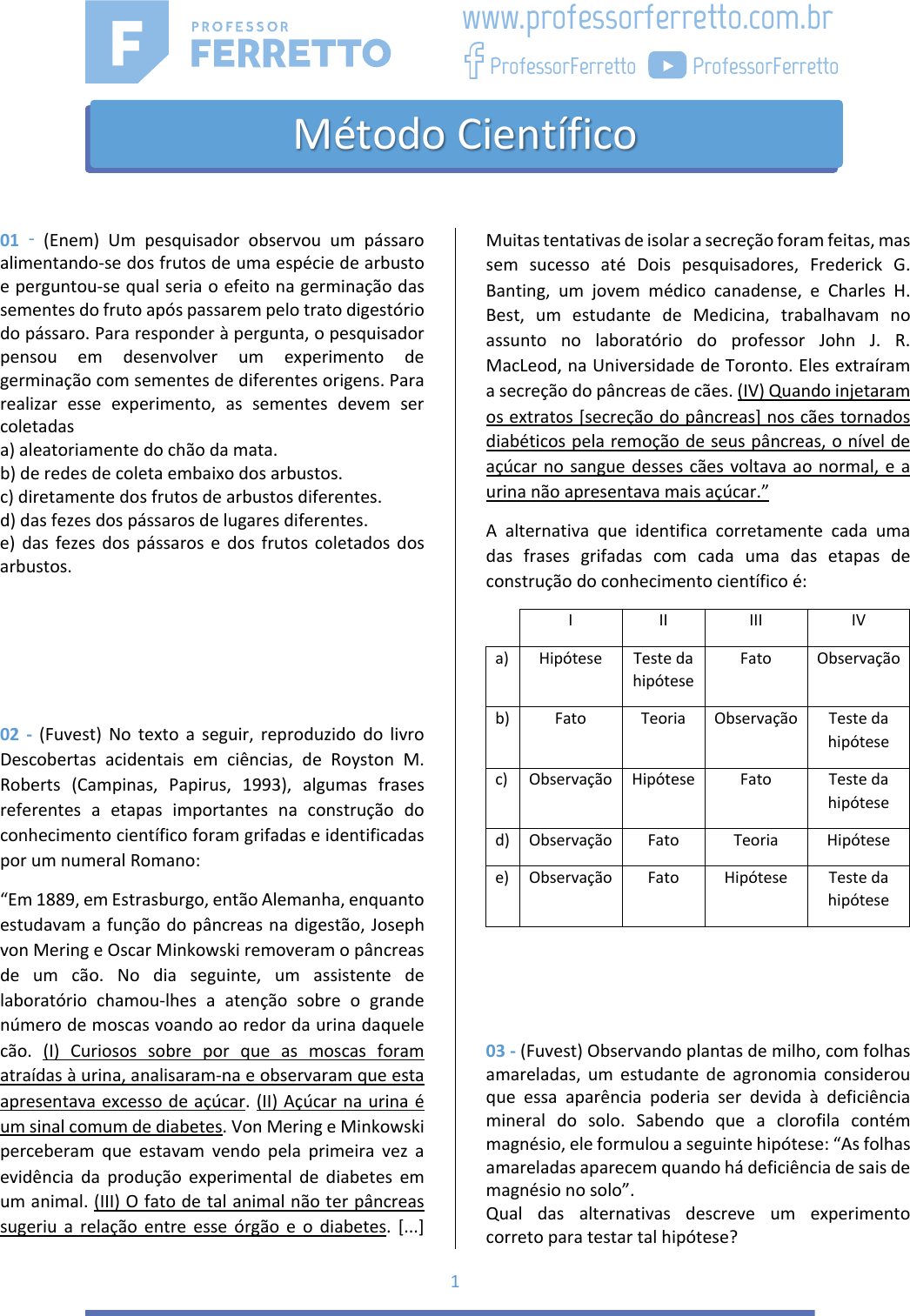1 01 - (Enem) Um pesquisador observou um pássaro alimentando-se dos frutos de uma espécie de arbusto e perguntou-se qual seria o efeito na germinação das sementes do fruto após passarem pelo trato digestório do pássaro. Para responder à pergunta, o pesquisador pensou em desenvolver um experimento de germinação com sementes de diferentes origens. Para realizar esse experimento, as sementes devem ser coletadas a) aleatoriamente do chão da mata. b) de redes de coleta embaixo dos arbustos. c) diretamente dos frutos de arbustos diferentes. d) das fezes dos pássaros de lugares diferentes. e) das fezes dos pássaros e dos frutos coletados dos arbustos. 02 - (Fuvest) No texto a seguir, reproduzido do livro Descobertas acidentais em ciências, de Royston M. Roberts (Campinas, Papirus, 1993), algumas frases referentes a etapas importantes na construção do conhecimento científico foram grifadas e identificadas por um numeral Romano: “Em 1889, em Estrasburgo, então Alemanha, enquanto estudavam a função do pâncreas na digestão, Joseph von Mering e Oscar Minkowski removeram o pâncreas de um cão. No dia seguinte, um assistente de laboratório chamou-lhes a atenção sobre o grande número de moscas voando ao redor da urina daquele cão. (I) Curiosos sobre por que as moscas foram atraídas à urina, analisaram-na e observaram que esta apresentava excesso de açúcar. (II) Açúcar na urina é um sinal comum de diabetes. Von Mering e Minkowski perceberam que estavam vendo pela primeira vez a evidência da produção experimental de diabetes em um animal. (III) O fato de tal animal não ter pâncreas sugeriu a relação entre esse órgão e o diabetes. [...] Muitas tentativas de isolar a secreção foram feitas, mas sem sucesso até Dois pesquisadores, Frederick G. Banting, um jovem médico canadense, e Charles H. Best, um estudante de Medicina, trabalhavam no assunto no laboratório do professor John J. R. MacLeod, na Universidade de Toronto. Eles extraíram a secreção do pâncreas de cães. (IV) Quando injetaram os extratos [secreção do pâncreas] nos cães tornados diabéticos pela remoção de seus pâncreas, o nível de açúcar no sangue desses cães voltava ao normal, e a urina não apresentava mais açúcar.” A alternativa que identifica corretamente cada uma das frases grifadas com cada uma das etapas de construção do conhecimento científico é: I II III IV a) Hipótese Teste da hipótese Fato Observação b) Fato Teoria Observação Teste da hipótese c) Observação Hipótese Fato Teste da hipótese d) Observação Fato Teoria Hipótese e) Observação Fato Hipótese Teste da hipótese 03 - (Fuvest) Observando plantas de milho, com folhas amareladas, um estudante de agronomia considerou que essa aparência poderia ser devida à deficiência mineral do solo. Sabendo que a clorofila contém magnésio, ele formulou a seguinte hipótese: “As folhas amareladas aparecem quando há deficiência de sais de magnésio no solo”. Qual das alternativas descreve um experimento correto para testar tal hipótese? www.professorferretto.com.br ProfessorFerretto ProfessorFerretto Método Científico 2 a) Fornecimento de sais de magnésio ao solo em que as plantas estão crescendo e observação dos resultados alguns dias depois. b) Fornecimento de uma mistura de diversos sais minerais, inclusive sais de magnésio, ao solo em que as plantas estão crescendo e observação dos resultados dias depois. c) Cultivo de um novo lote de plantas, em solo suplementado com uma mistura completa de sais minerais, incluindo sais de magnésio. d) Cultivo de novos lotes de plantas, fornecendo à metade deles, mistura completa de sais minerais, inclusive sais de magnésio, e à outra metade, apenas sais de magnésio. e) Cultivo de novos lotes de plantas, fornecendo à metade deles mistura completa de sais minerais, inclusive sais de magnésio, e à outra metade, uma mistura com os mesmos sais, menos os de magnésio. 04 - (Fuvest) O tema “teoria da evolução” tem provocado debates em certos locais dos Estados Unidos da América, com algumas entidades contestando seu ensino nas escolas. Nos últimos tempos, a polêmica está centrada no termo teoria, que, no entanto, tem significado bem definido para os cientistas. Sob o ponto de vista da ciência, teoria é a) sinônimo de lei científica, que descreve regularidades de fenômenos naturais, mas não permite fazer previsões sobre eles. b) sinônimo de hipótese, ou seja, uma suposição, ainda sem comprovação experimental. c) uma idéia sem base em observação e experimentação, que usa o senso comum para explicar fatos do cotidiano. d) uma idéia, apoiada pelo conhecimento científico, que tenta explicar fenômenos naturais relacionados, permitindo fazer previsões sobre eles. e) uma idéia, apoiada pelo conhecimento científico, que, de tão comprovada pelos cientistas, já é considerada uma verdade incontestável. 05 - (Uerj) Certa vez uma criança se perdeu. Como fazia frio, decidiu procurar material para atear fogo. À medida que ia trazendo objetos para sua fogueira, observava que alguns queimavam e outros não. Começou, então, a fazer a lista abaixo, relacionando os que queimavam e os que não queimavam. Depois de algumas viagens, sua classificação continha as seguintes informações: A partir dessa lista, ela tentou encontrar uma regularidade que a guiasse na procura de novos materiais combustíveis, chegando à seguinte conclusão: “Todos os objetos cilíndricos queimam”. Adaptado de Chemical Educational Material Study (Org.). Química: uma ciência experimental. São Paulo: EDART, 1976. Quanto ao método científico, o procedimento e o tipo de raciocínio utilizados pela criança, em sua conclusão, são exemplos, respectivamente, de: a) formulação de lei; dedutivo. b) criação de modelo; dedutivo. c) proposição de teoria; indutivo. d) elaboração de hipótese; indutivo 06 - (Uerj) A tabela de Mendeleiev, ao ser 