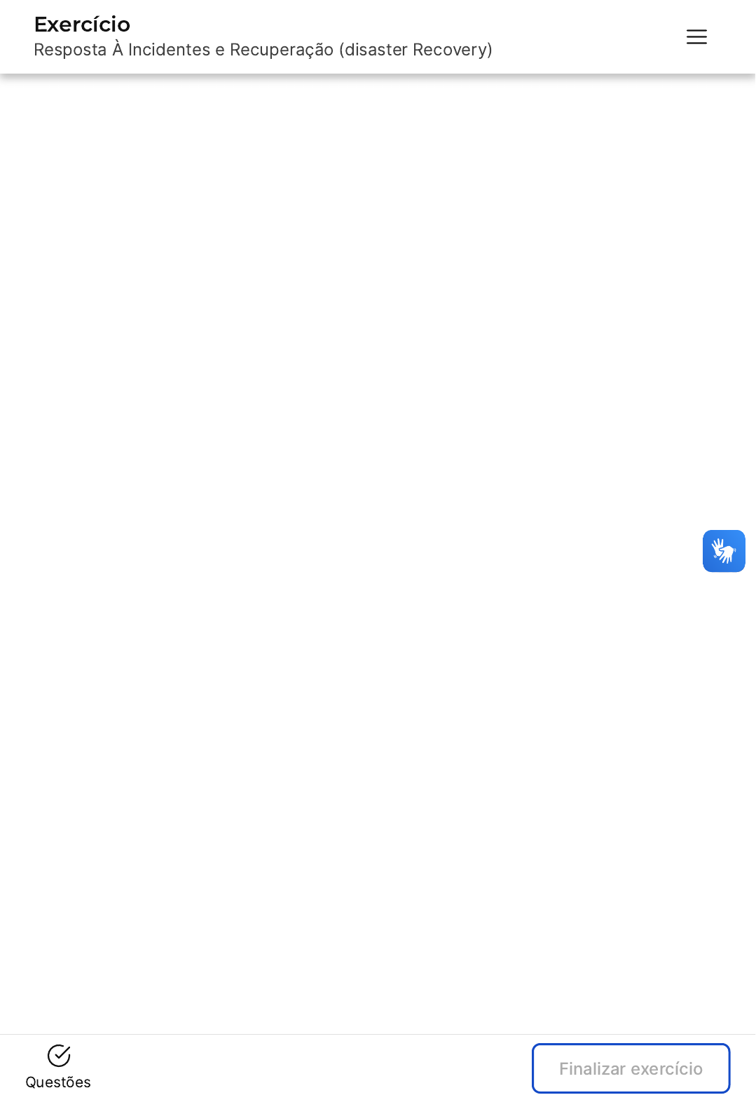 Questões Finalizar exercício Exercício Resposta À Incidentes e Recuperação (disaster Recovery) Aqui estão as informações chave do documento que você está visualizando: Fontes de Dados: O documento menciona fontes de dados que podem ser capturadas por uma cópia bit-a-bit, como Dados Voláteis e Slack Space, que não são capturados por backups lógicos1. Processo Forense: Destaca a importância da Cadeia de Custódia no processo de coleta, análise e preservação de evidências em investigações forenses2. Resposta a Incidentes: Descreve etapas críticas na resposta a incidentes de segurança cibernética, enfatizando a Identificação como a primeira etapa a ser concluída após um aumento de relatos de malware. Recuperação de Desastres: Discute um cenário de desastre na empresa XPTO, onde o Objetivo de Tempo de Recuperação (RTO) e o Objetivo de Tempo de Inatividade Máximo Tolerável (MTD) são cruciais para a recuperação de uma loja online após um erro grave de manutenção. Sair A B C D E A B 1 Marcar para revisão Quais fontes de dados podem ser capturadas por meio de uma cópia bit-a-bit que um backup lógico não pode capturar? �Escolha duas) I � Dados voláteis II � Slack Space III � Espaço Livre IV � Evidência I e II I e III II e IV II e III III e IV 2 Marcar para revisão Um investigador forense precisa seguir um processo apropriado para a coleta, análise e preservação de evidências. Qual dos termos a seguir representa o processo que ele precisa seguir? Tratamento de incidentes Retenção legal Highlight C D E A B C D E Ordem de volatilidade Backup Cadeia de custódia 3 Marcar para revisão Você recebe uma ligação do gerente de suporte técnico informando que houve um aumento nas ligações de usuários relatando que seus computadores estão infectados com malware. Qual das seguintes etapas de resposta a incidentes deve ser concluída primeiro? Identificação Pós-Incidente Erradicação Backup Contenção 4 Marcar para revisão A maior fonte de renda da empresa XPTO é sua loja online. A loja é hospedada por diversos servidores distribuídos no mundo todo, e atende a milhões de clientes em diversos países. Na segunda-feira às 9�00 h, durante uma manutenção, um administrador executa uma rotina para limpar os hard drives de 3 servidores para que eles pudessem ser atualizados com as novas imagens A B C D E de 3 servidores para que eles pudessem ser atualizados com as novas imagens do sistema. O administrador, no entanto, digitou errado os comandos e apagou de forma incorreta todos os dados em discos. Isso derrubou a loja para todos os clientes mundialmente. Fatos adicionais importantes sobre o evento incluem: Os últimos backups dos servidores da loja foram realizados no Domingo anterior às 21�00h. A organização determinou previamente que uma perda de dados de transação se estendendo por mais de 6 horas poderia impactar seriamente o processo de venda e levar milhares de clientes insatisfeitos a requerer reembolsos. Todos os servidores requerem uma reinicialização completa para completarem o processo de restauração de backups antes que eles retornem à produção. A equipe de disaster recovery revisa o dano e conclui que esse processo levará uma média de 8 horas para cada servidor. No geral, a XPTO acredita que pode recuperar a loja online completamente em aproximadamente 2 dias. Uma avaliação anterior apontou que a XPTO não pode continuar sem a loja online por mais de 3 dias. Dado o cenário, responda qual é o objetivo do tempo de recuperação �RTO� da XPTO para esse evento? 4 dias 6 horas 3 dias 8 horas 2 dias 5 Marcar para revisão Um administrador de segurança descobriu um incidente de malware na rede da organização. Qual das seguintes etapas do processo de resposta ao incidente A B C D E organização. Qual das seguintes etapas do processo de resposta ao incidente ele deve executar? Varredura Recuperação Erradicação Contenção Identificação 6 Marcar para revisão A maior fonte de renda da empresa XPTO é sua loja online. A loja é hospedada por diversos servidores distribuídos no mundo todo e atende a milhões de clientes em diversos países. Na segunda-feira às 9�00 h, durante uma manutenção, um administrador executa uma rotina para limpar os hard drives de 3 servidores para que eles pudessem ser atualizados com as novas imagens do sistema. O administrador, no entanto, digitou errado os comandos e apagou de forma incorreta todos os dados em discos. Isso derrubou a loja para todos os clientes mundialmente. Fatos adicionais importantes sobre o evento incluem: Os últimos backups dos servidores da loja foram realizados no domingo anterior às 21�00h. A organização determinou previamente que uma perda de dados de transação se estendendo por mais de 6 horas poderia impactar seriamente o processo de venda e levar milhares de clientes insatisfeitos a requererem reembolsos. Todos os servidores requerem uma reinicialização completa para completarem o processo de restauração de backups antes que eles retornem à produção. A equipe de disaster recovery revisa o dano e conclui que esse processo levará uma média de 8 horas para cada servidor. No geral, a XPTO acredita que pode recuperar a loja online completamente em aproximadamente 2 dias. Highlight A B C D E A B C D Uma avaliação anterior apontou que a XPTO não pode continuar sem a loja online por mais de 3 dias. Dado o cenário, responda qual é o objetivo do tempo de inatividade máximo tolerável �MTD� da XPTO para esse incidente? 4 dias 2 dias 6 horas 8 horas 3 dias 7 Marcar para revisão Quais são as informações que os MAC Times podem fornecer? �Escolha três) I � Data/hora de Modificação II � Data/hora de Acesso III � Data/hora de Construção IV � Data/hora de Criação V � Data/hora de Arquivamento I, II e III II, IV e V III, IV e V I, II e IV D) I,II e IV Informações dos MAC Times: As informações que