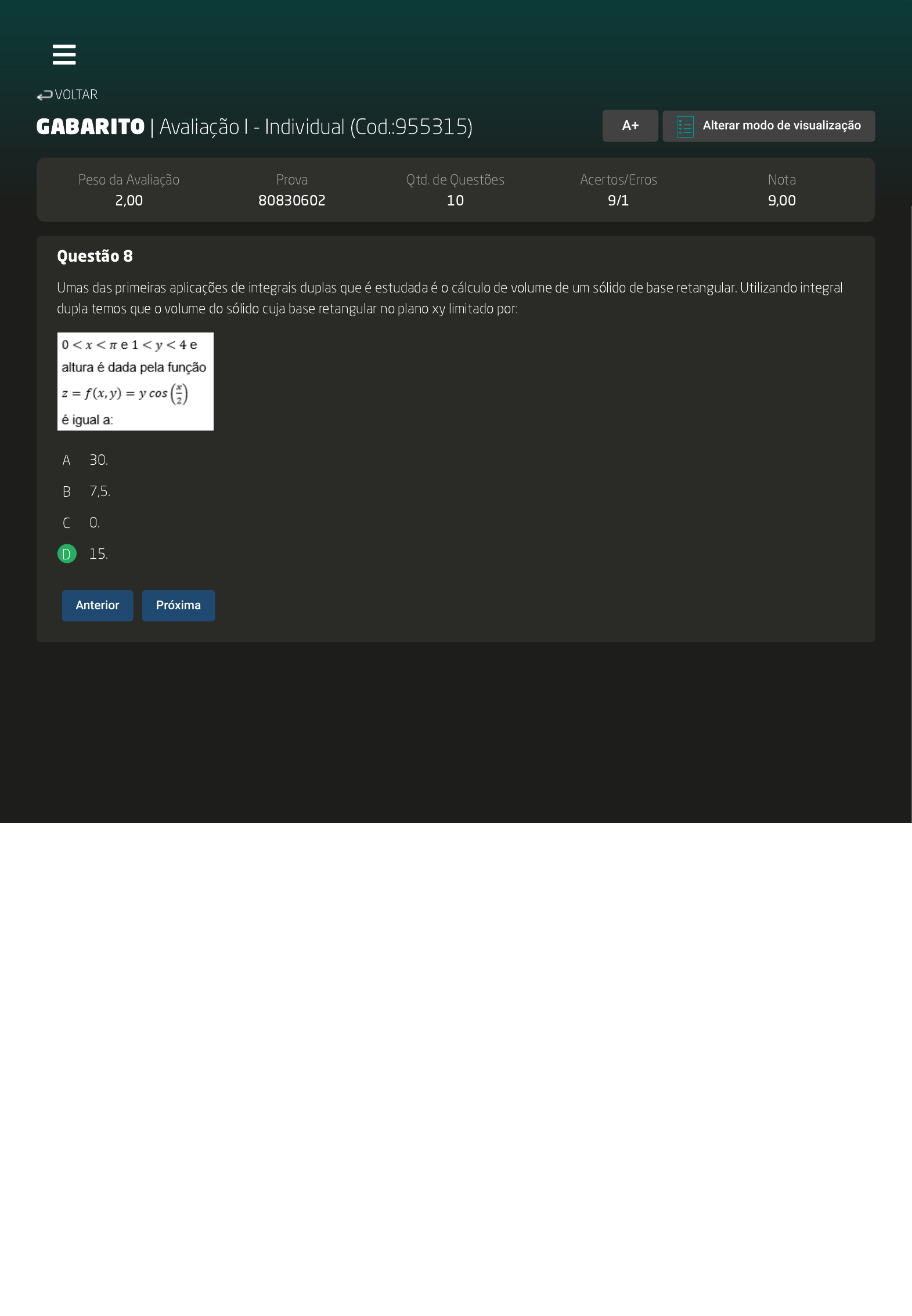 GABARITO | Avaliação I - Individual (Cod.:955315) Peso da Avaliação 2,00 Prova 80830602 Qtd. de Questões 10 Acertos/Erros 9/1 Nota 9,00 Questão 8 Umas das primeiras aplicações de integrais duplas que é estudada é o cálculo de volume de um sólido de base retangular. Utilizando integral dupla temos que o volume do sólido cuja base retangular no plano xy limitado por: A 30. B 7,5. C 0. D 15. VOLTAR A+ Alterar modo de visualização Anterior Próxima